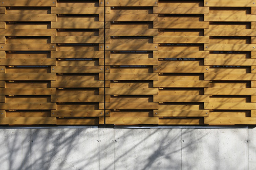 The appearance of the building is based on two materials: the concrete base and the wooden lamella system above. (architects' text)