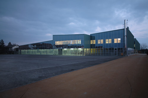 Das Volumen der Turnhalle wird wegen der Inhalte, die sich auf der Kellerebene befinden, im Gesamtbild der Schule bewusst unbetont gelassen. Der Zugang zur Schule in Form einer Rennbahn bildet eine Einheit mit dem Schuleingang, der mit Holzbrettern belegt ist. Organisatorisch ist der Bau in zwei Achsen aufgestellt – einem Flügel mit Klassenräumen, die sich rhythmisch mit Freiräumen, sogenannten Patios, abwechseln, und sich beidseitig, am Hof und am Bach, orientieren, wobei der Klassentrakt von beiden Seiten aus mit natürlichem Licht beleuchtet wird. Den anderen Flügel bildet die oben genannte Turnhalle mit Gemeinschaftsräumen, die sich an den Turnbereich anschließen. Der Schnittpunkt beider Flügel bildet den zentralen Eingangsbereich mit einem Mehrzweckraum, der visuell interaktiv mit anderen Gemeinschaftsräumen der Schule, wie etwa dem Speiseraum, der Bibliothek und der zweiteiligen Turnhalle, verbunden ist.