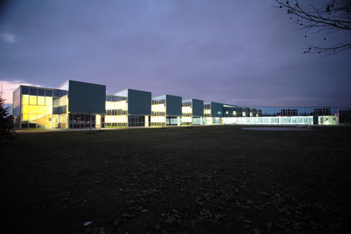 Die in einander zusammenfliessenden Dachflächen prägen das Erscheinungsbild der Schule. Die sich abwechselnden Klassenräume, als Pavillons rhythmisch aufgestellt, übernehmen in der Fassade örtlich den Dachbelag aus Kalzipmetallbahnen auf, und formieren den ganzen Korpus zusätzlich mit einem 40 cm breiten Modul. Die verglasten Flächen aus Reflexglas haben nebst der Funktion als Sonnenschutz auch die Funktion der visuellen Erweiterung der geplanten Grünfläche, womit das Gesamtvolumen entmaterialisiert wird.