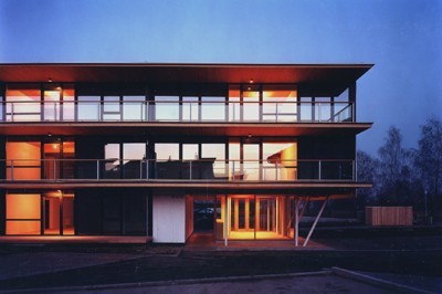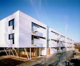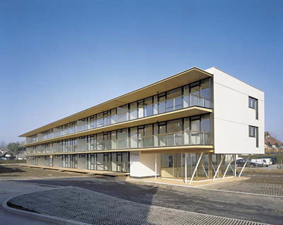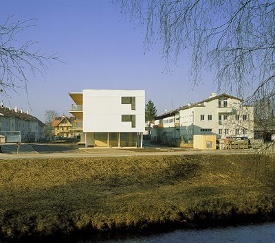 Nähert man sich dem Gebäude von Osten, überrascht die für einen Holzbau klare grafische Sprache. Die vertikale Fichtenschalung wurde mit einem weißen Anstrich veredelt. Zusammen mit der dunklen Lasur der Fensterrahmen, den gläsernen Balkonbrüstungen und den verglasten Stiegenhäusern entsteht eine sehr nobel wirkende Fassade. Das als Niedrigenergiehaus ausgeführte Gebäude wurde weitgehend in Holzständerbauweise errichtet. Bei den Stiegenhäusern entschloß man sich jedoch für Betonfertigteile, um die im Holzbau nur mit unangemessen hohem Aufwand herstellbare, geforderte Brandschutzklasse F 90 zu erreichen.