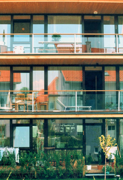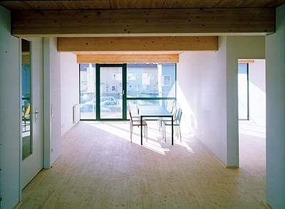 Nach Süd-Westen sind die Wohnungen über die gesamte Breite verglast. Die Holzstapeldecken werden als filigran wirkende Balkonplatten nach außen weitergeführt. Die Glasbrüstung mit Holzhandlauf, der rutschfeste Lärchenholzboden mit Wellenschliff und der Sichtschutz aus satiniertem Glas machen den geräumigen Balkon zu einem wertvollen privaten Raum im Freien. Der Holzbaucharakter tritt im Inneren durch die Holzböden und -decken stärker zutage als am sehr elegant wirkenden Äußeren. Die Anlage birgt 17 Wohnungen mit zwei Wohnungstypen à 60 und 85 m².