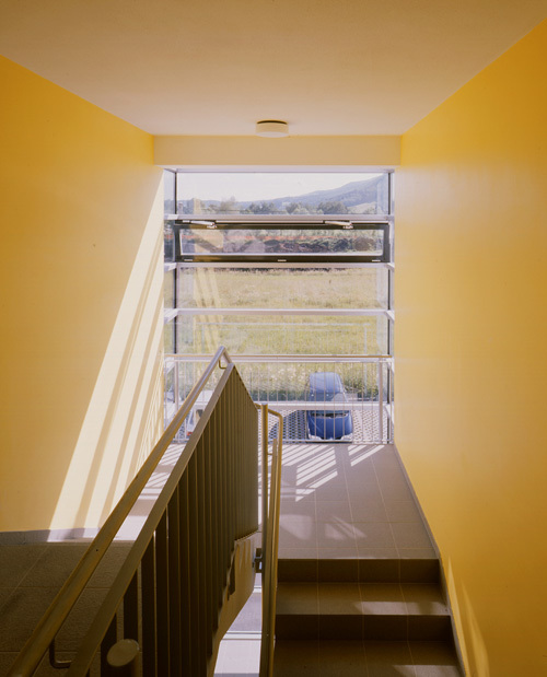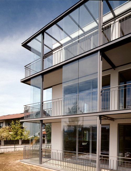 Die Lage an einer stark befahrenen Gewerbeaufschließungsstraße veranlasste die Architekten, die breiten Balkonzonen mit Lärmschutz auszustatten. Die 3-geschossige Verglasung mit offenen Fugen erzeugt eine neue Außenraumqualität. Einerseits wird der Balkon als offener Freisitz erhalten, andererseits bietet diese Ausführung aber auch Wetter- und Schallschutz, ohne die bauphysikalischen Schwierigkeiten eines geschlossenen unbeheizten Wintergartens mit Überhitzung und Kondensatbildung hervorzurufen. Trotz der Fugen entsteht hier eine thermisch ausgezeichnete Pufferzone und Energiefalle. Zusammen mit der kompakten Bauweise, guten Wärmedämmung, hochwärmedämmenden Fenstern und aktiver Solaranlage ist ein optimiertes Energiekonzept verwirklicht.