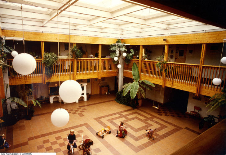 Um zwei typische Gemeinschaftsatrien, die Dächer mit elektrisch verschiebbaren Plexiglaskuppeln besitzen, sind je acht Wohneinheiten, angeordnet. Aufgrund baulicher Mängel mussten die beiden Hausgruppen saniert werden. Während sie in der Struktur intakt sind, entsprechen sie nur mehr teilweise dem ursprünglichen Erscheinungsbild. Architekturführer: Roman Höllbacher