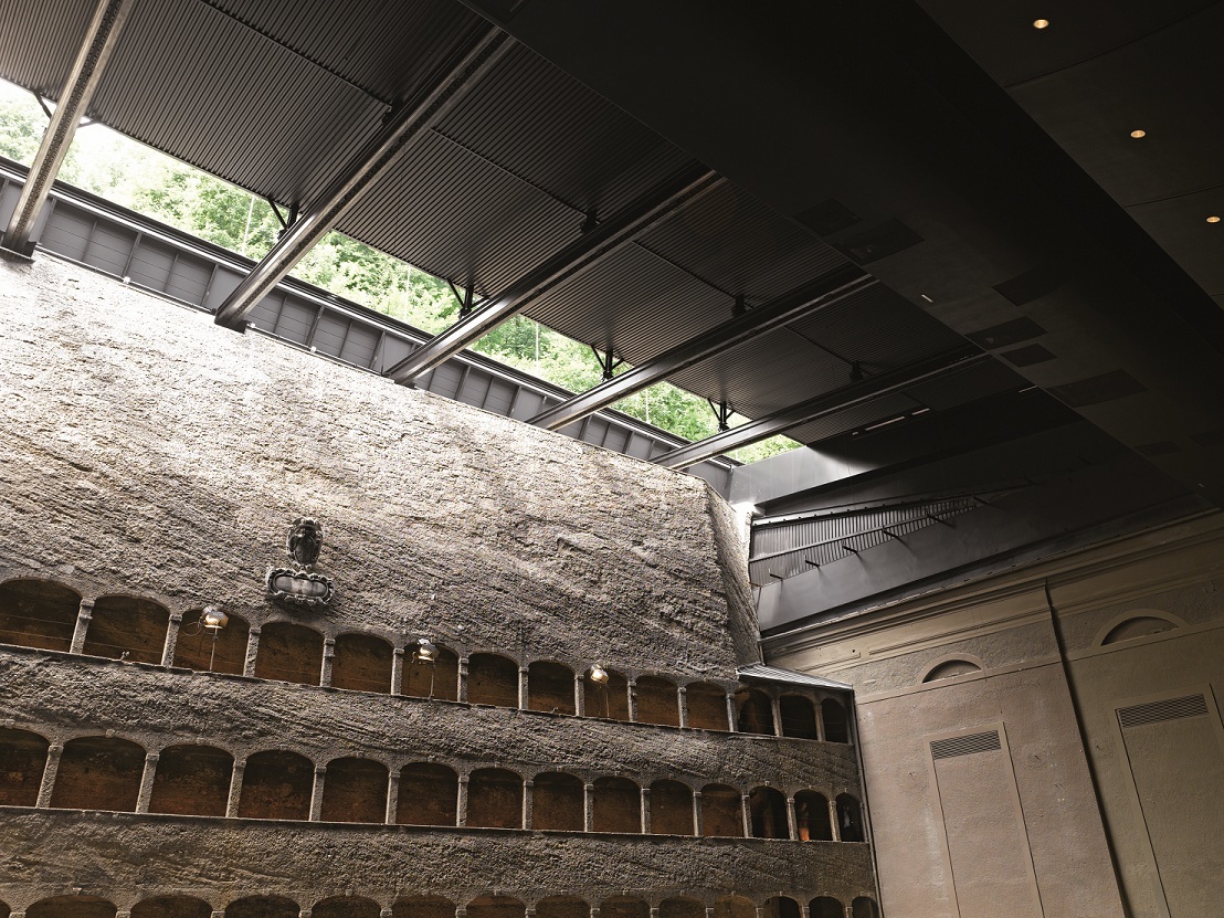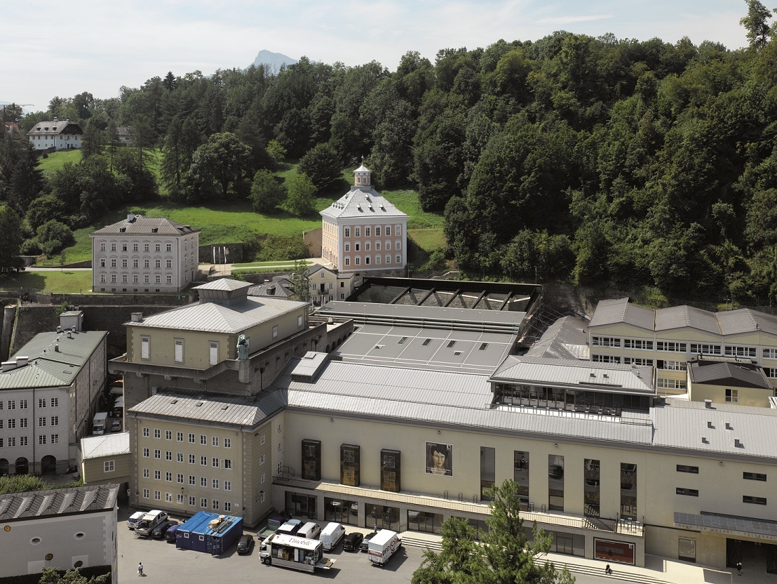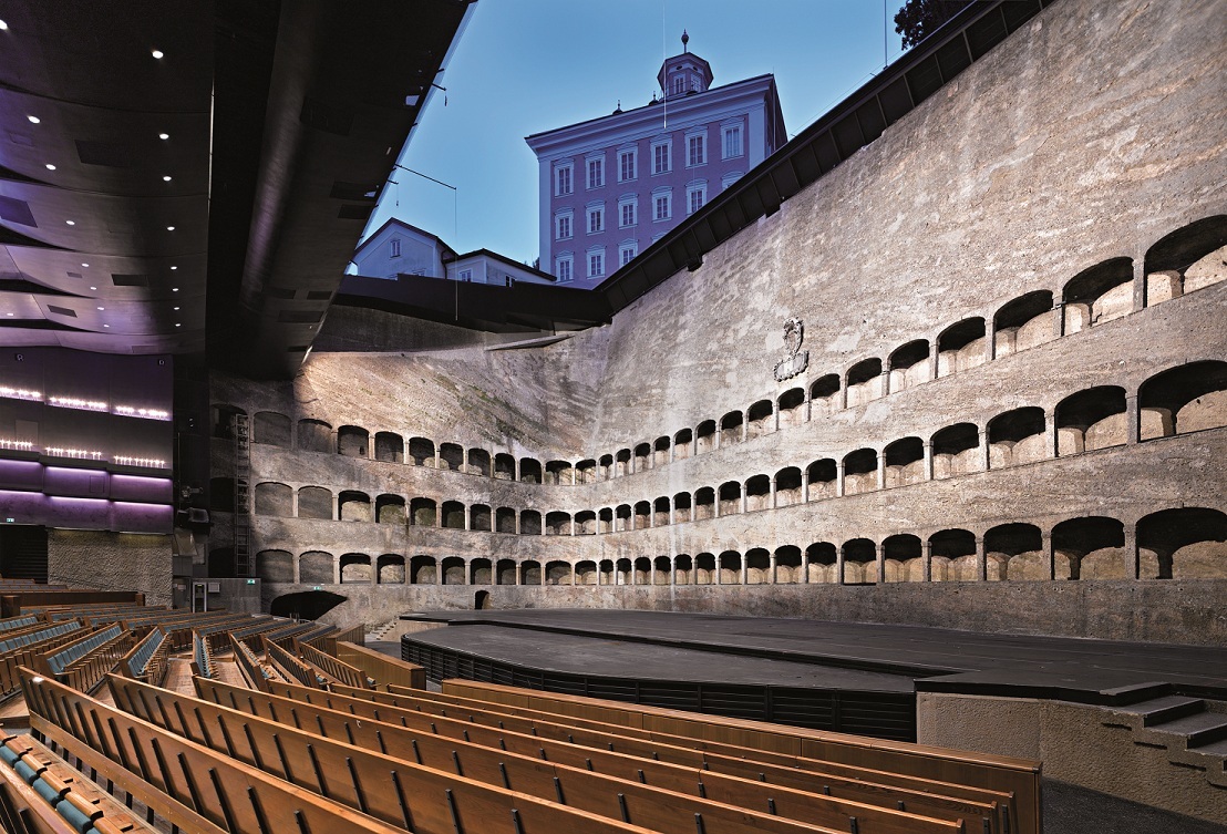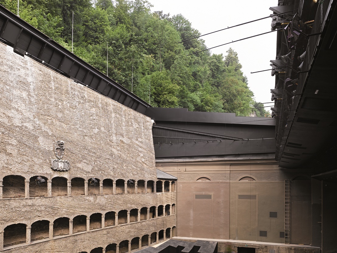 Das mobile Dach und die innenräumliche Neugestaltung der Felsenreitschule durch das Architekturbüro HALLE 1 sind eine rundum gelungene Bereicherung dieser historischen Spielstätte, die als Aufführungsort der Salzburger Festspiele von Clemens Holzmeister adaptiert wurde. Der Kontrast Alt vs. Neu, der sich dem Besucher in der gegensätzlichen Materialität (natürliche Rauheit der Felswand vs. glatte, aber raffiniert geschuppte Akustikelemente an der Decke und den Wänden des Zuschauerraumes) und in der Dualität der Farbgebung (natürliches Grau des Felsen vs. schwarze Oberfläche der neuen Elemente) zeigt, verleiht dem gesamten Raum eine elegante und vornehm-feierliche Atmosphäre.Die wohlüberlegte Detailierung und Ausführung der neuen Bauteile und Oberflächen (inklusive der mobilen Dachkonstruktion) stehen in keinerlei Konkurrenz zur Archaik des Bühnenraumes.