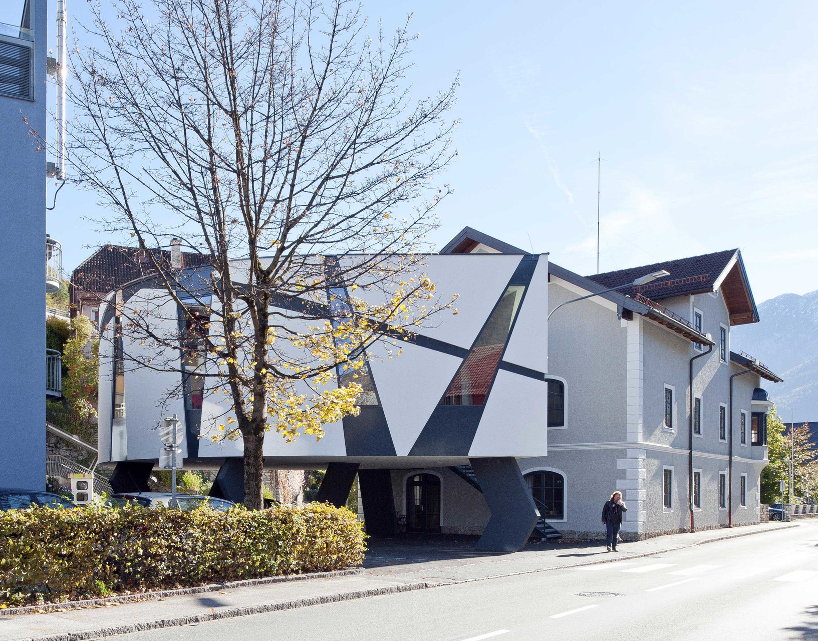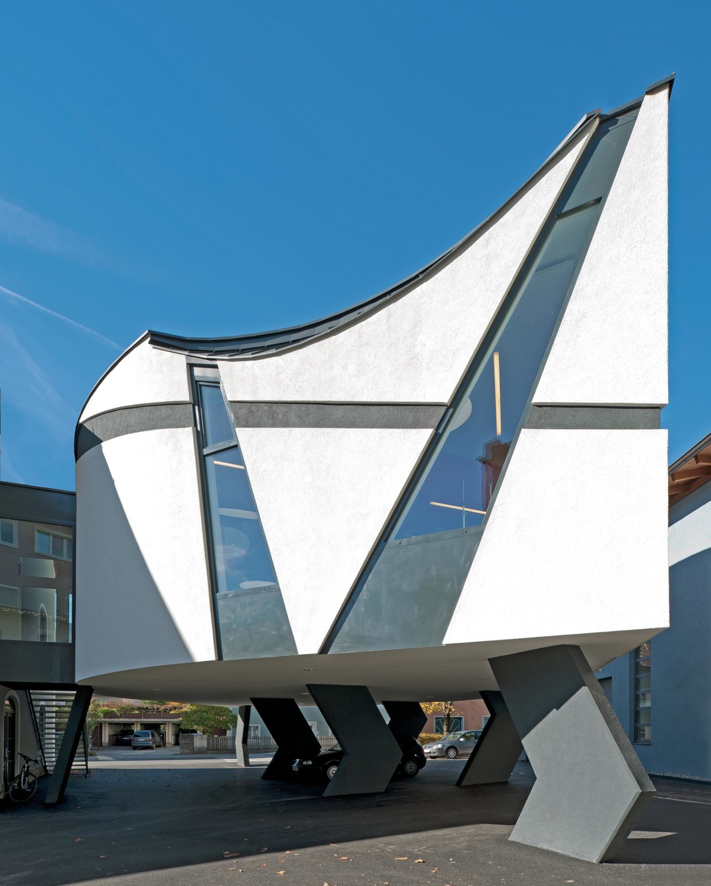 Nach Aussen hebt sich der neue, schwebende Baukörper klar vom Bestandsgebäude ab und schafft durch die eigenständige Form und Gestalt einen interessanten Kontrast zwischen alt und neu. Die Fassadengestalt gibt mit der geschwungenen Linienführung die Dynamik der Bewegung und dem Rhythmus der Musik im Inneren wieder. Unter dem neuen, aufgeständerten Baukörper entstehen neue Parkflächen für Pkw`s und Fahrräder. (Text: Architekten)