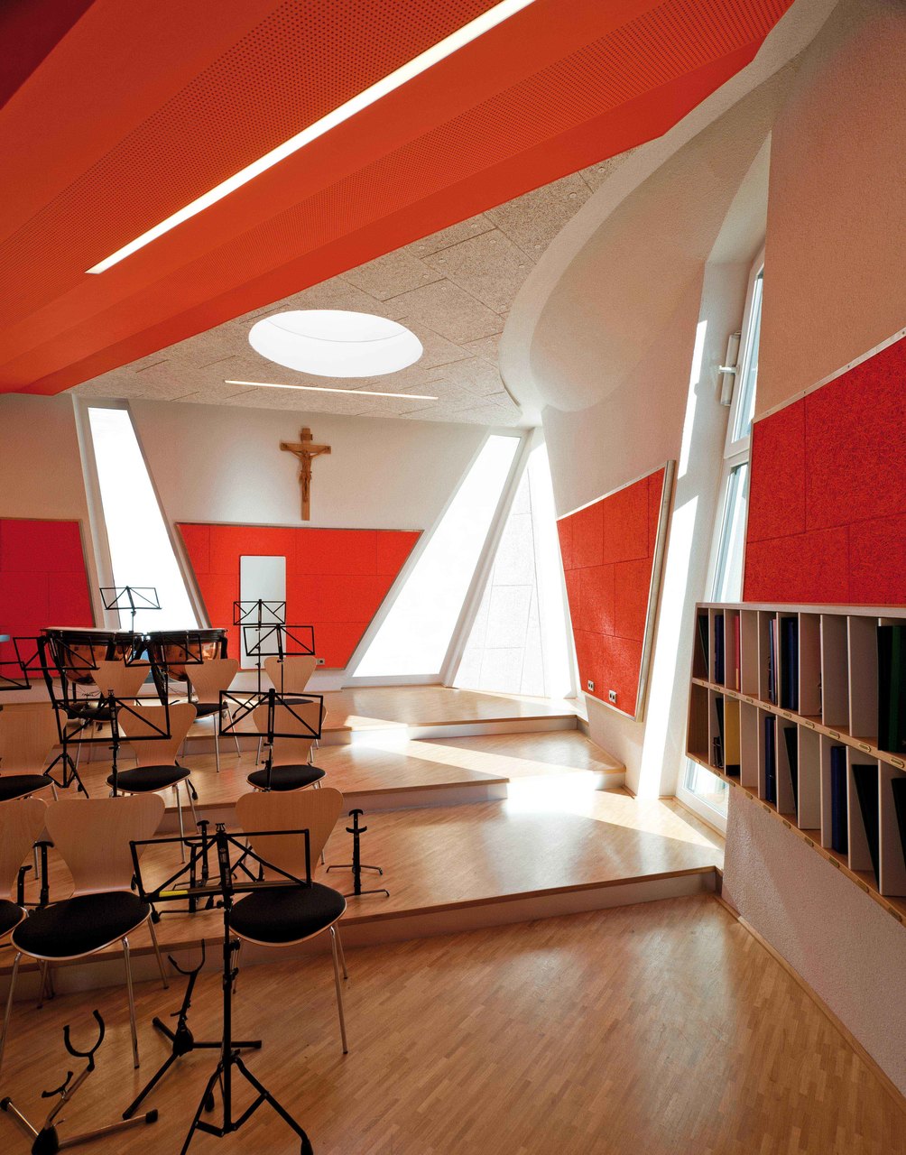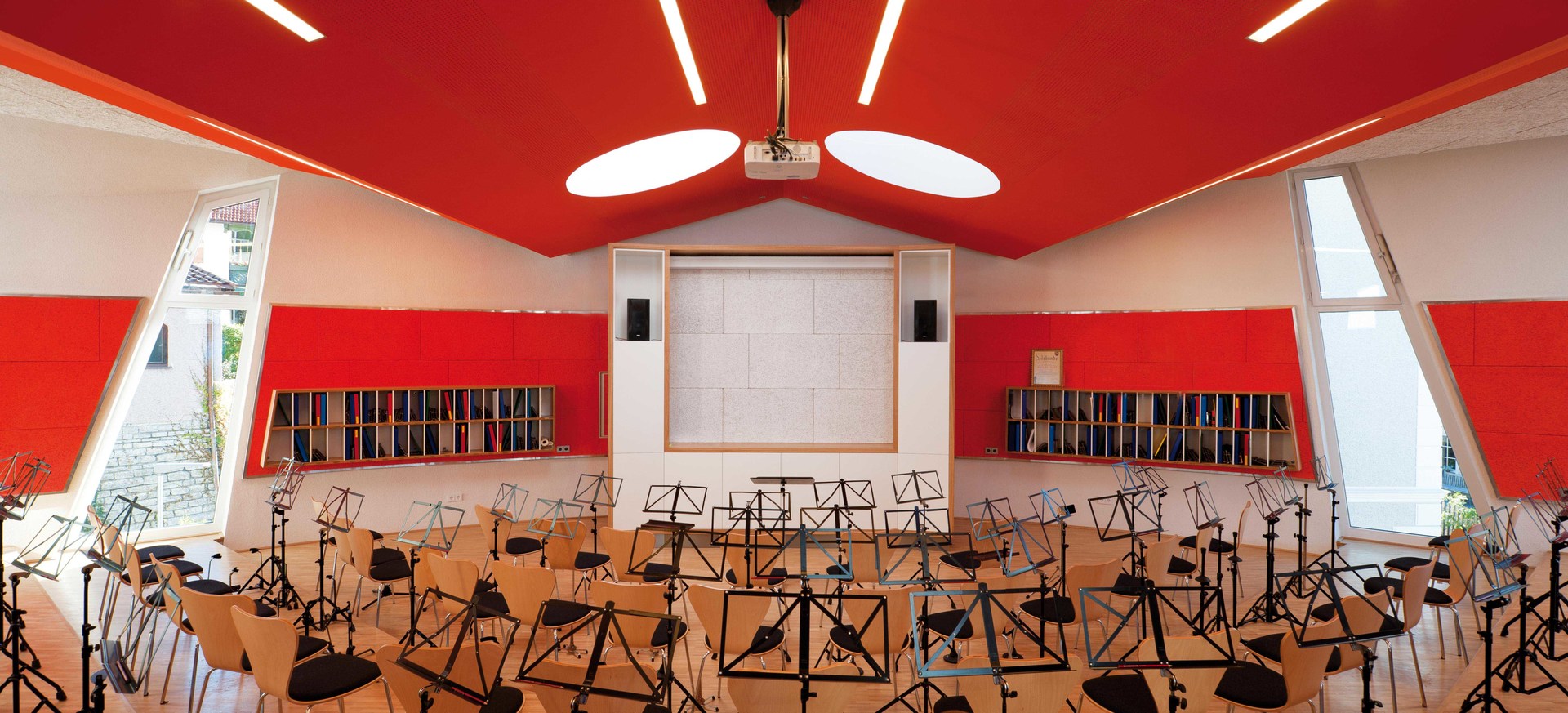 Die Leichtigkeit der orangen Deckenformation gibt dem Innenraum eine Bewegung und Farbenintensität welche sich in der Spielweise des Musikers wiederfinden soll. Die Musiker der Trachtenmusikkapelle konnten mit diesem Innenraum begeistert werden und stehen mittlerweile voll und ganz hinter ihrem neuen Musikproberaum.