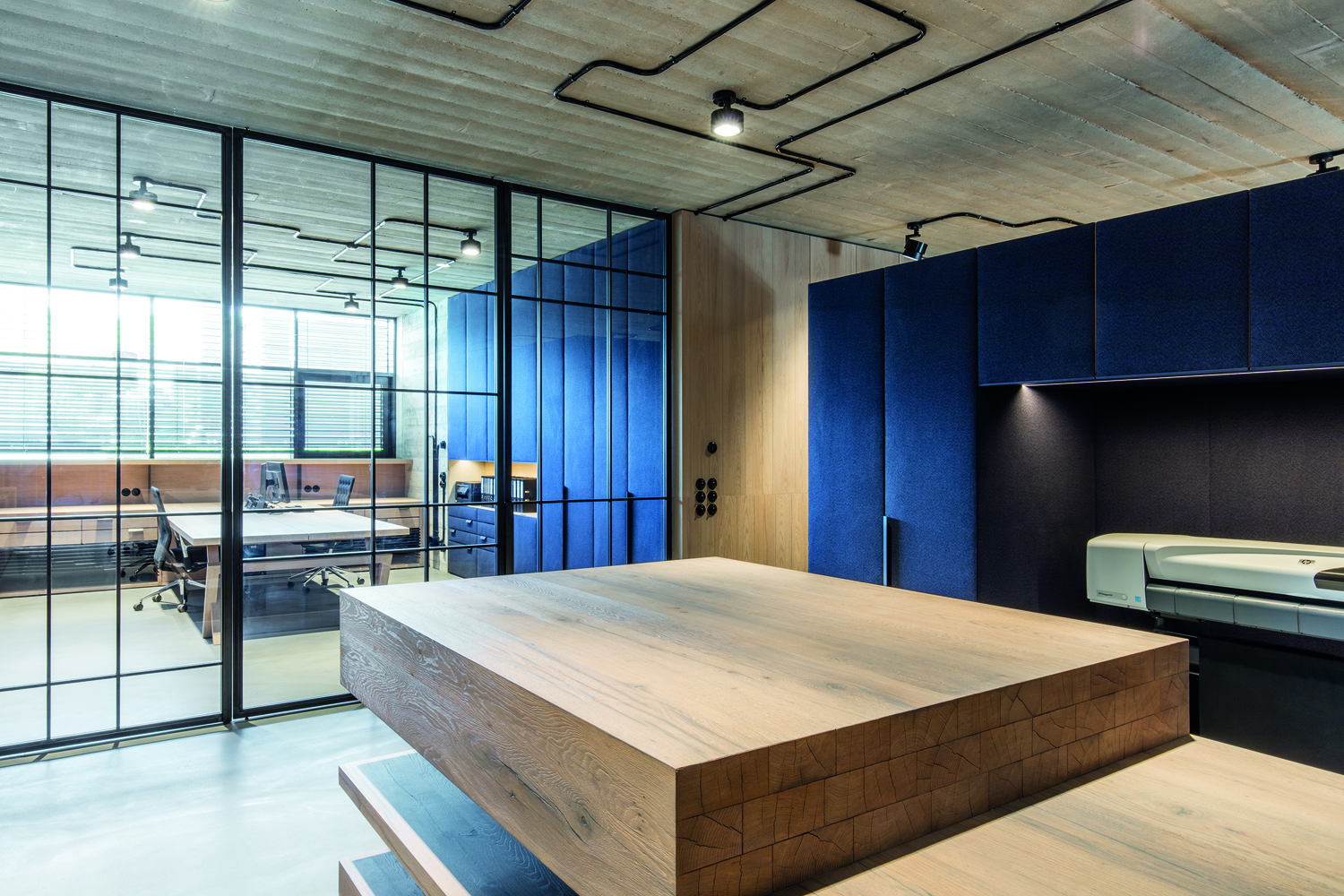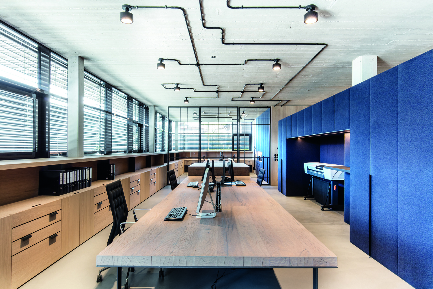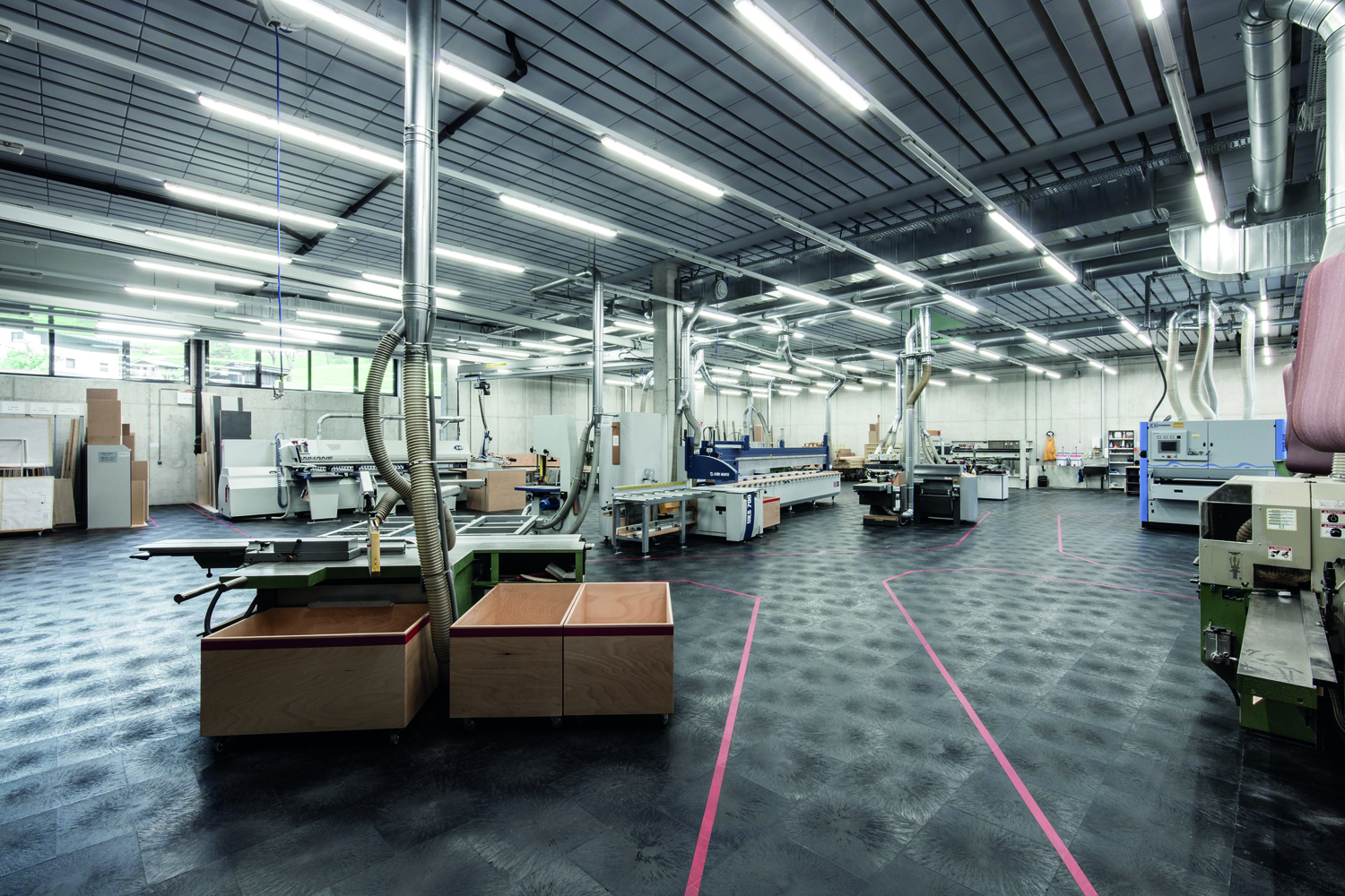 Neben der Werkstatt sind auch die Kundenräume, Büros und Aufenthaltsräume der Tischler wohnlich gestaltet und lichtdurchflutet. Ein großer langgestreckter Balkon im 1. Obergeschoß ermöglicht einen Ausblick auf den Nationalpark Hohe Tauern.
