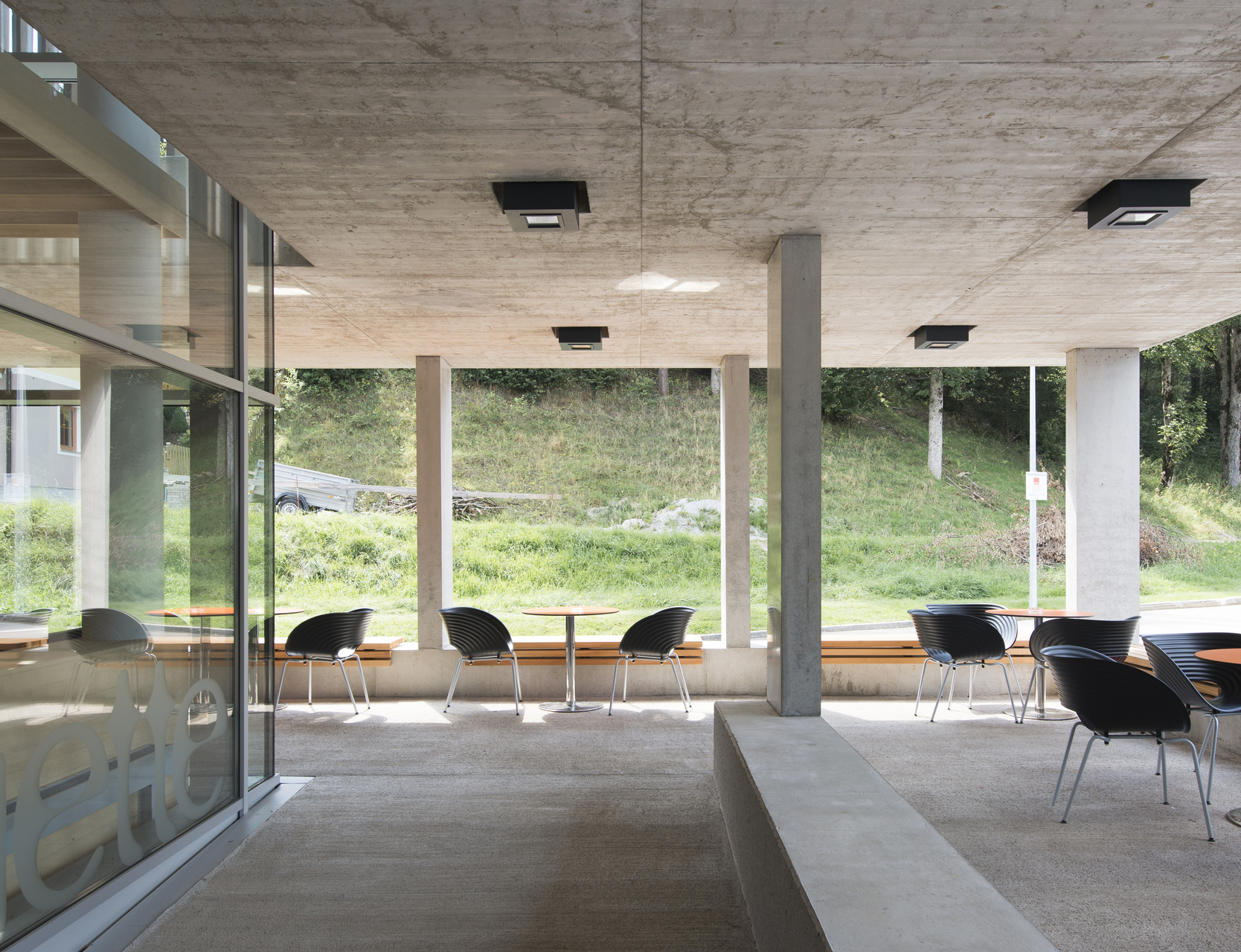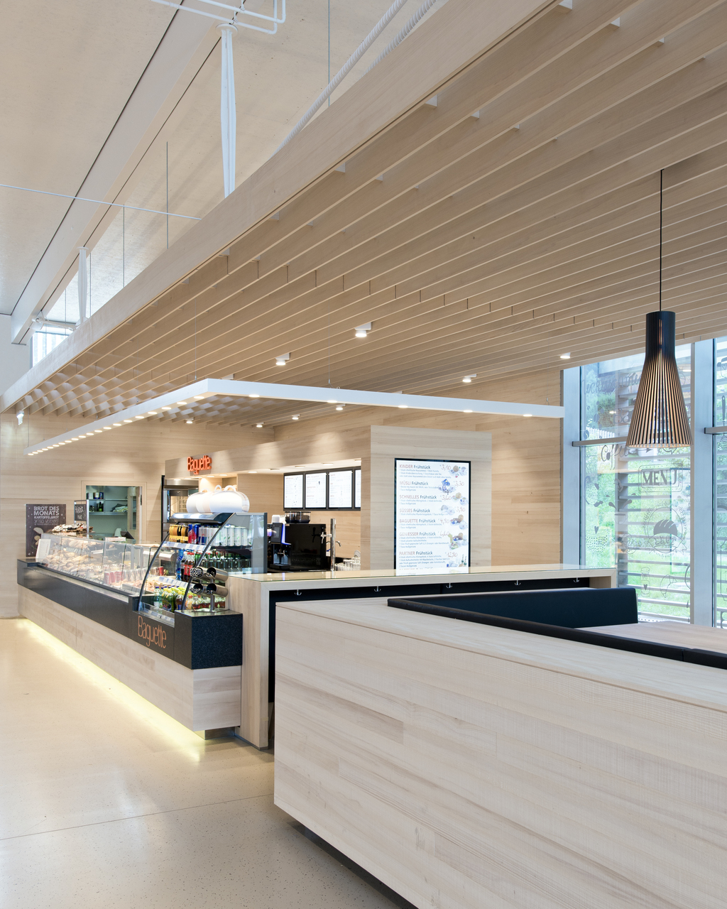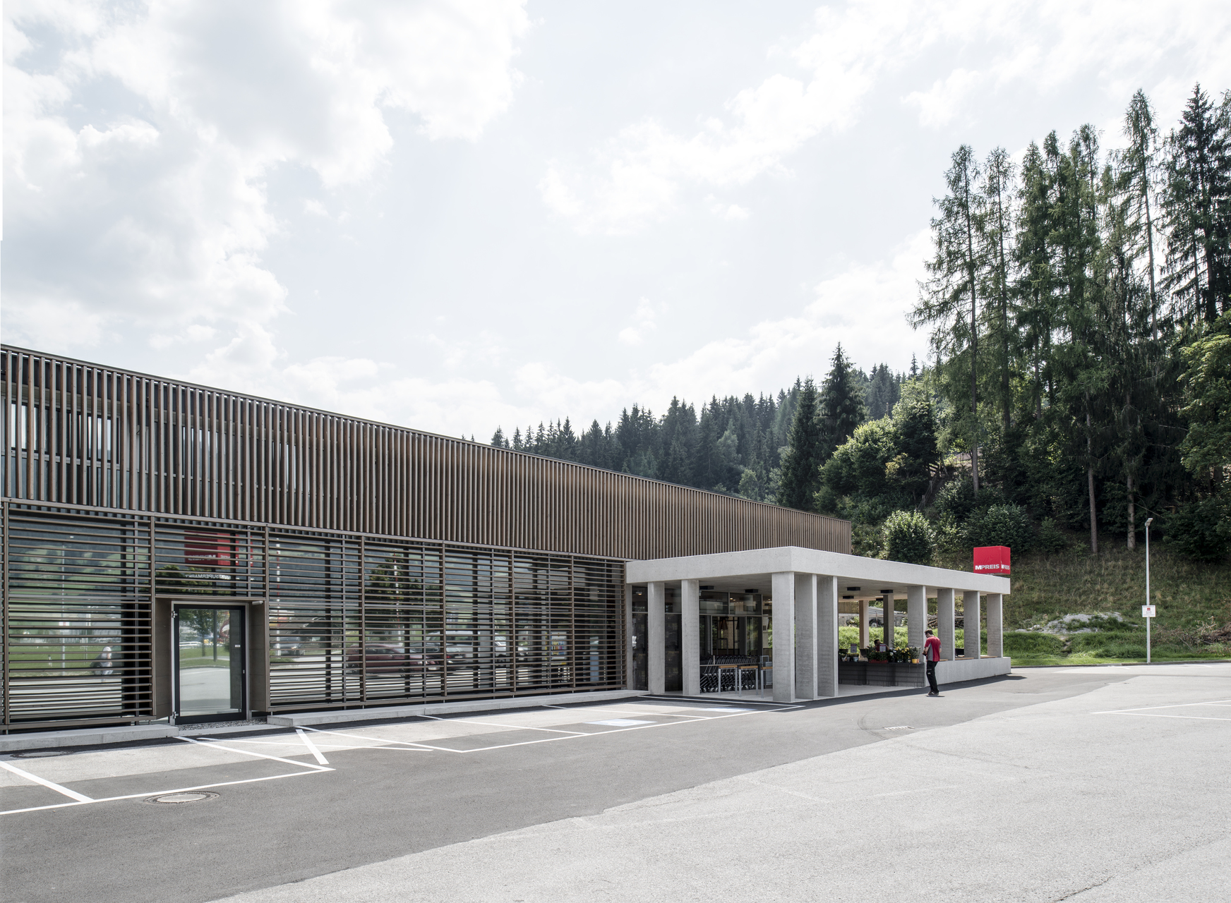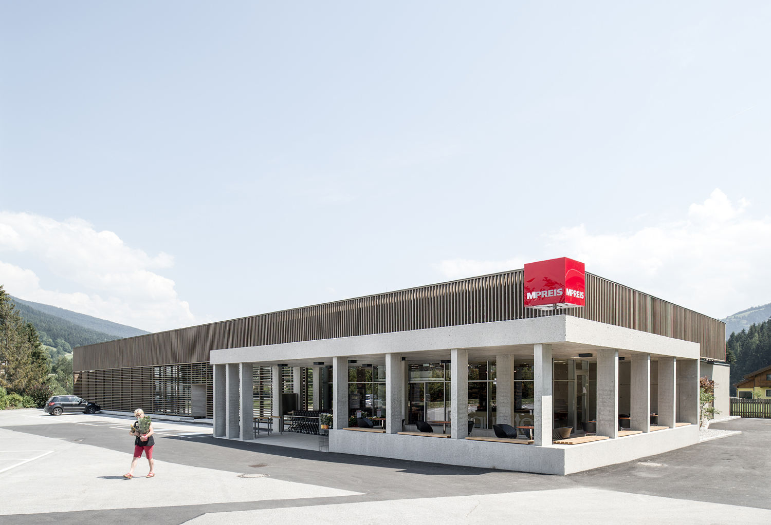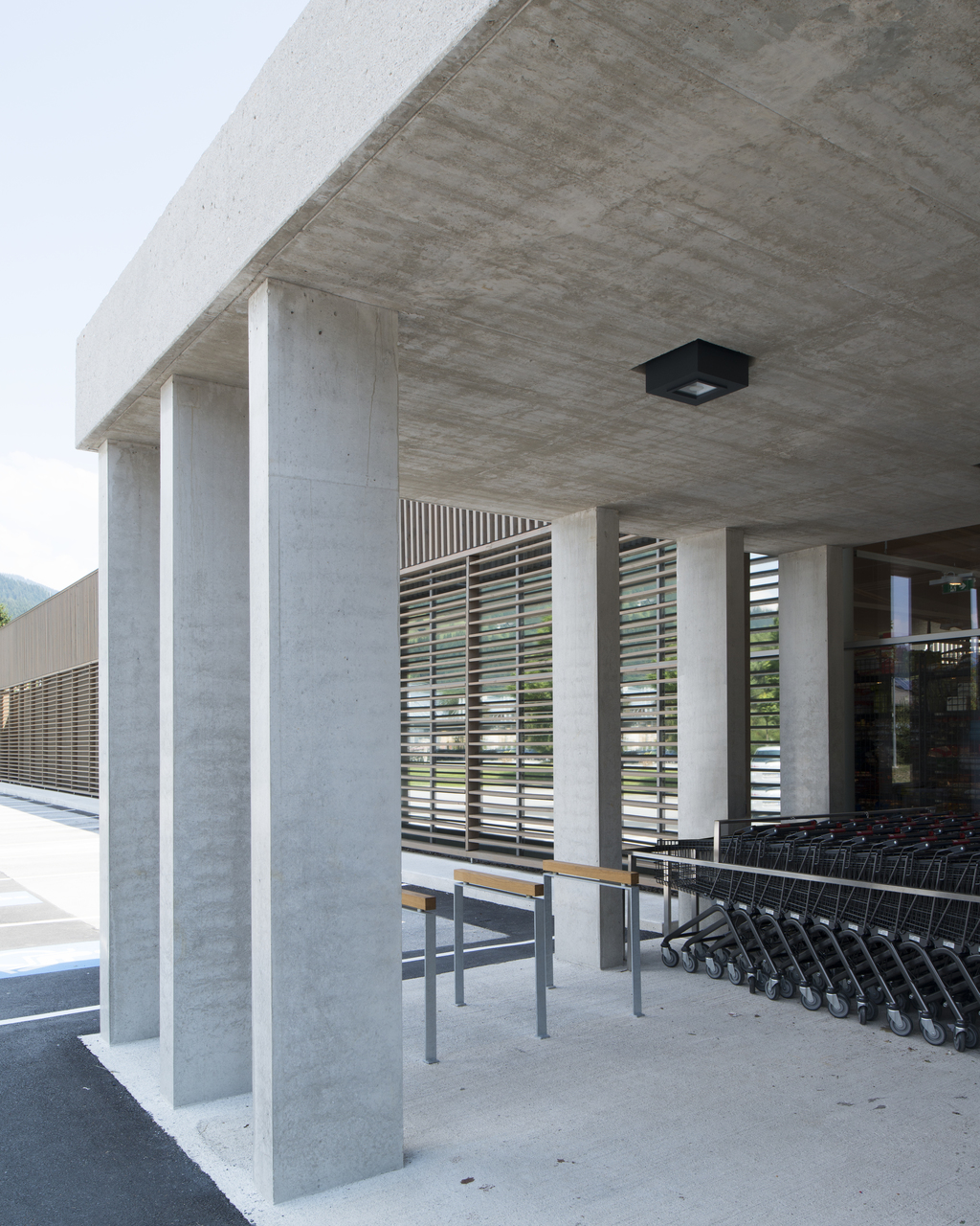 Dem plastisch sehr heterogenen Bestandvolumen wurde eine neue Hülle aus differenzierten, filigranen Holzlamellen vorgesetzt um die Dimension des Baukörpers zu unterstreichen und in seiner Gesamterscheinung zu beruhigen. Der Eingang wurde im Bezug zum menschlichen Maßstab gesetzt und durch den Wechsel von Materialität und Dimension (Sichtbeton) zur Adressbildung des gesamten Marktes ausgebildet. (Text: Architekt)