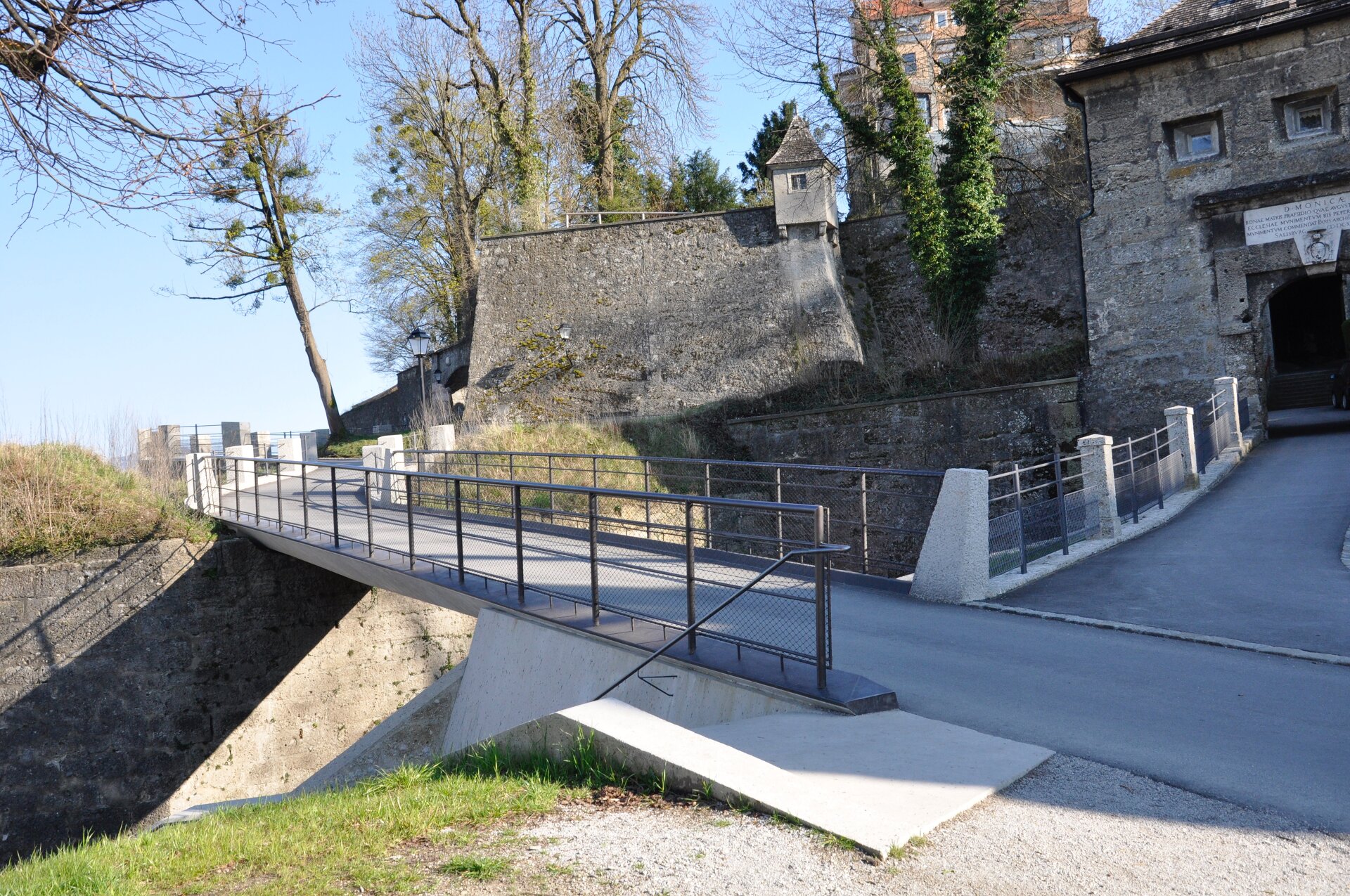 Als 2003 der Bau für das Museum der Moderne am Mönchsberg startete, errichtete man für den Baustellenverkehr zur Umgehung dieser Engstelle eine Behelfsbrücke aus Holz. Diese wurde nicht nur für den Bau des Museums verwendet, sondern auch für die Generalsanierung des Schlosses Mönchstein. Neben diesen zwei großen Gebäuden befinden sich auch noch weitere Bauten, welche in Notfällen für größere Einsatzfahrzeuge der Feuerwehr erreichbar sein sollten. Daraus ergab sich der Grund für eine gestalterisch hochwertige und dauerhafte Lösung. 2007 wurde für die neue Brücke ein Architekturwettbewerb ausgeschrieben. Das Architekturbüro HALLE 1 mit den Architekten Dipl.-Ing. Heinz Lang und Dipl.-Ing. Gerhard Sailer sowie der Statiker Dipl.-Ing. Gerhard Heinrich konnten den Wettbewerb mit ihrem Projektentwurf für sich entscheiden.