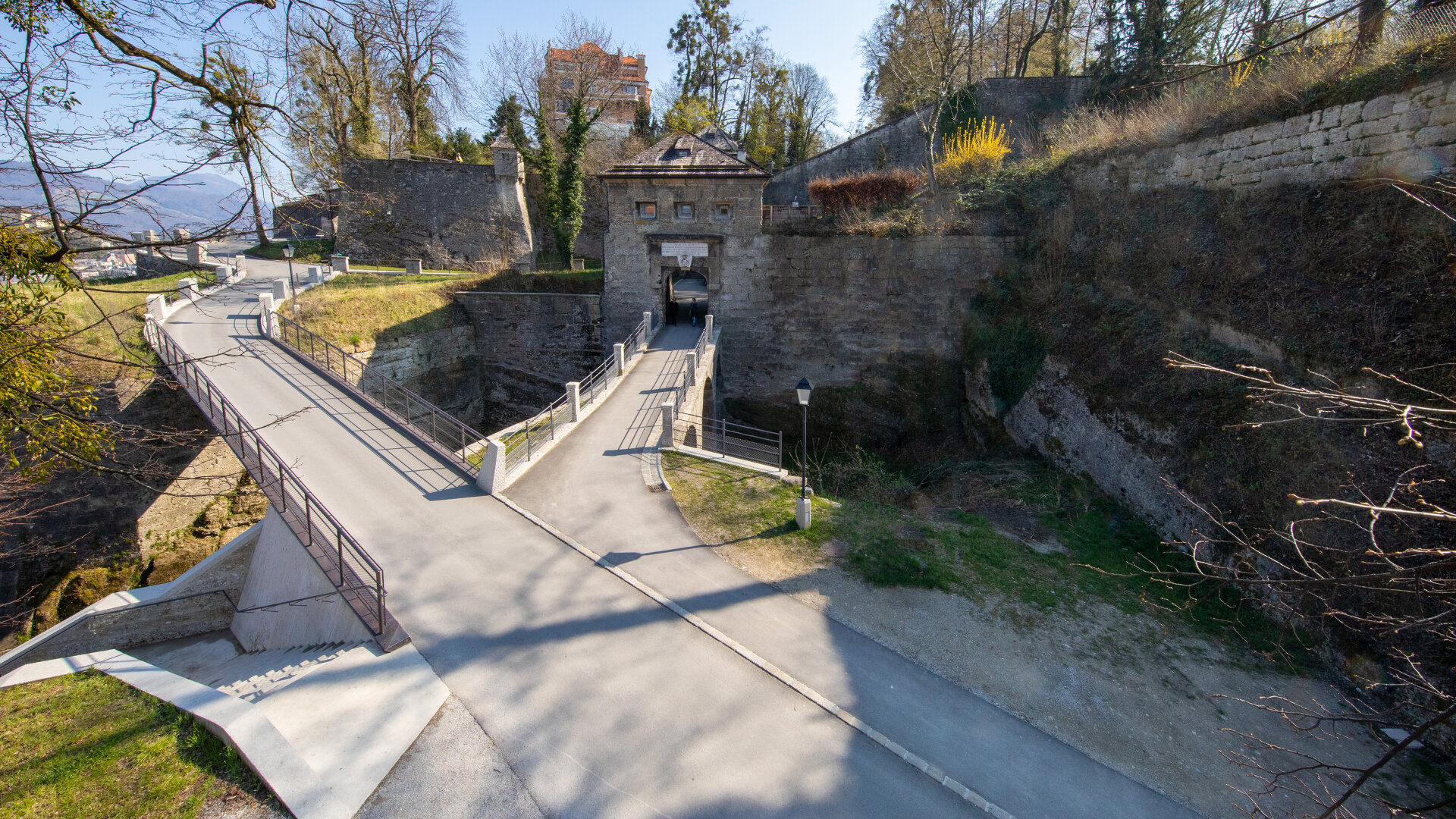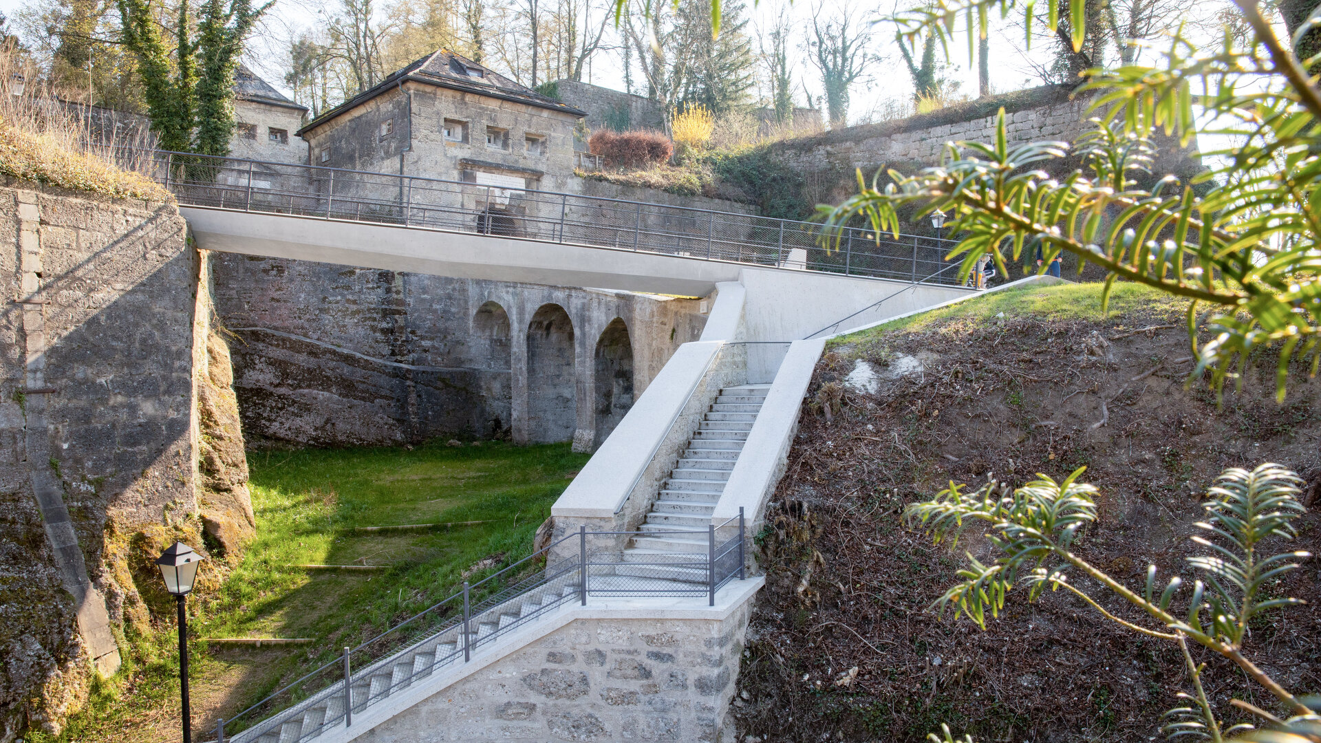 Im November 2018 konnte schließlich die Behelfsbrücke abgebaut werden, um so Platz für einen neuen Steg zu schaffen, der zwischen Ende Juli 2018 und Frühjahr 2019 errichtet wurde. Mit einer Länge von 16 Metern liegt dieser mit seinem nördlichen Rand an der Knickkante der Wehrmauer. Dieses deutliche Wegrücken von der Pforte gewährleistet nicht nur eine dem Denkmal angemessene Distanz und seine Freistellung, es ermöglicht auch eine Harmonisierung der Straßenführung. Die Herausforderung dabei war, dass die alten Wehrmauern nicht belastet werden dürfen. Dafür wurden in den Fels Pfähle gebohrt, auf welchen die Brücke ca. 10 Zentimeter von der Mauer entfernt schwebend aufliegt.