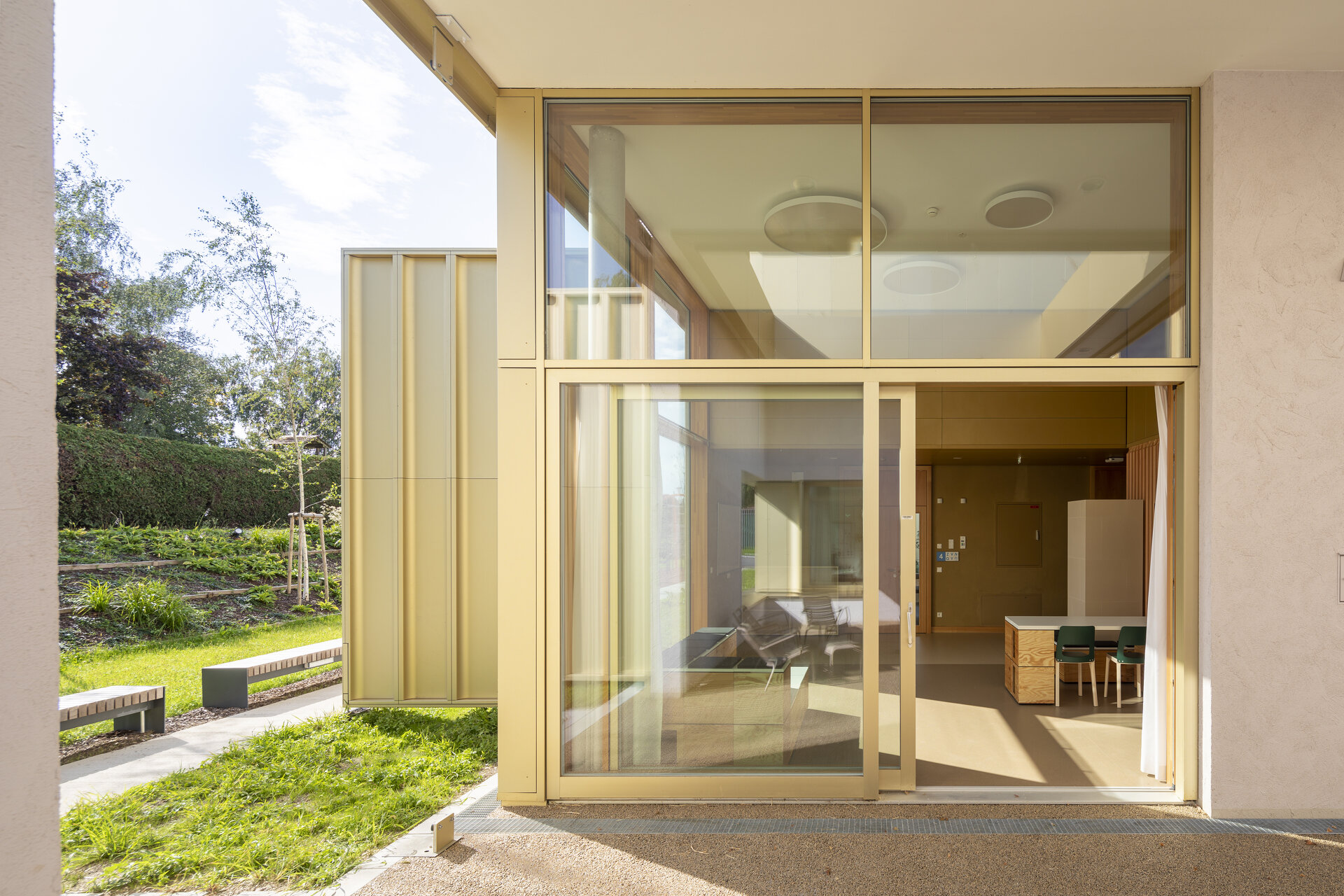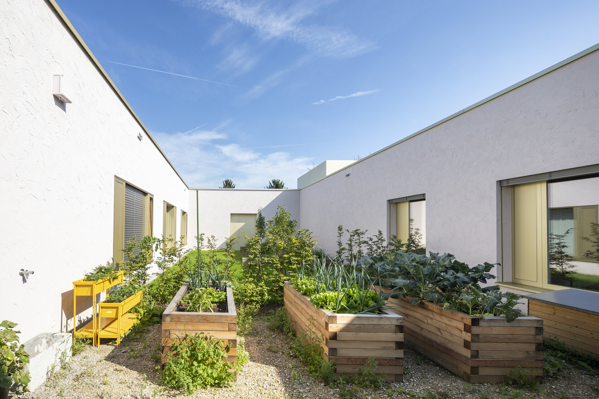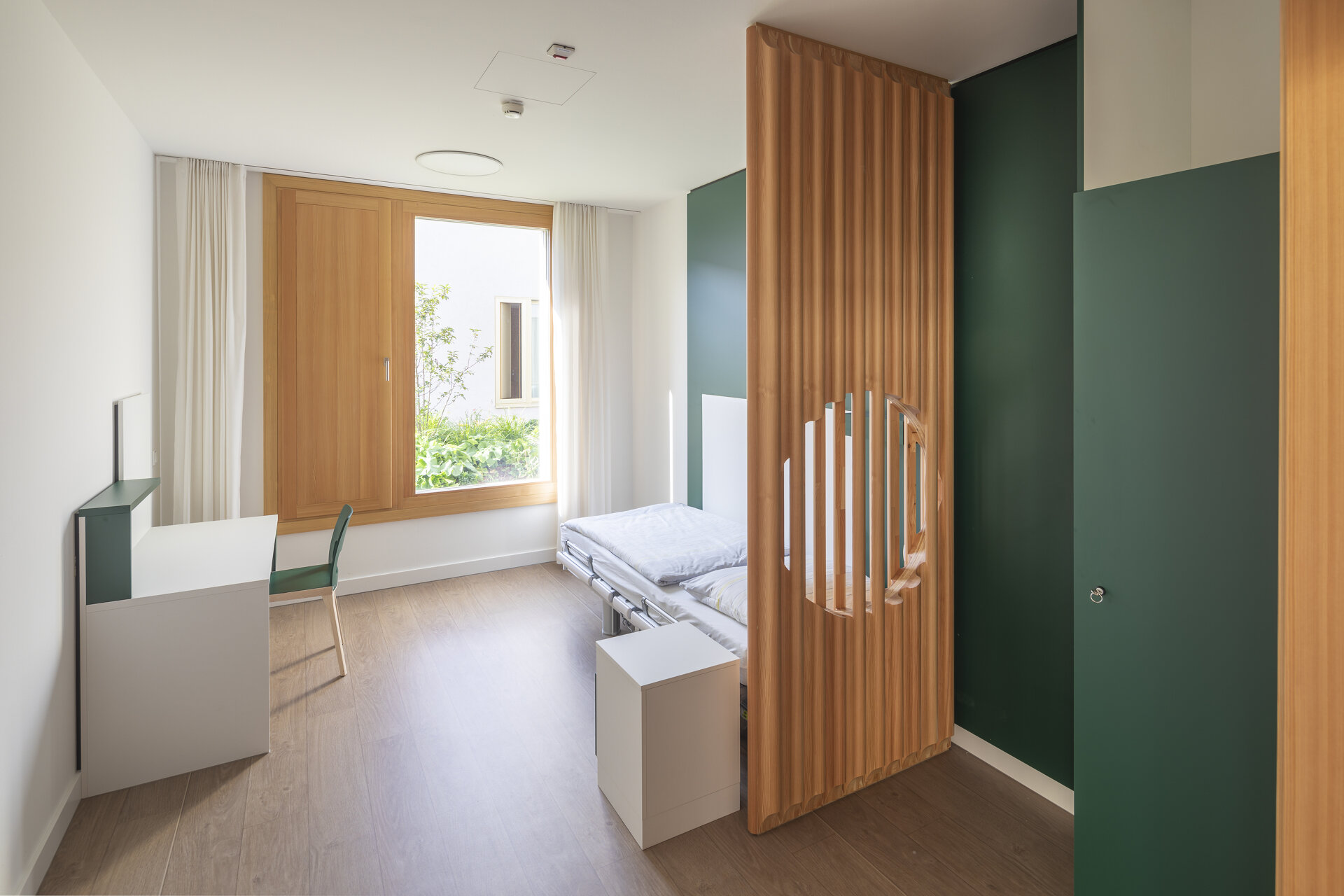 Der Neubau der Kinder- und Jugendpsychiatrie ist innerhalb des weitläufigen Komplexes als eigenständiges, durchgrüntes Dorf konzipiert. Es interpretiert dessen städtebauliche Anlage auf neue Weise: Der Gebäudekomplex ist aufgebaut wie ein kleiner Campus oder eine kleine Stadt in der Stadt, die sich aus Höfen, Gärten und Pavillons zusammensetzt. Umfasst wird der Neubau von einer rahmenden Gartenmauer, die Schutz bietet und Ausblicke in die Umgebung ermöglicht. Als Tor zwischen Innen und Außen dient das dreigeschoßige Kopfgebäude. Hier befinden sich der Empfang sowie die Therapie- und Personalräume. Die Wohngruppen für den stationären Aufenthalt sind auf einer Ebene entlang der zentralen Erschließungsachse gruppiert. Ein „Dorfplatz“ bildet das räumliche und funktionale Zentrum für die jungen Patienten. Vier bis sechs Kinder oder Jugendliche leben oft ein Jahr oder länger in einer eigenen Wohngruppe zusammen. Jede dieser Wohngruppen besteht aus einem Gemeinschaftsbereich mit Küche und Badezimmern sowie aus Ein- oder Zweibettzimmern. Die zentralen Wohn- und Essbereiche verfügen über einen wärmenden Infrarot-Kachelofen und öffnen sich mit den großzügigen, imposant hohen Fenstern zu den Spielhöfen.