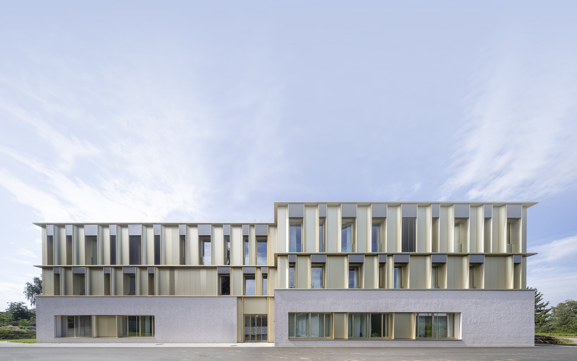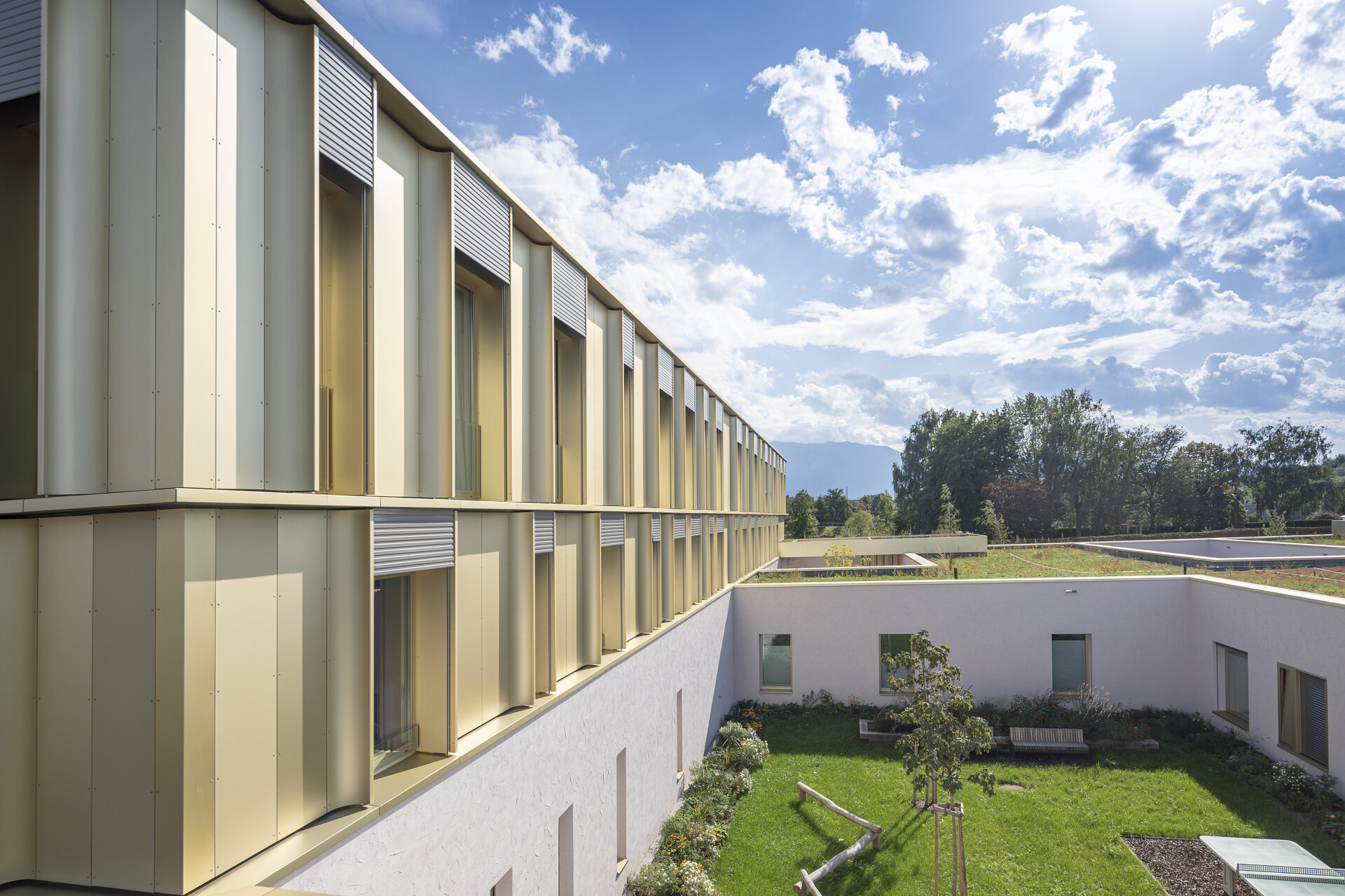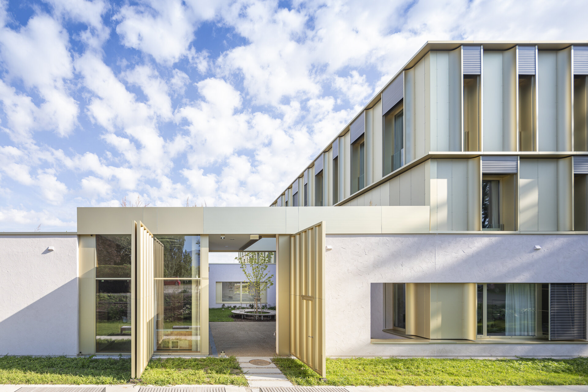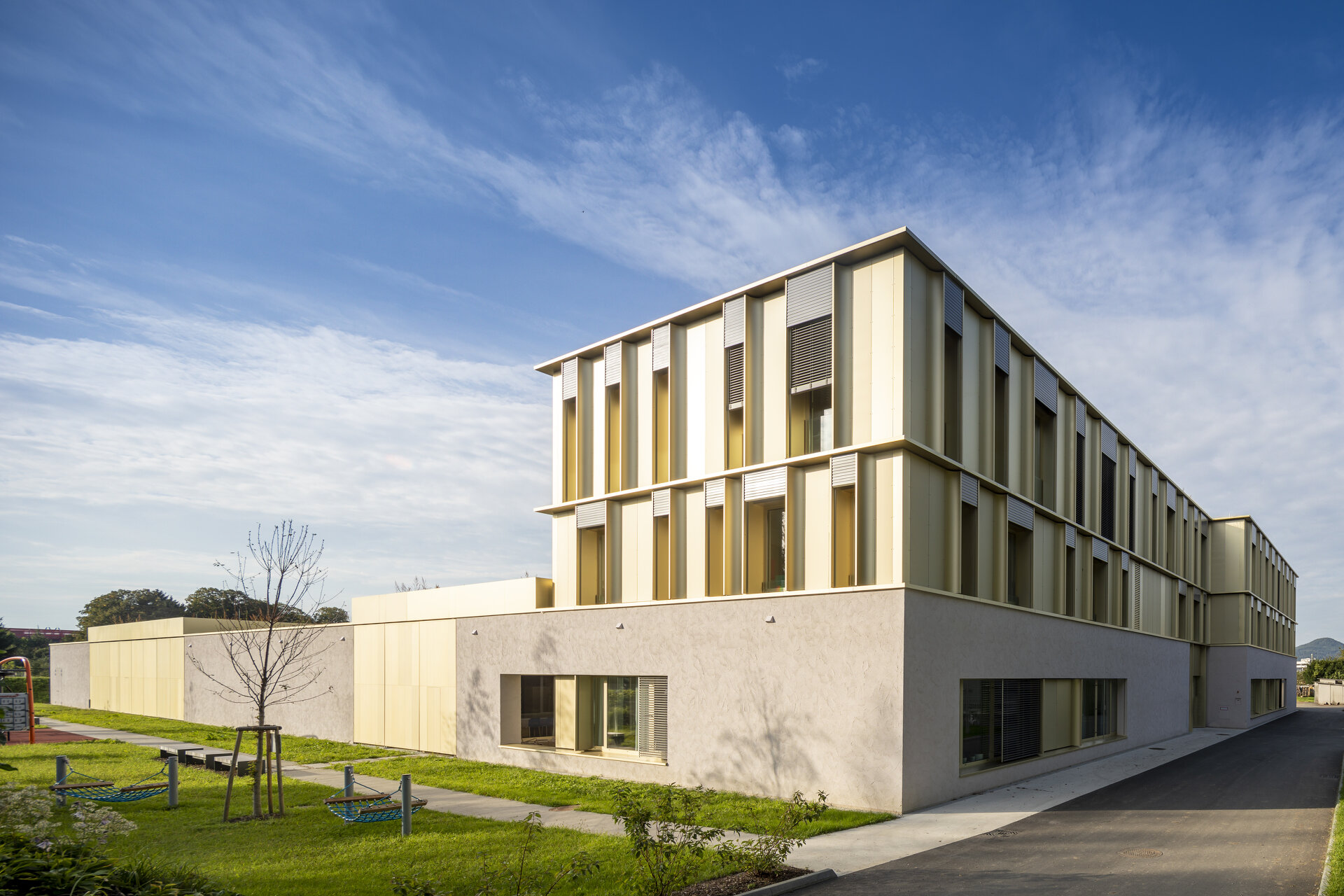 Der Neubau der Kinder- und Jugendpsychiatrie ist innerhalb des weitläufigen Komplexes als eigenständiges, durchgrüntes Dorf konzipiert. Es interpretiert dessen städtebauliche Anlage auf neue Weise: Der Gebäudekomplex ist aufgebaut wie ein kleiner Campus oder eine kleine Stadt in der Stadt, die sich aus Höfen, Gärten und Pavillons zusammensetzt. Umfasst wird der Neubau von einer rahmenden Gartenmauer, die Schutz bietet und Ausblicke in die Umgebung ermöglicht. Als Tor zwischen Innen und Außen dient das dreigeschoßige Kopfgebäude. Hier befinden sich der Empfang sowie die Therapie- und Personalräume. Die Wohngruppen für den stationären Aufenthalt sind auf einer Ebene entlang der zentralen Erschließungsachse gruppiert. Ein „Dorfplatz“ bildet das räumliche und funktionale Zentrum für die jungen Patienten. Vier bis sechs Kinder oder Jugendliche leben oft ein Jahr oder länger in einer eigenen Wohngruppe zusammen. Jede dieser Wohngruppen besteht aus einem Gemeinschaftsbereich mit Küche und Badezimmern sowie aus Ein- oder Zweibettzimmern. Die zentralen Wohn- und Essbereiche verfügen über einen wärmenden Infrarot-Kachelofen und öffnen sich mit den großzügigen, imposant hohen Fenstern zu den Spielhöfen.