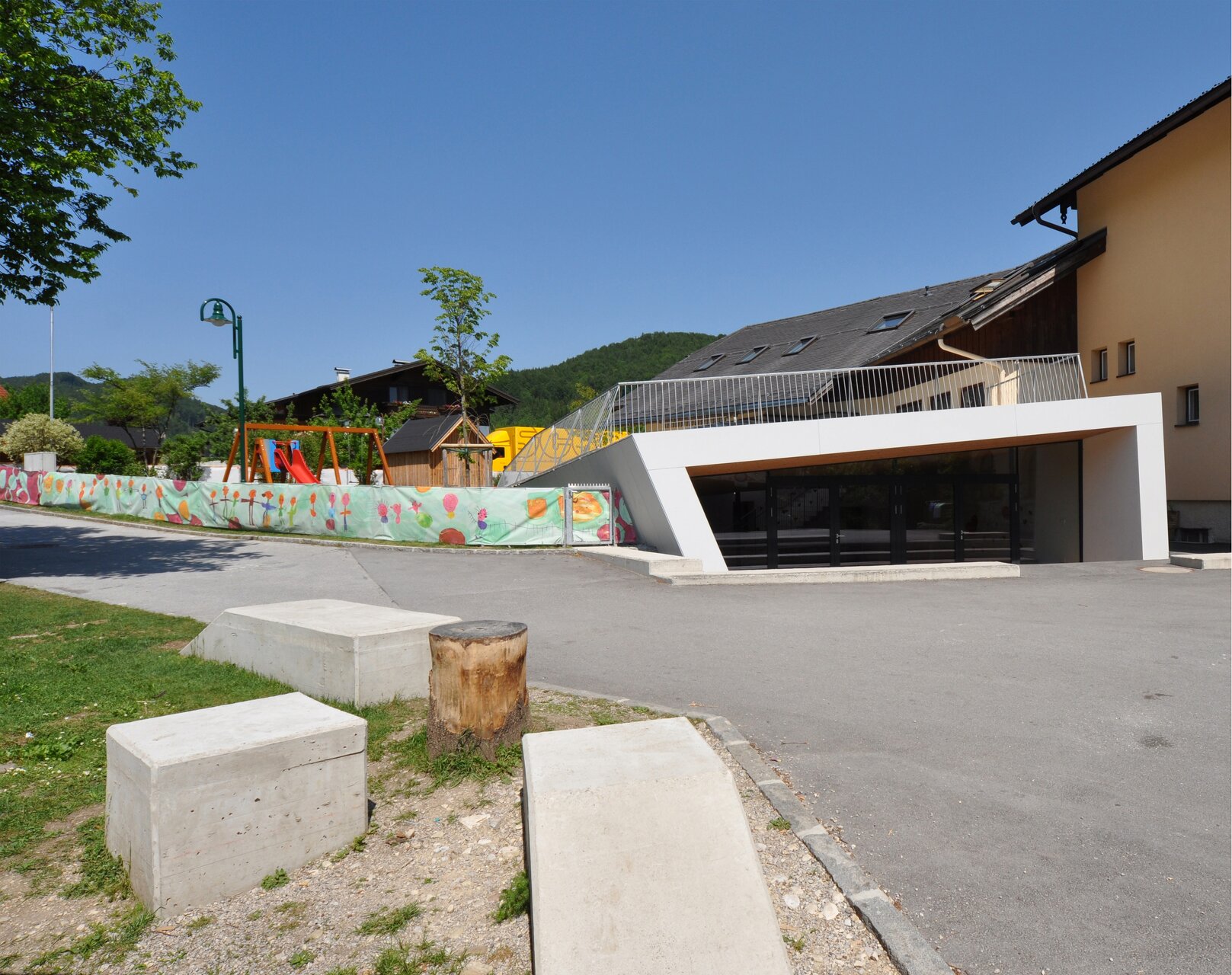 Die Ausformulierung dieser differenzierten architektonischen Idee nimmt sich zwar im Volumen des gesamten Ortsteils zwischen Feuerwehr-, Vereinshaus, Volksschule, Turnhalle und bestehendem Kindergarten zurück, holt sich aber seinen Platz im Dorf durch eine sorgfältige Umsetzung des Konzeptes hinsichtlich der äußeren Gestalt, Material, Details und Räumen selbstbewusst zurück.