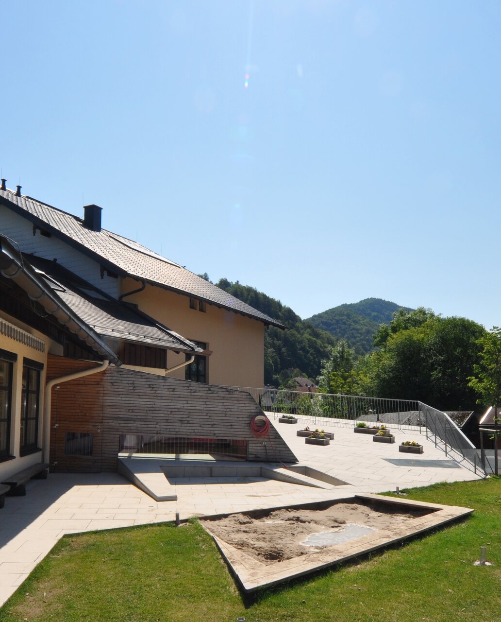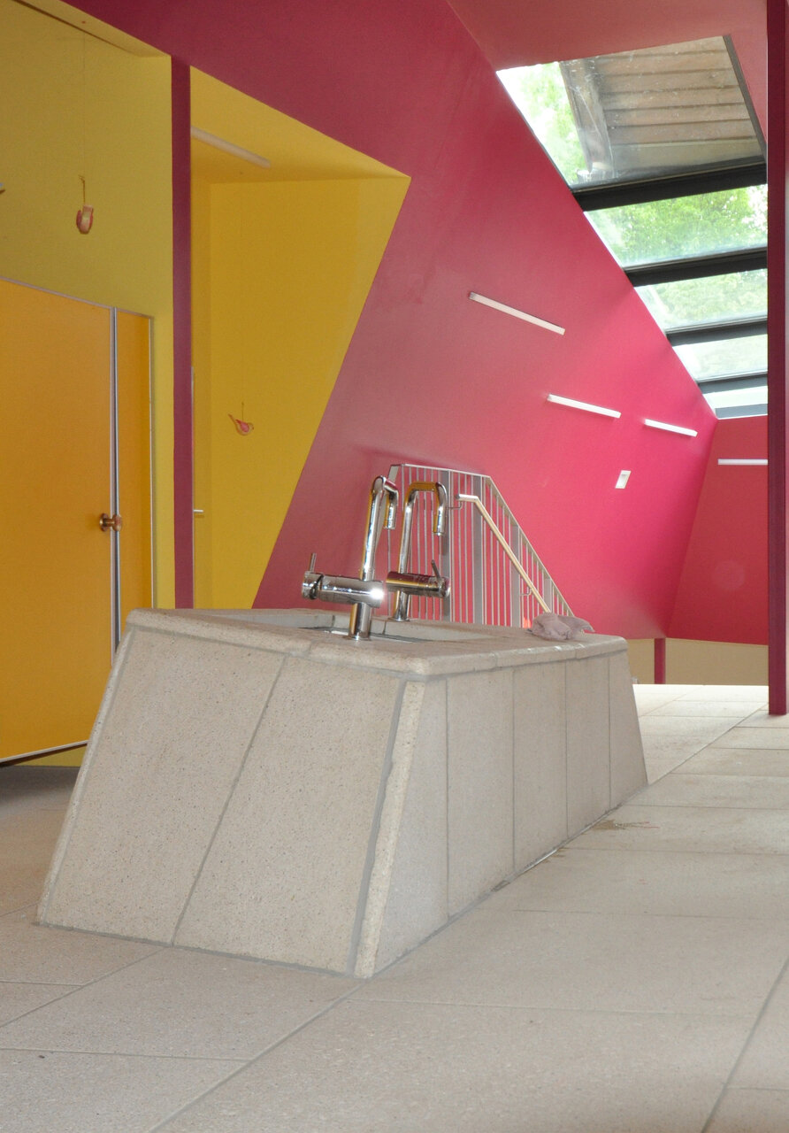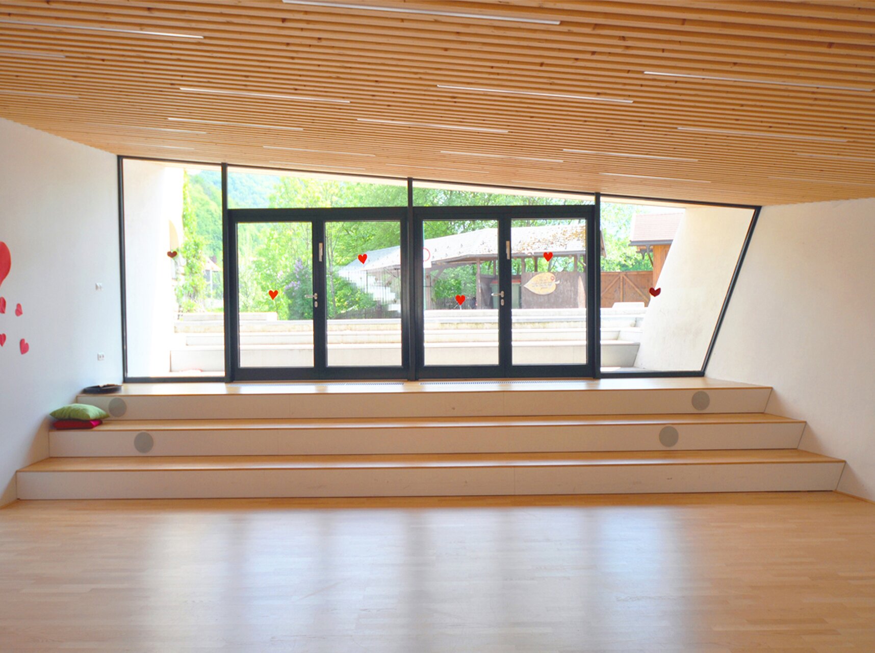 Die räumliche Abfolge vom Altbau durch den adaptierten „Brunnenraum“ hinaus auf den Spielplatz oder weiter zum Bewegungsraum erfährt eine eindeutige Zäsur durch eine veränderte Physiognomie des Gebäudes, welche dem Bewegungsdrang der Kinder durch Form, Farbe, Oberflächen und Licht-Schattensituationen entgegenkommt und neue Optionen des Raumerlebnisses bietet.