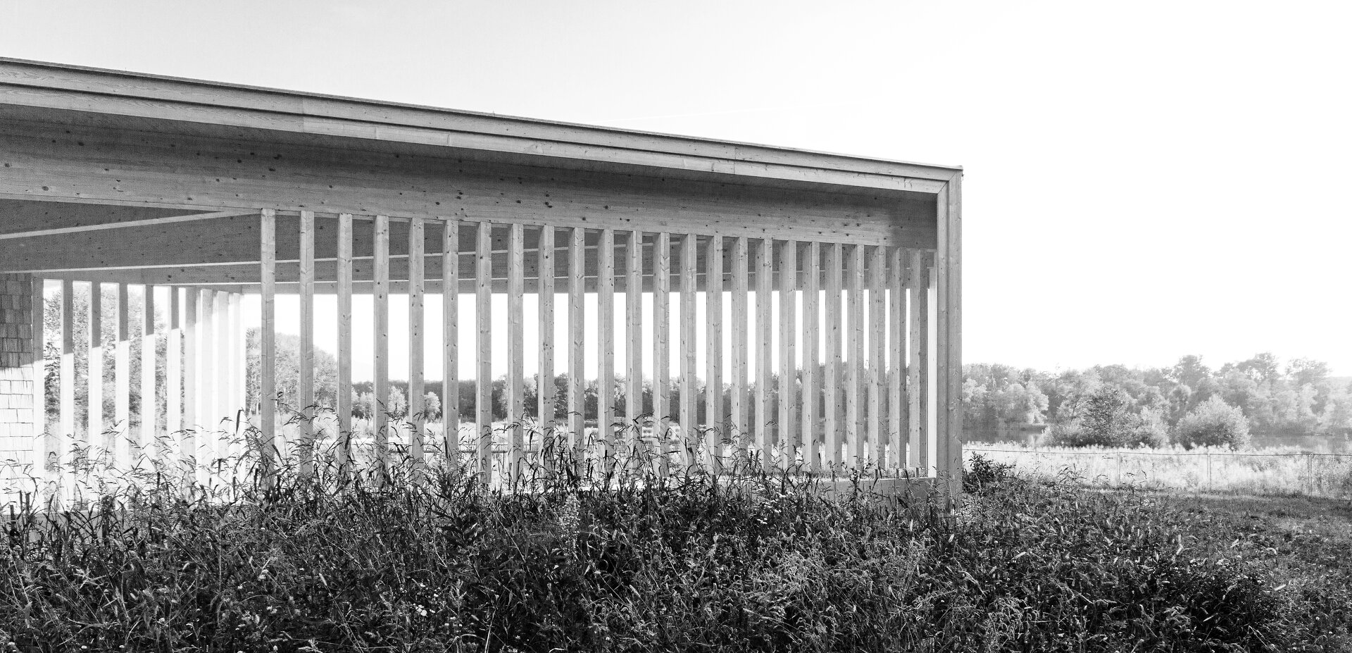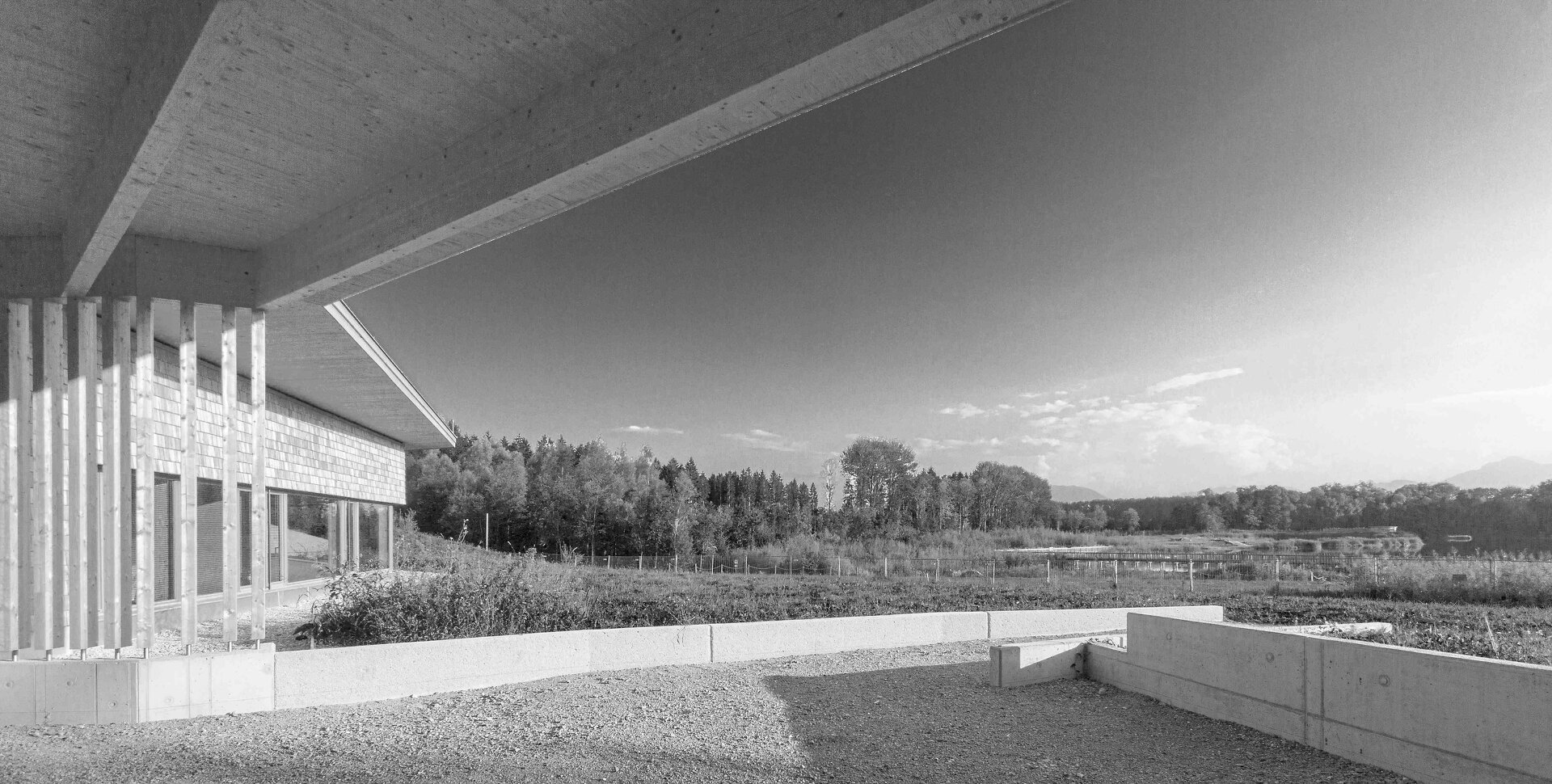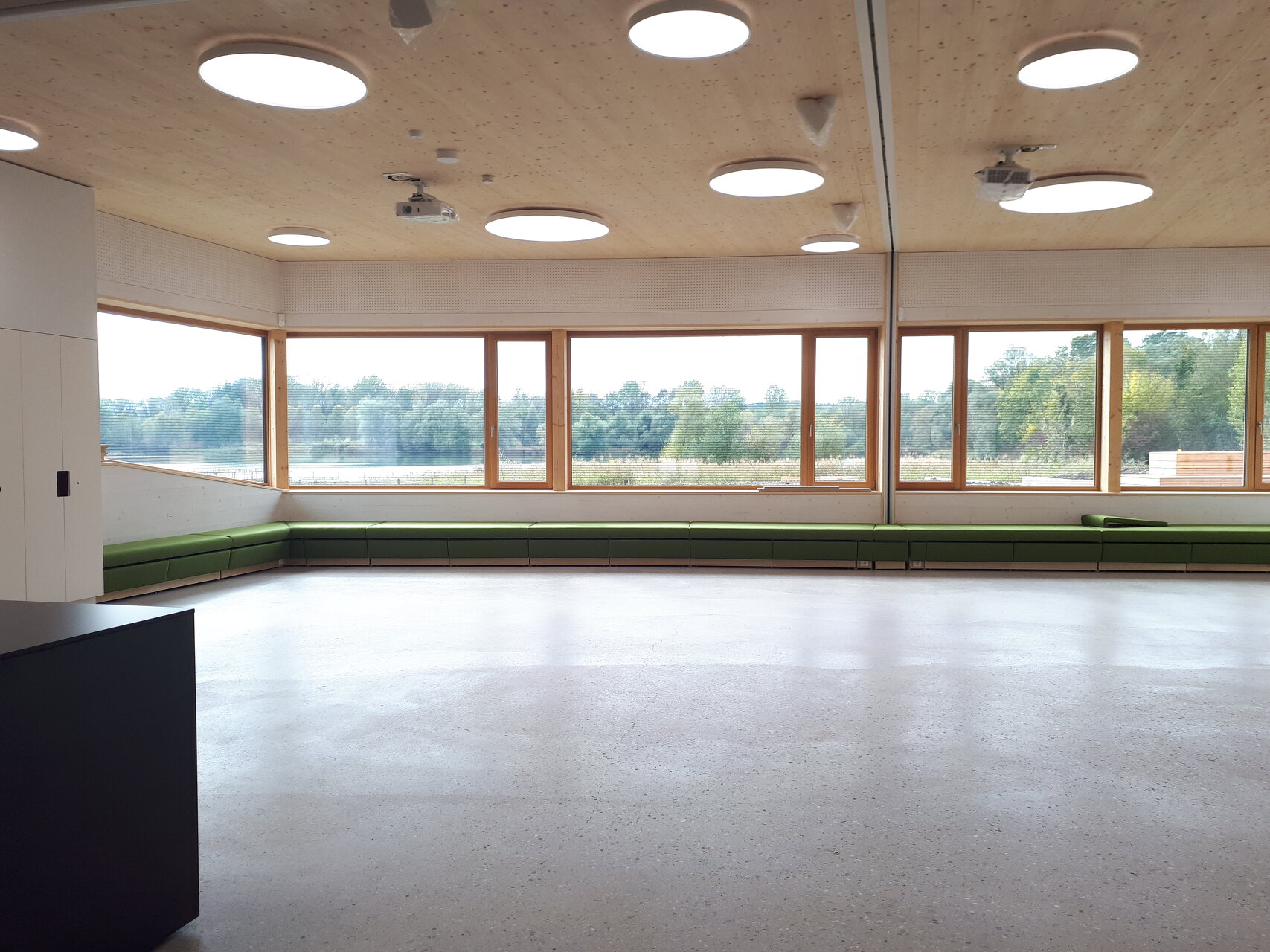 Einen großen Teil des Gebäudes bilden zwei Schulungs- bzw. Klassenräume mit 49 m² und 55 m², die über ein Faltwandsystem kombinierbar sind und sowohl einzeln als auch gemeinsam, inklusive des zentralen Vorraums, verwendet werden können. Dies ermöglicht eine große Flexibilität in der Nutzung. Ein weiterer Schulungsraum öffnet sich im Außenbereich durch das ‚Amphitheater' – eine wind- und regengeschützte Außenklasse mit etwa 80 m². Im zentralen Vorraum befindet sich außerdem eine kleine, teilweise mobil ausgeführte Küche, die von den Schüler:innen und für Veranstaltungen genutzt werden kann. Eine Werkstatt wird von Schüler:innen und für Arbeiten zum Erhalt des Wegenetzes verwendet. In einem eigenen Büroraum werden die Programme rund um die Auenwerkstatt und das Gebiet der Salzachauen entwickelt und organisiert.