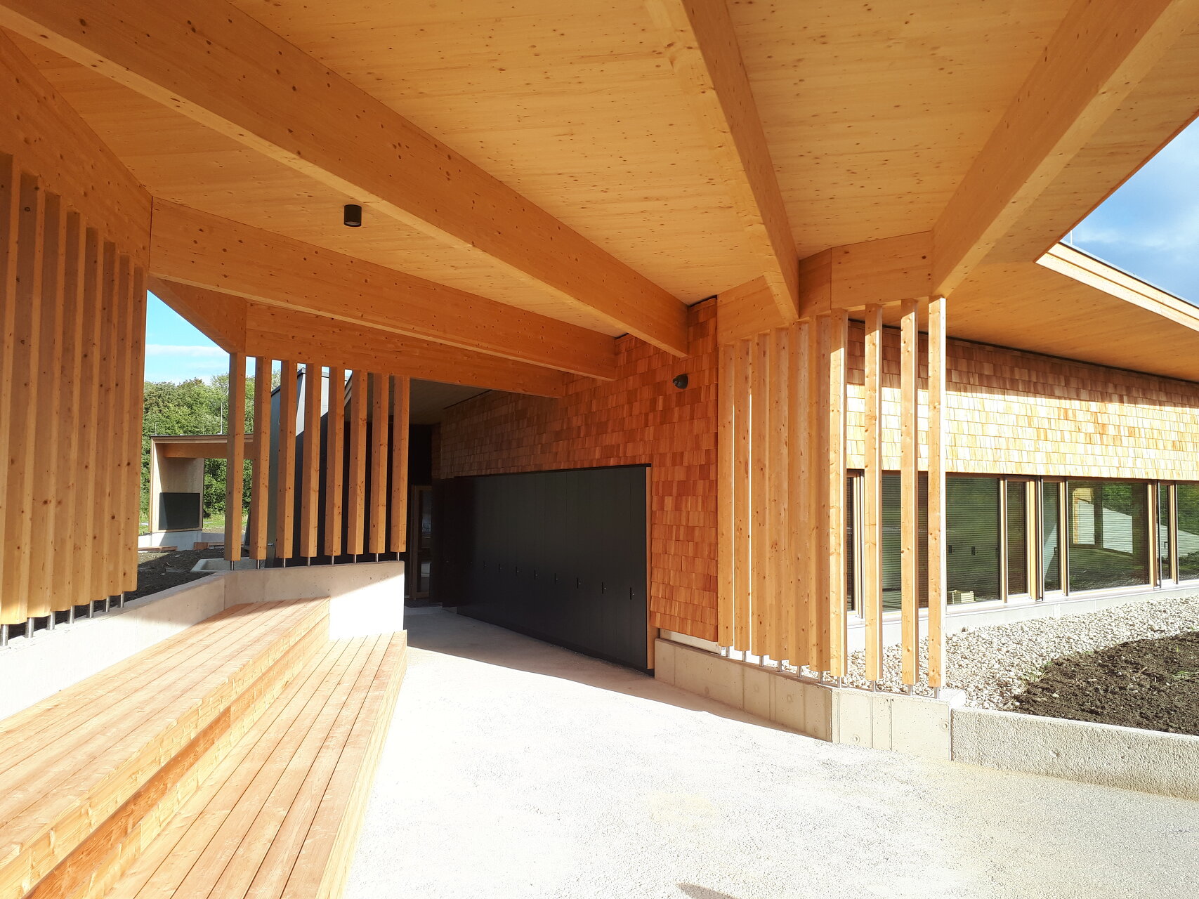 Das eingeschossige Gebäude wurde in Hybridbauweise errichtet – alle erdberührten Bauteile in Stahlbeton, die Außenwände und -decken sowie die Zwischenwände wurden in leimfreier Vollholzbauweise ausgeführt. Es ist das erste kommunale Gebäude Europas, das vollkommen autark, d. h. im Normalbetrieb allein durch die Sonne „angetrieben“ wird. Weltweit ist es eines der ersten Gebäude, das im Winter – mittels Bauteilaktivierung – solare Wärme nicht nur in der Betonbodenplatte, sondern auch in der Vollholzdecke speichert. Im Sommer wird diese Holzdecke aktiv mittels Erdkühle temperiert und fungiert so als ‚Kühlspeicher' aus Holz. Damit entfällt die „klassische“ Klimaanlage komplett.