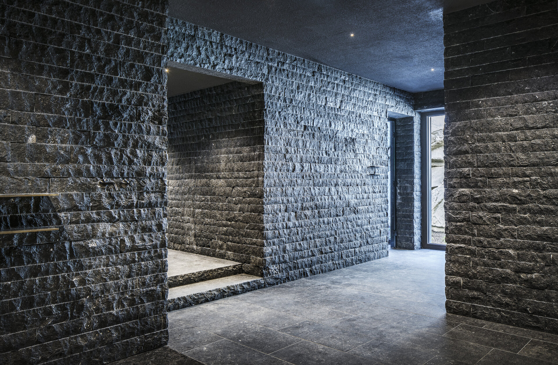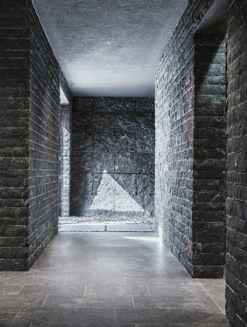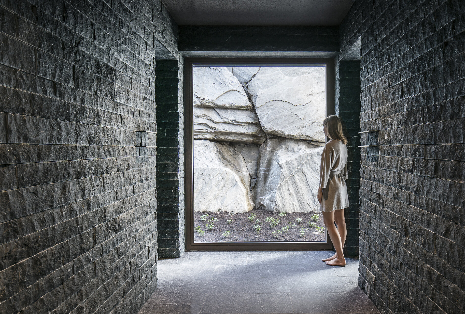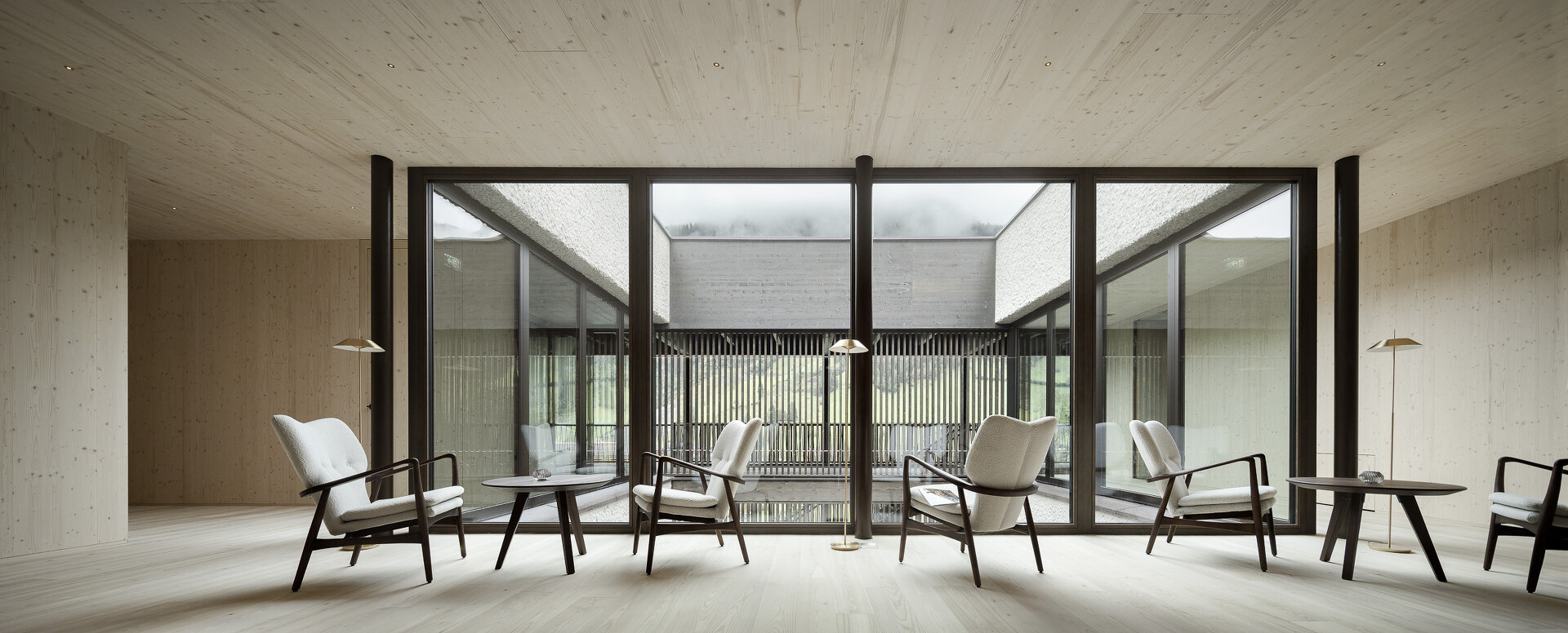 Die Materialität - Stein und Beton im Nassbereich und Holz im Ruhebereich - erzeugt durch differenzierte Oberflächenstrukturen und einer entsprechenden handwerklichen Verarbeitung eine Ästhetik, die durch eine unaufdringliche Atmosphäre und einen unverwechselbaren Charakter besticht. Die Reduktion auf das Notwendige und das Besinnen auf das Wesentliche geben dem Gast Raum für sich selbst und bieten eine Alternative zum gebauten Alltag der Tourismusarchitektur. (Text: Initiative Architektur nach einem Text der Architekten)
