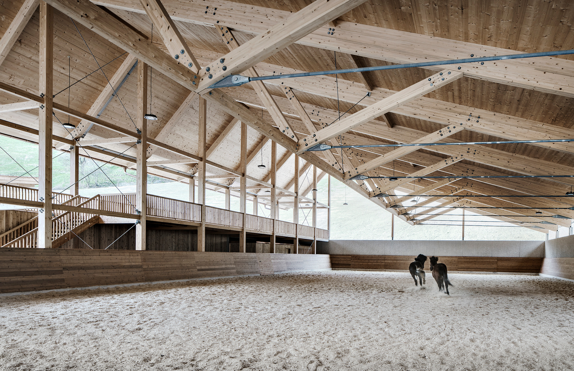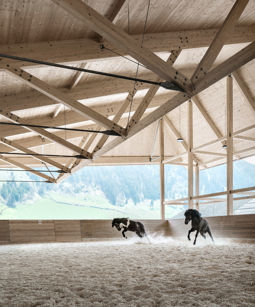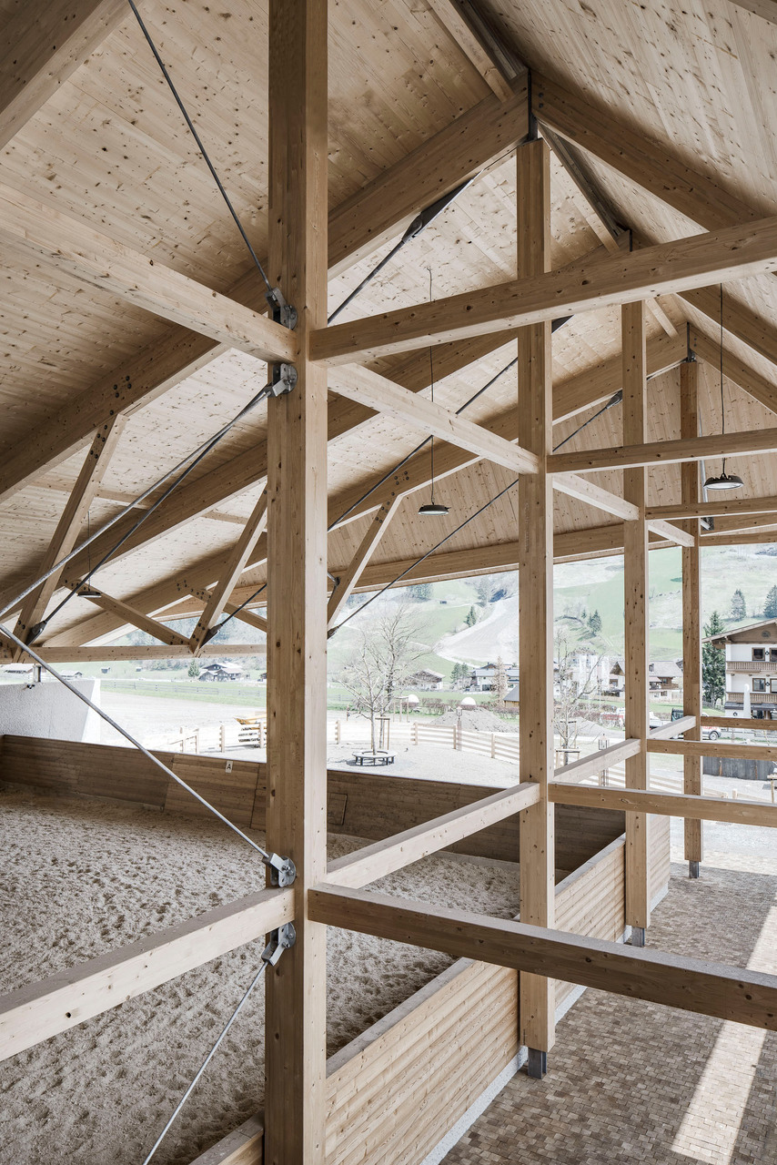 Dabei ist es gelungen die beträchtliche Dimension der Halle mit einer Reitplatzgröße von 20 x 40 Meter, einem Dach mit 27 x 43 Meter bei einer Firsthöhe von 12 Meter in die Landschaft zu integrieren. Über einem Sockel aus gespitztem Sichtbeton wurde ein nach allen vier Seiten hin offenes Holzfachwerk errichtet. Für Holzkonstruktion wurden ausschließlich heimisches Lärchen- und Fichtenholz verwendet. Dieses filigrane Konstrukt löst einerseits das Volumen auf und ermöglicht gleichzeitig einen 360°-Ausblick ins Großarler Tale. Ein tief herabgezogenes asymmetrisches Satteldach, das an der östlichen Stirnseite abgewalmt ist, gewährt die harmonische Einfügung ins Landschaftsbild. (Text: Roman Höllbacher)