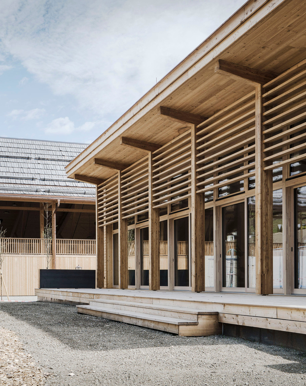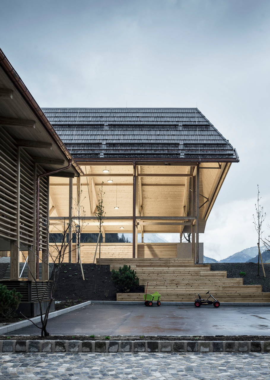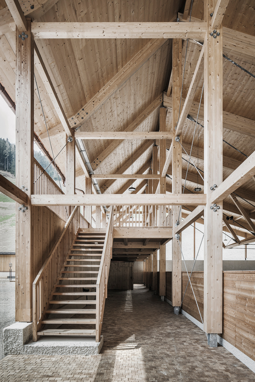 Dabei ist es gelungen die beträchtliche Dimension der Halle mit einer Reitplatzgröße von 20 x 40 Meter, einem Dach mit 27 x 43 Meter bei einer Firsthöhe von 12 Meter in die Landschaft zu integrieren. Über einem Sockel aus gespitztem Sichtbeton wurde ein nach allen vier Seiten hin offenes Holzfachwerk errichtet. Für Holzkonstruktion wurden ausschließlich heimisches Lärchen- und Fichtenholz verwendet. Dieses filigrane Konstrukt löst einerseits das Volumen auf und ermöglicht gleichzeitig einen 360°-Ausblick ins Großarler Tale. Ein tief herabgezogenes asymmetrisches Satteldach, das an der östlichen Stirnseite abgewalmt ist, gewährt die harmonische Einfügung ins Landschaftsbild. (Text: Roman Höllbacher)
