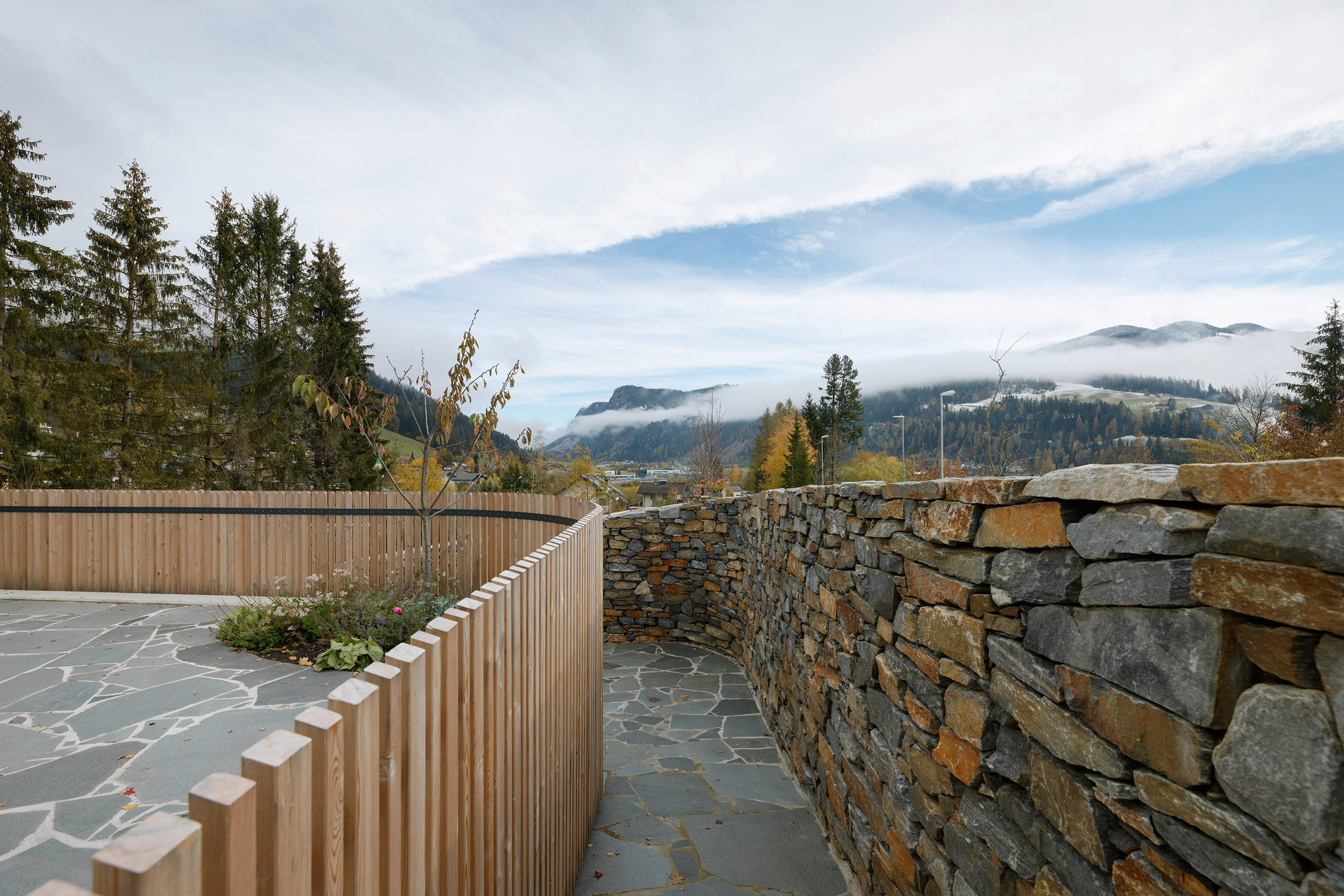 Die neuen Steinmauern bestehen aus ca. 180 Tonnen „Salzburger Blau“, einem regionalen Naturstein aus dem Steinbruch in St. Michael im Lungau, und wurden in sorgfältiger Handwerksarbeit errichtet. Eine sorgfältige Auswahl an heimischen Gehölzen, darunter alte Pongauer Obstsorten, 25 zusätzliche Laubbäume, 90 Sträucher sowie Wildstauden, verwildernde Blumenzwiebeln und handgemischte Aussaaten bilden den landschaftsgestalterisch wertvollen Bestandteil des Grüngürtels rund um die mittelalterliche Altstadt und ersetzen die vormals überwiegende Monokultur. (IA, nach einem Text der Architekten)