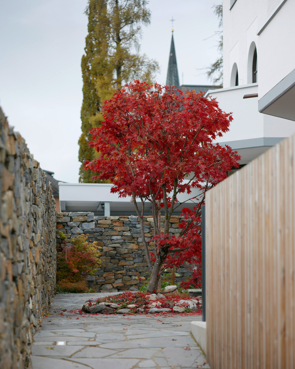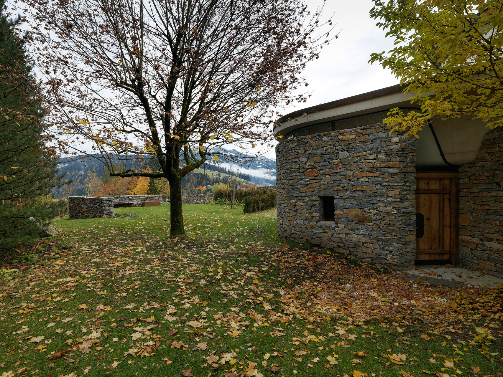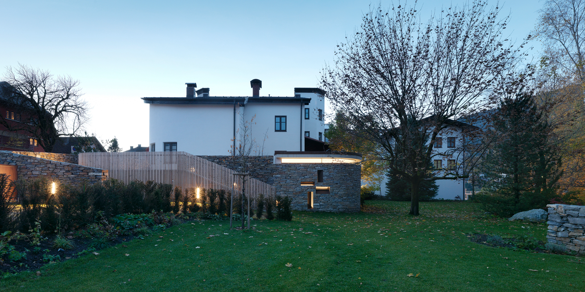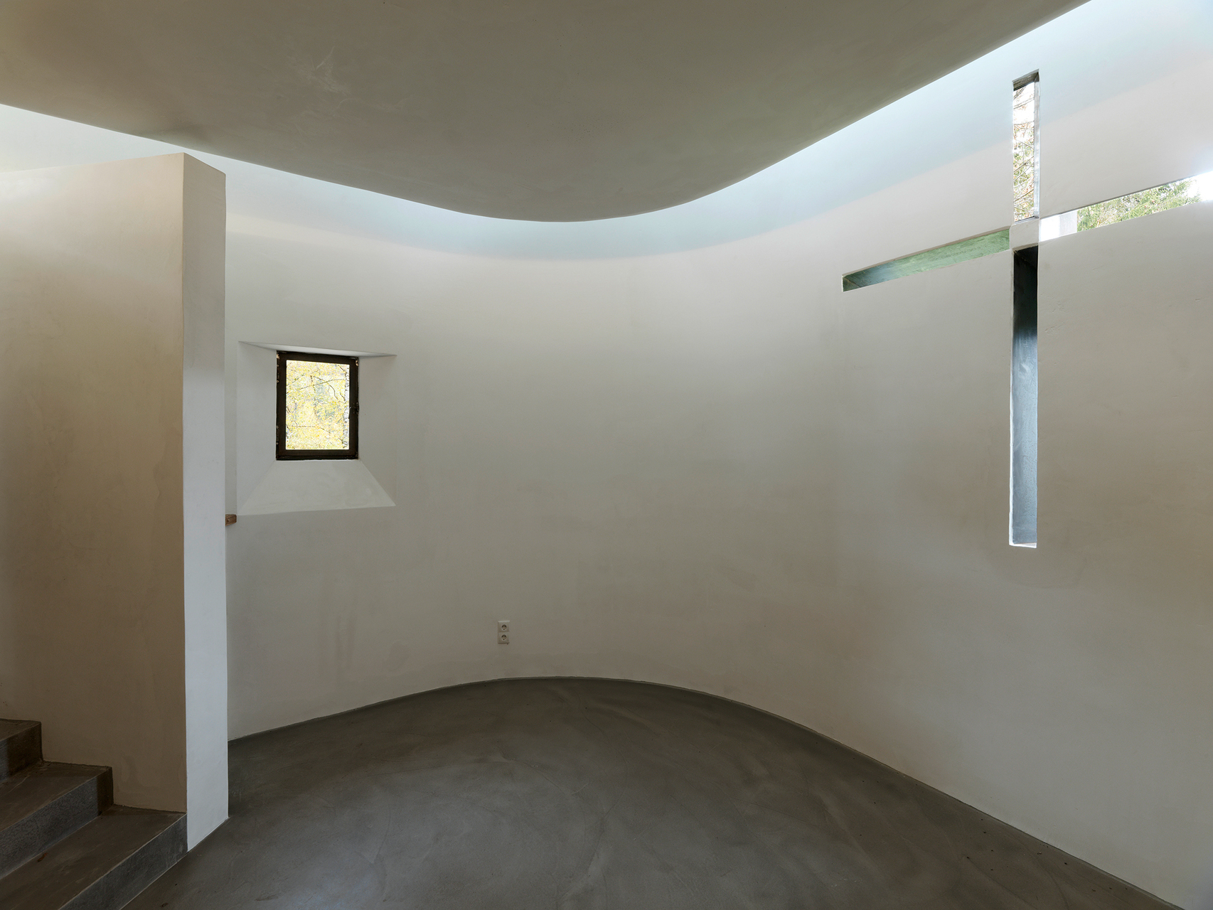Eine Abfolge von geschützten Außenräumen und Terrassen bietet Platz für vielfältige Nutzungen. Die Innen- und Außenbeziehung von Haus und Garten ist von weichen Übergängen bestimmt. Unter einer erweiterten Terrasse liegt die Kapelle. Ein bestehendes, geschwungenes Sichtmauerwerk wurde hier vom Außen- zum Innenmauerwerk. Dieses wird durch eine neue Naturstein-Stützmauer umschlossen und bildet so den Innenraum der Kapelle. Die Brüstung der darüberliegenden Terrasse wurde zur schwebenden Decke hochgezogen, wodurch ein weicher Lichteinfall entsteht. Kreuzförmig angeordnete Lichtschlitze orientieren sich mit unterschiedlichen Leibungswinkeln nach außen. Der dadurch entstehende, durch den Tages- und Saisonrhythmus sowie durch die Witterung beeinflusste Lichteinfall bestimmt maßgeblich das Raumempfinden in der Kapelle.