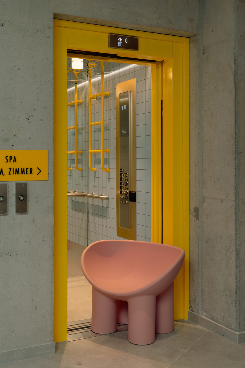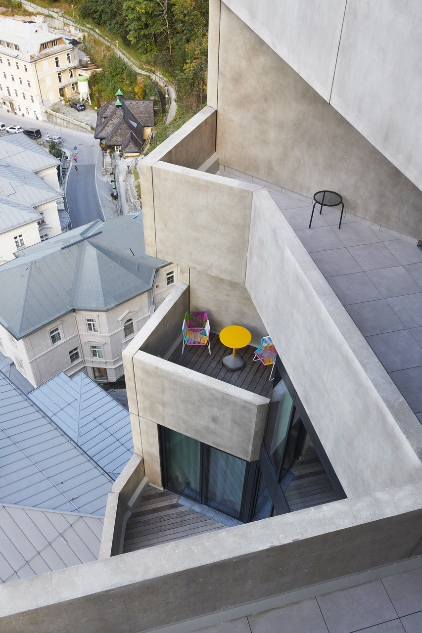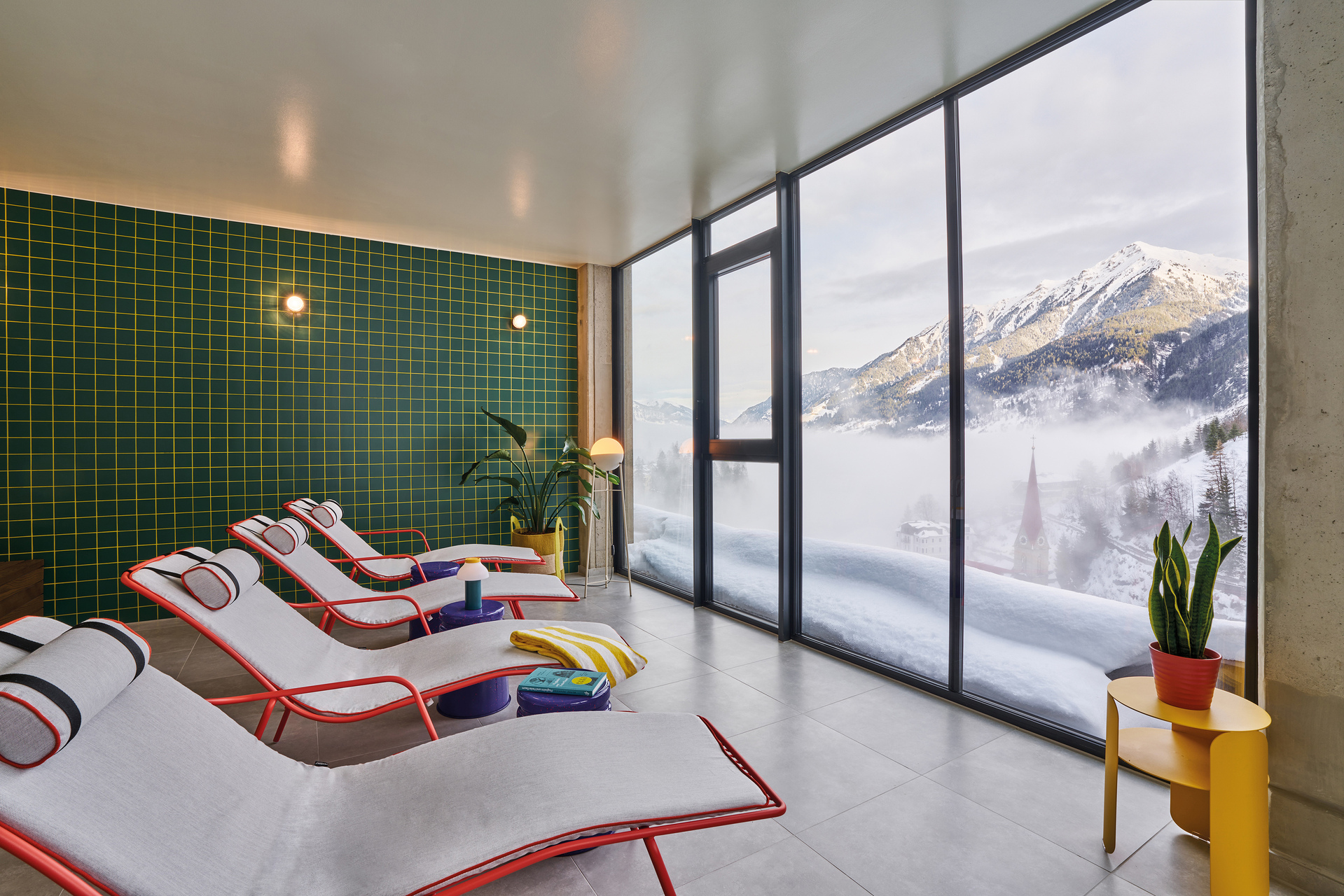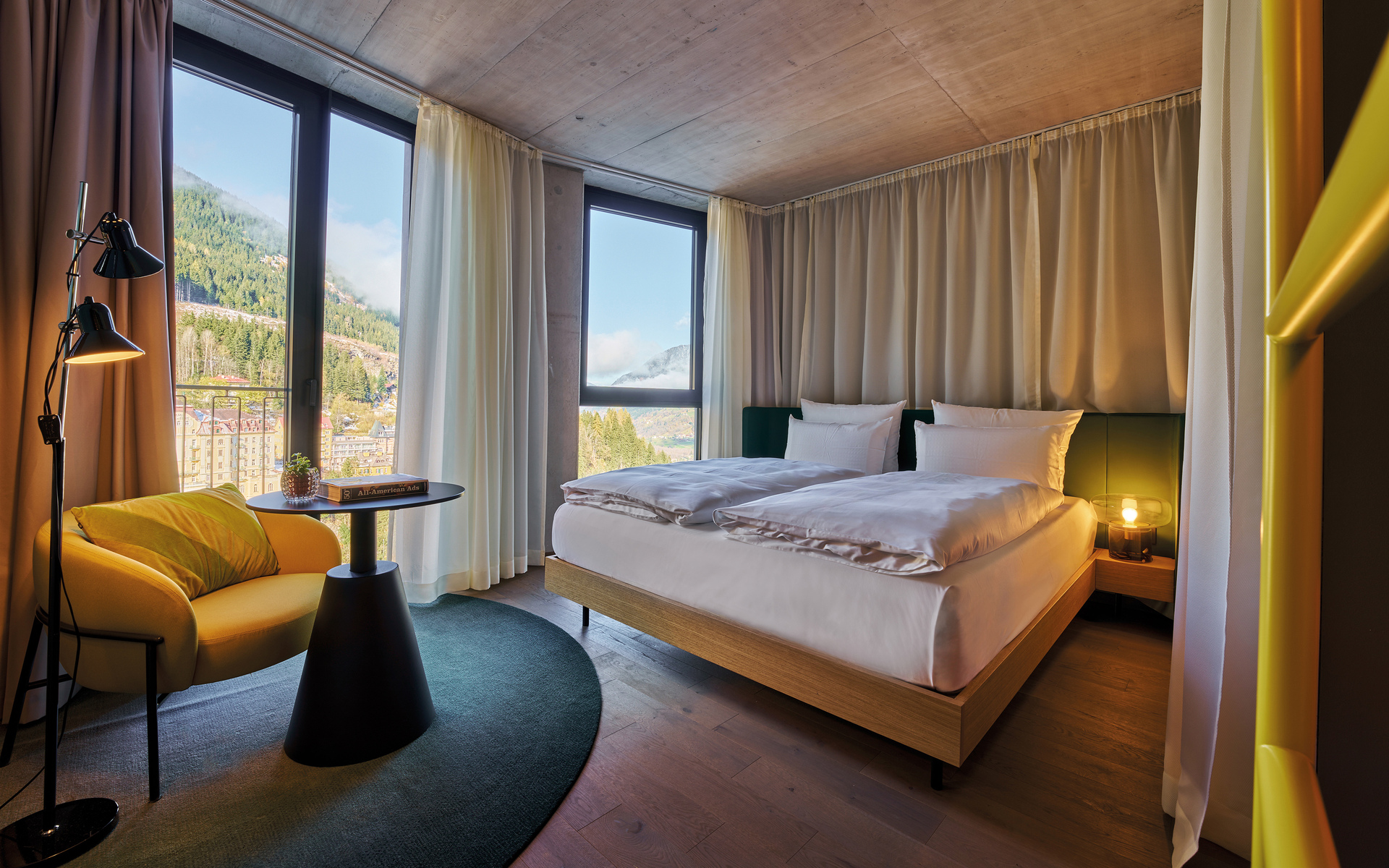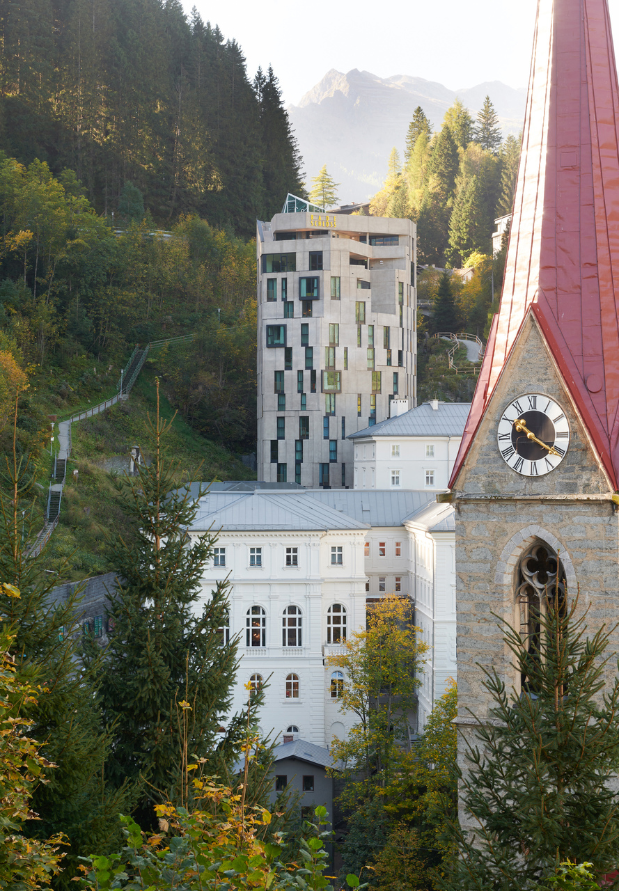 Die Kombination aus nostalgisch aufgeladenen Interieurs der Belle Epoque, filmreif inszenierten Willkommensgesten am Empfangs-Desk und zeitgemäßen Ansprüchen der Gäste wird vielfach auf die Spitze getrieben. Die Hotelzimmer bieten ein prickelndes Angebot für unsere Wellness-getrimmte Gesellschaft. Mittels in den Fenstern platzierten Wannen kann man den spektakulären Blick über das Gasteiner Tal beim Baden genießen. Als sprichwörtlich krönender Abschluss befindet sich vom 11. bis im 13. OG ein über drei Geschosse reichendes Rooftop-Spa, das vom türkischen Bad, über die finnische bis zur heimischen Zirbenholz-Sauna jedes nur erdenkliche Schweißbad offeriert. Über einen Glas-Kristall, ein ferner Nachklang auf die Kuppelkonstruktionen des Gasteiner Kongresszentrums von Gerhard Garstenauer, gelangt man auf den Außenbereich. Dort erwartet den Badegast der ultimative Kick im angenehm temperierten Infinity-Pool hoch über dem weltberühmten Wasserfall von Gastein. (Text: Roman Höllbacher)