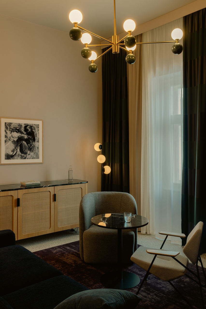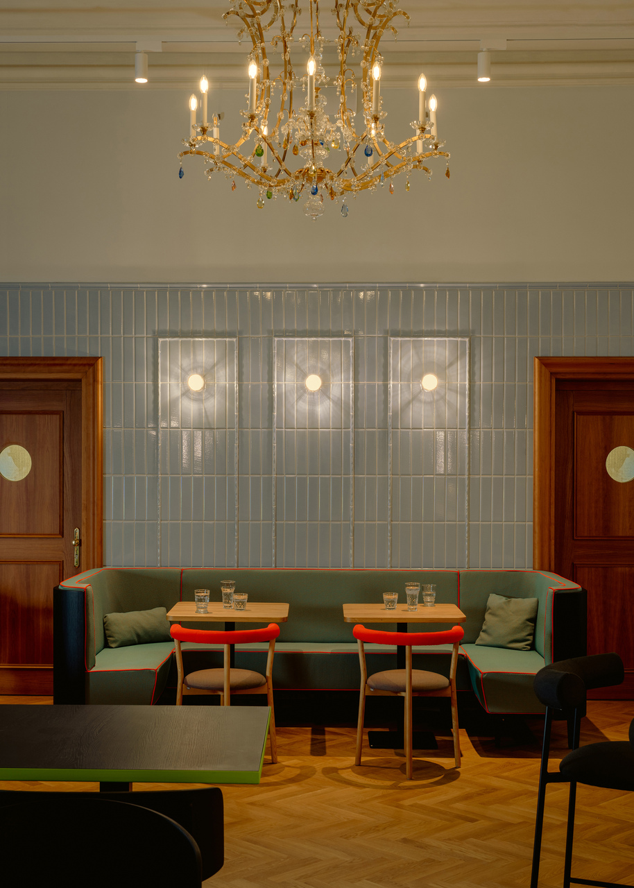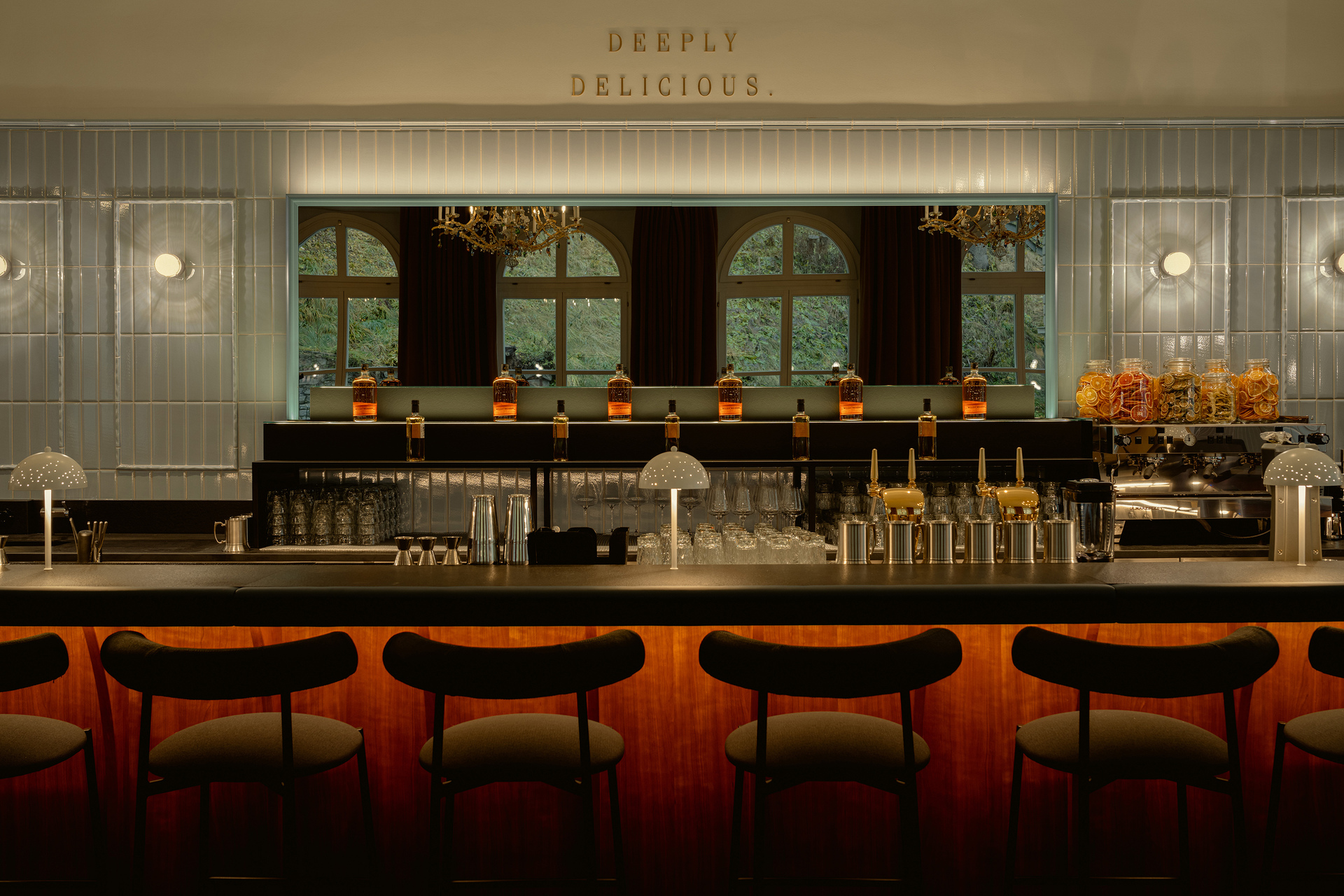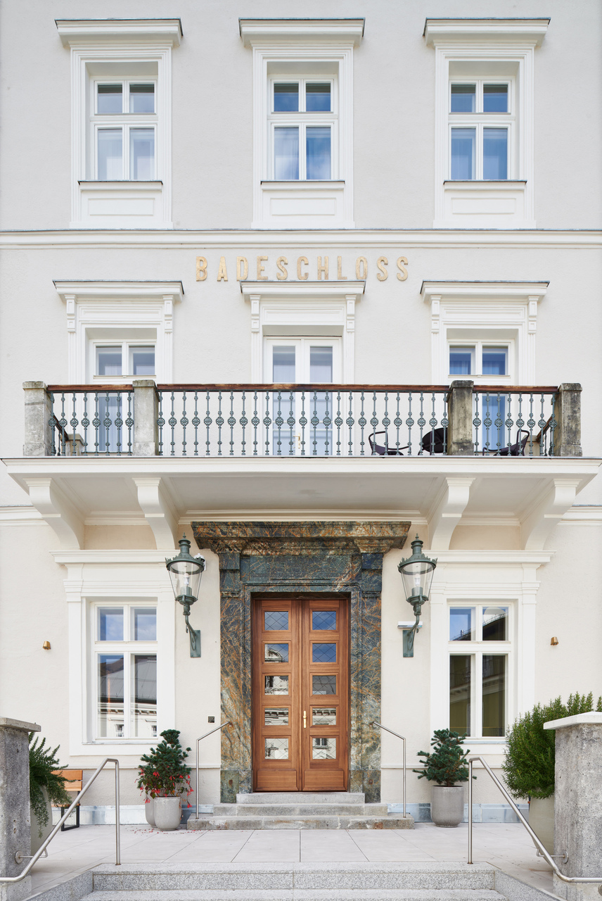 Das denkmalgeschützte Badeschloss wurde von den Architekt:innen auf vergleichbare Weise wie das gegenüberliegende Hotel Straubinger behutsam saniert und in enger Abstimmung mit den Denkmalamt wieder instandgesetzt. Schicht um Schicht wurde die Vergangenheit freigelegt, gesichert und behutsam mit neuen Elementen ergänzt. Noch vorhandene Lobmeyr-Luster wurden auf neuen technischen Stand gebracht, Massivholzböden fachgerecht saniert. Eine „neue Schicht“ wurde in erster Linie durch die Möblierung in die historischen Räume getragen. Im Altbestand wurden im Wesentlichen die Allgemeinbereiche – darunter Restaurant, Bar, Kaminzimmer, Lounge, Stube und Esszimmer – sowie sonstige den Hotelgästen zur Verfügung stehende Aufenthaltsbereiche untergebracht. Die zum Straubingerplatz blickende vorgelagerte Freiterrasse bietet 64 Sitzplätze und kann 365 Tage im Jahr gastronomisch genutzt werden.