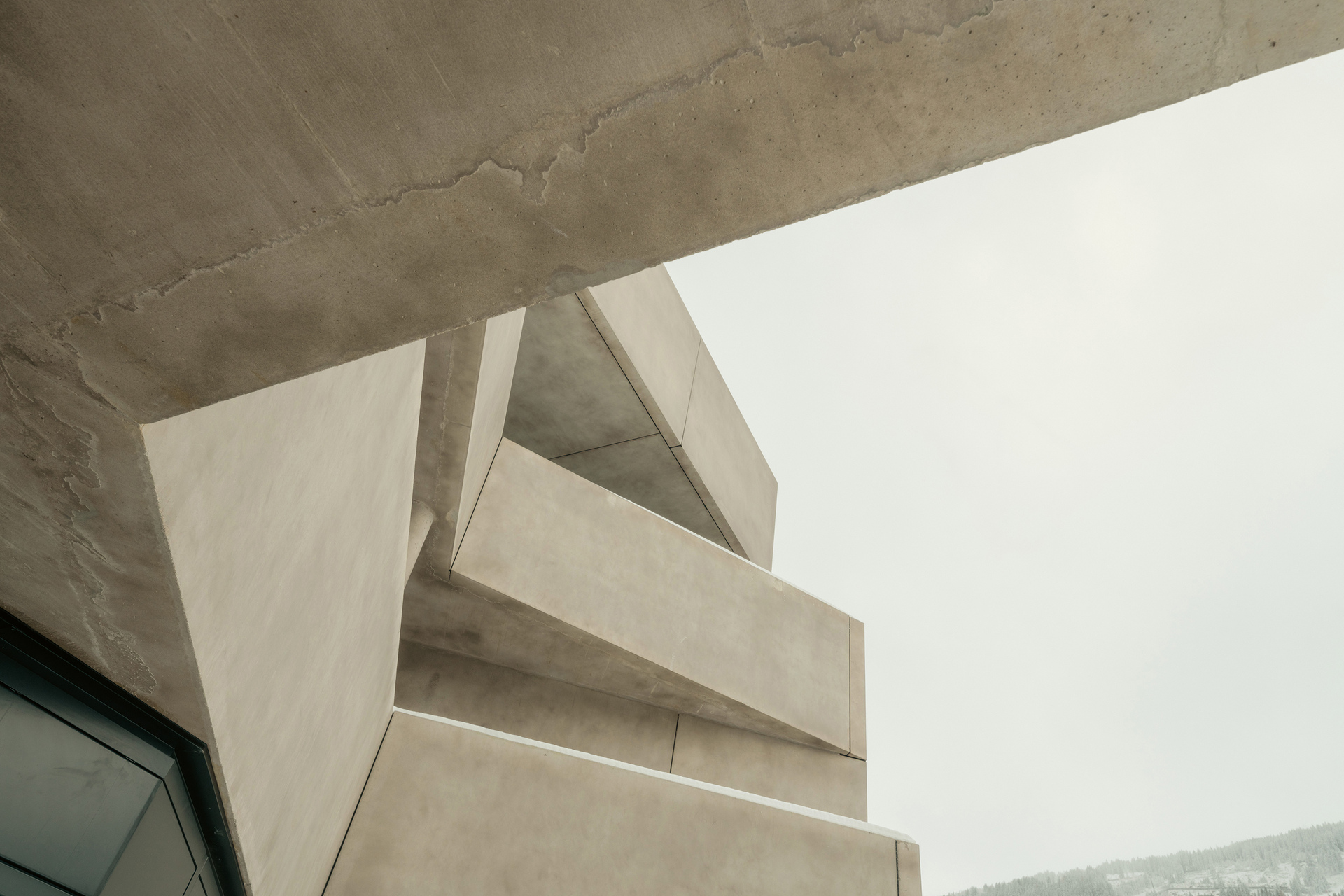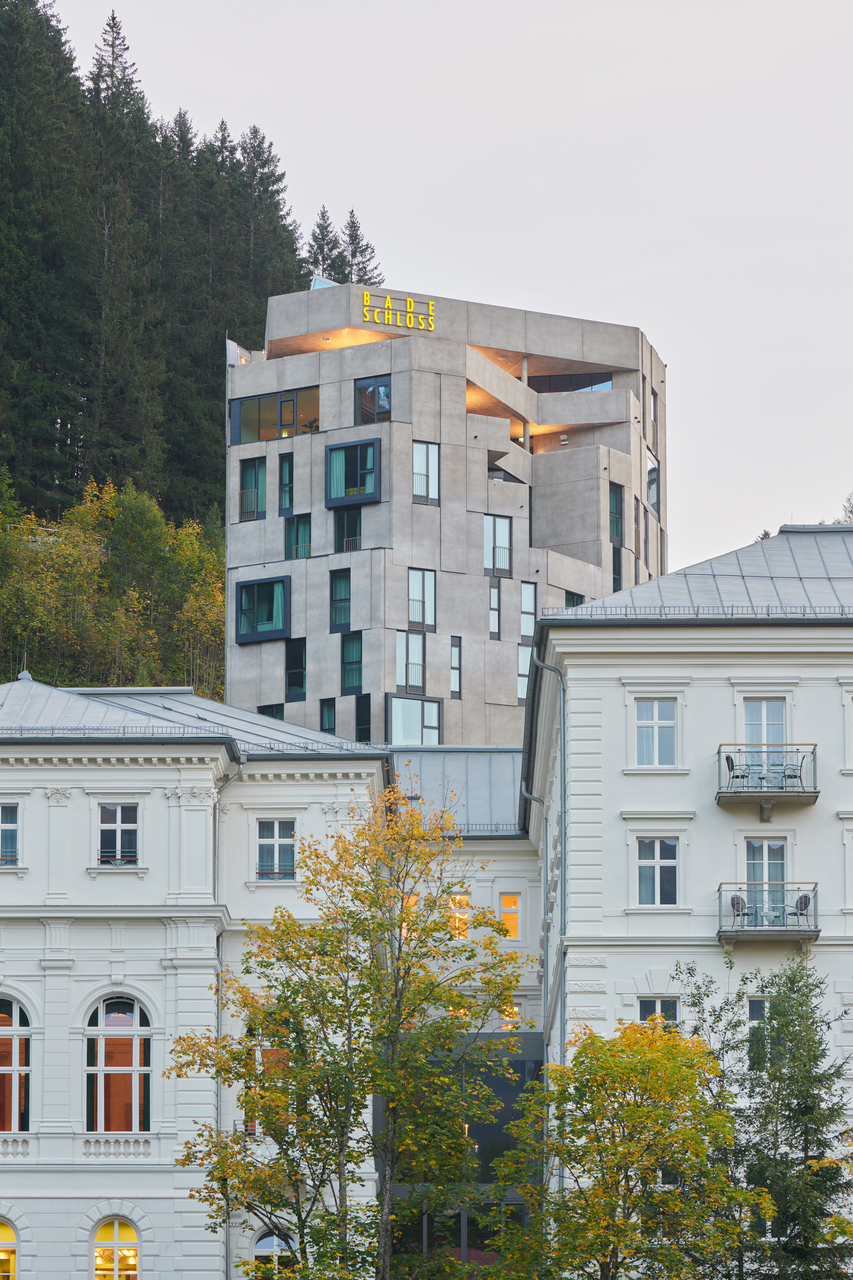 Um auch eine wirtschaftliche Führung des Betriebes zu gewährleisten, musste die Bettenkapazität deutlich angehoben werden, was nur durch eine Erweiterung hinter dem bestehenden Gebäude mit einem an den Hang gelehnten Neubau zu bewerkstelligen war. Die Fassade dieses neuen Hochpunktes wurde als zweischalige, gefärbte Betonkonstruktion ausgeführt. „Durch die unterschiedlichen Stärken der Schalen wird ein lebendiges Fassadenbild und ein reliefartiger Charakter erzeugt, welcher sich in die alpine Kulisse eingliedert“, so die Vertreter der BWM Architekten. Diese reliefierte, stark gegliederte Oberfläche des im Grundriss polygonalen Baukörpers und die in unterschiedlichen Grigio-Tönen gehaltenen Sichtbetonelemente bestätigen diese Ansicht. Die während der Planungsphase von Kritiker:innen des Vorhabens geäußerte Befürchtung, dass der Neubau das Ortsbild stören wird, ist auch im Angesicht der enormen Dimensionen der Hotelneubauten der Gründerzeit in Bad Gastein nicht eingetreten.