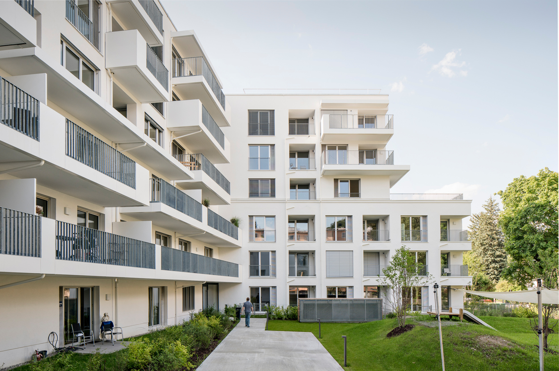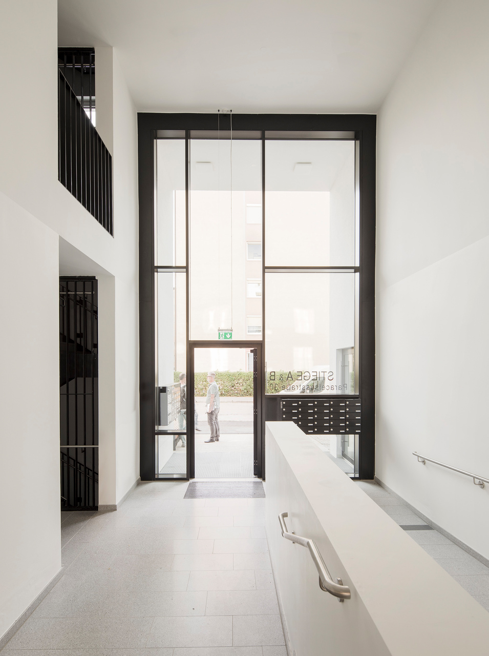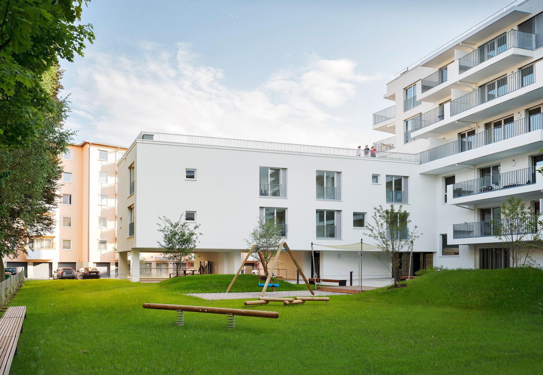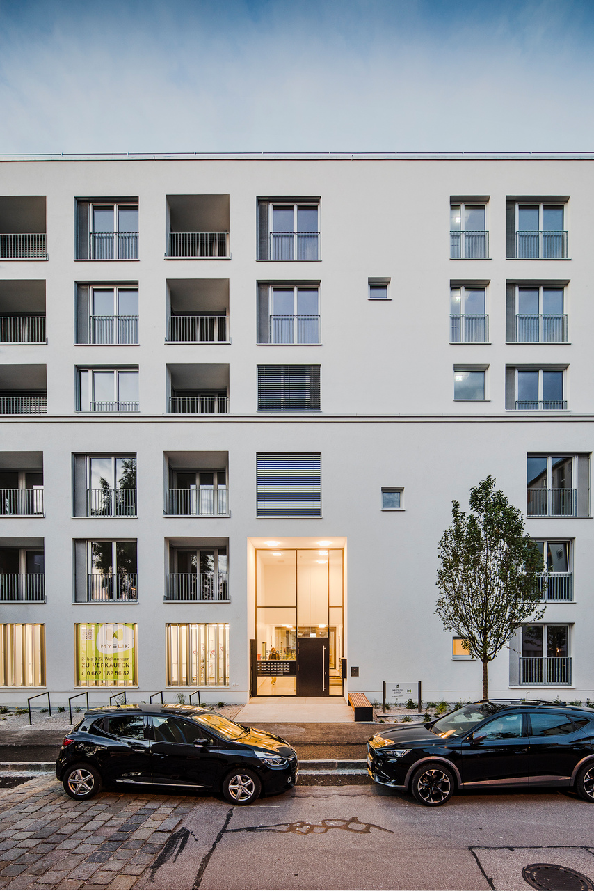 Hohe Portalöffnungen markieren die Zugänge zu den doppelgeschossigen Eingangshallen, über die die Wohnanlage erschlossen wird. Diese überzeugt nicht nur durch die Präsenz des Baukörpers im Stadtraum und die erwähnten gestalterischen Motive, sondern auch durch viele Details. Dazu zählen der sorgfältig gestaltete Außenraum entlang der Paracelsusstraße mit einer Baumreihe als grünem Filter, aber auch die jeweils unmittelbar im Eingangsbereich situierten, hochwertigen Fahrradgaragen oder der Dachgarten im 3. OG, der den Bewohner:innen dieser innerstädtischen Oase für „urban gardening“ zur Verfügung steht. Die hohe handwerkliche Qualität der Details ist neben der versierten Planung wohl auch einer gelungenen Mischung aus geförderten Miet- und frei finanzierten Eigentumswohnungen zuzuschreiben, von der letztlich das gesamte Quartier profitiert. (Text: Roman Höllbacher)