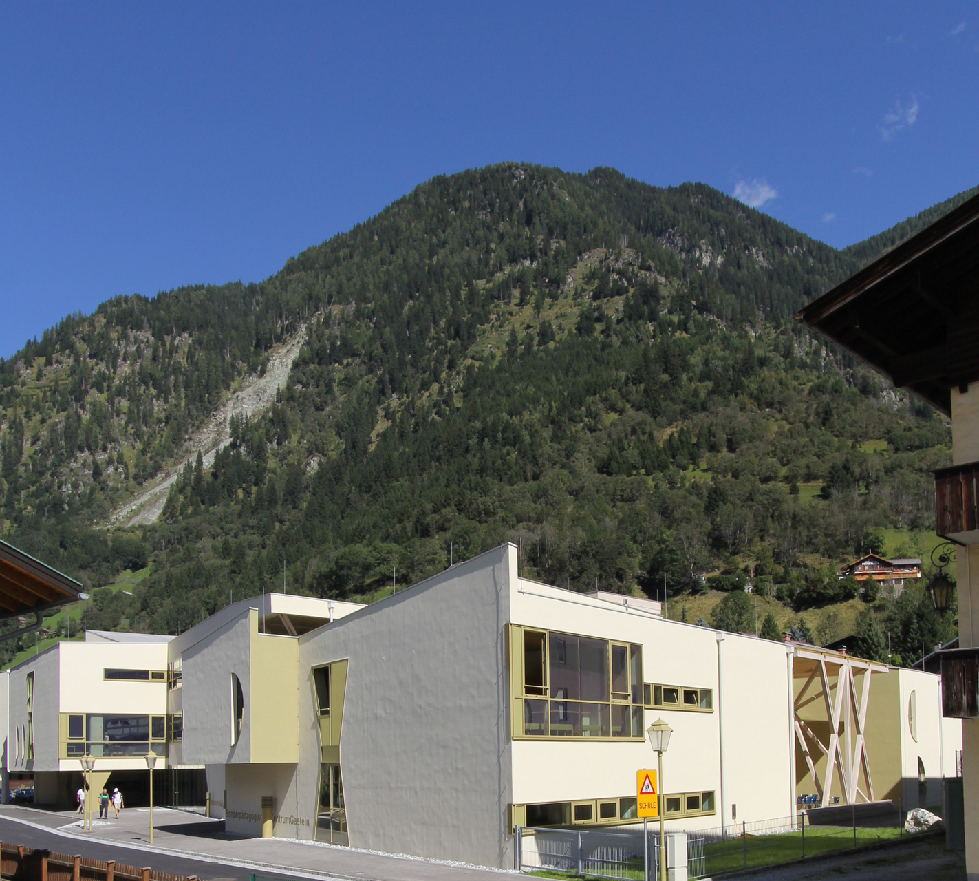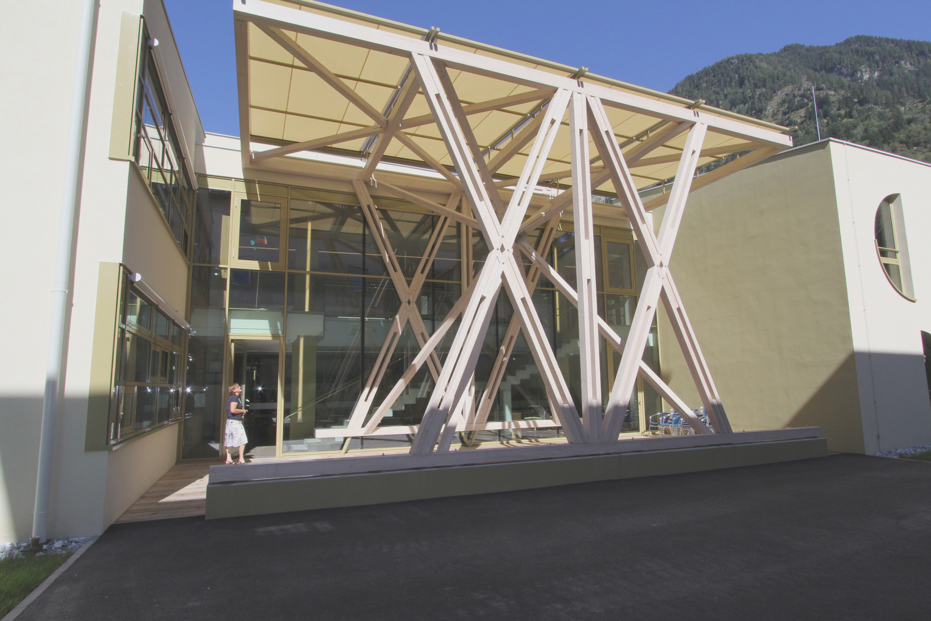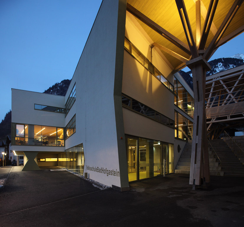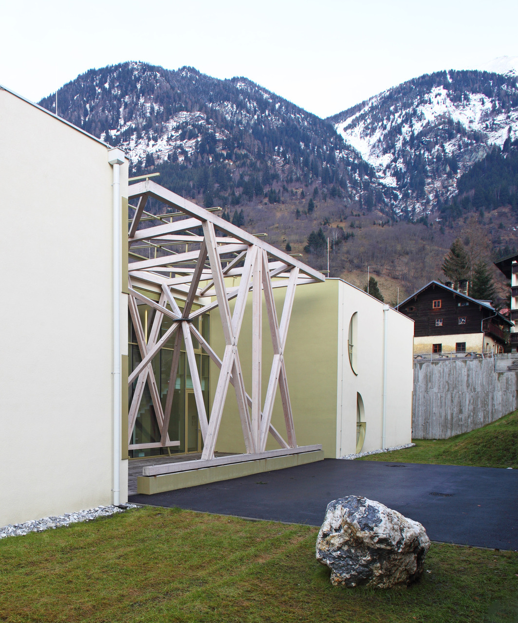 Die Holzkonstruktion nimmt bewusst Bezug auf historische Bautypologien der Region - etwa Heustadl, Trockenspeicher oder Schober - und interpretiert deren einfache Konstruktionsweisen in zeitgemäßer Form. Sie kommt unter anderem beim Vordach, der Loggia, der Laube und dem Terrassenvordach zum Einsatz. Die Konstruktion vermittelt zwischen Innen- und Außenraum und trägt als verbindendes Element zur räumlichen Einheit von Volksschule und SPZ bei.