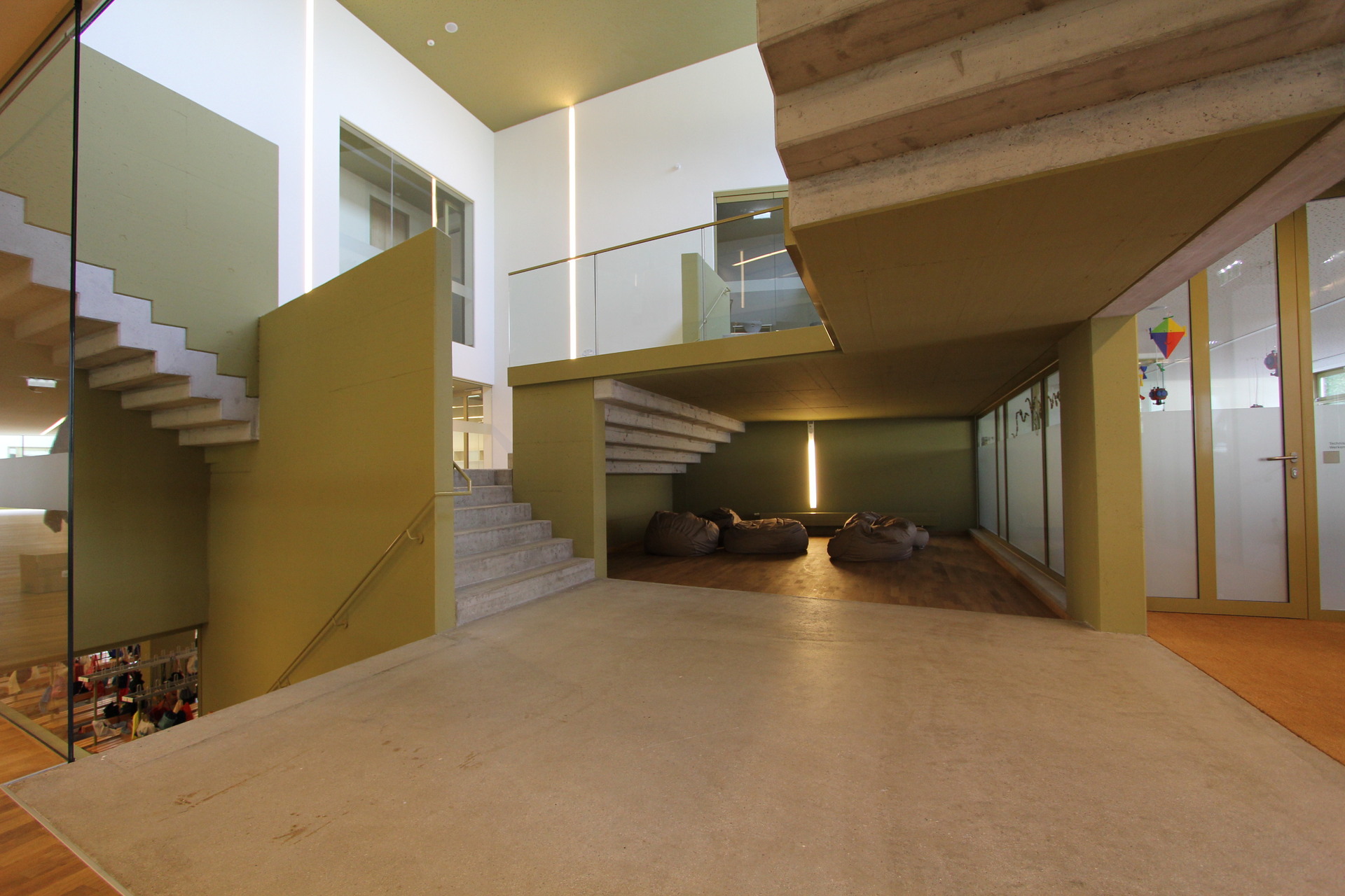 Die Sporthalle ist zwischen den beiden Baukörpern in den Hang eingebettet und mit beiden Schulen verbunden. Durch die Integration von Einrichtungen wie dem Musikum und einer Tagesbetreuung wird eine temporäre öffentliche Nutzung über den Schulbetrieb hinaus ermöglicht. (Text: Initiative Architektur)