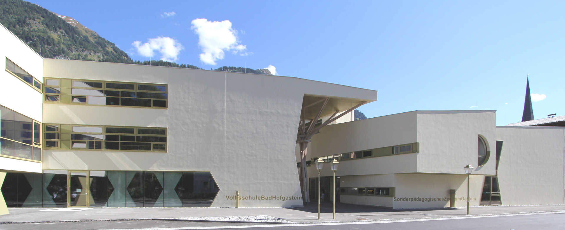 Der witterungsgeschützte Eingangsbereich wird durch ein markantes, großflächiges Schulhofvordach markiert, welches von einer astförmig ausgebildeten Holzstütze getragen wird. Von hier aus erfolgt der Zugang zur nördlich gelegenen Volksschule und dem südlich anschließendem SPZ.