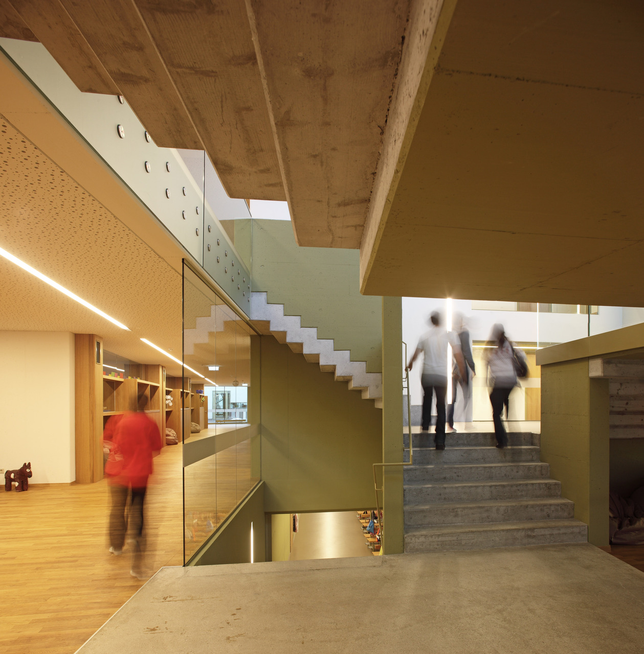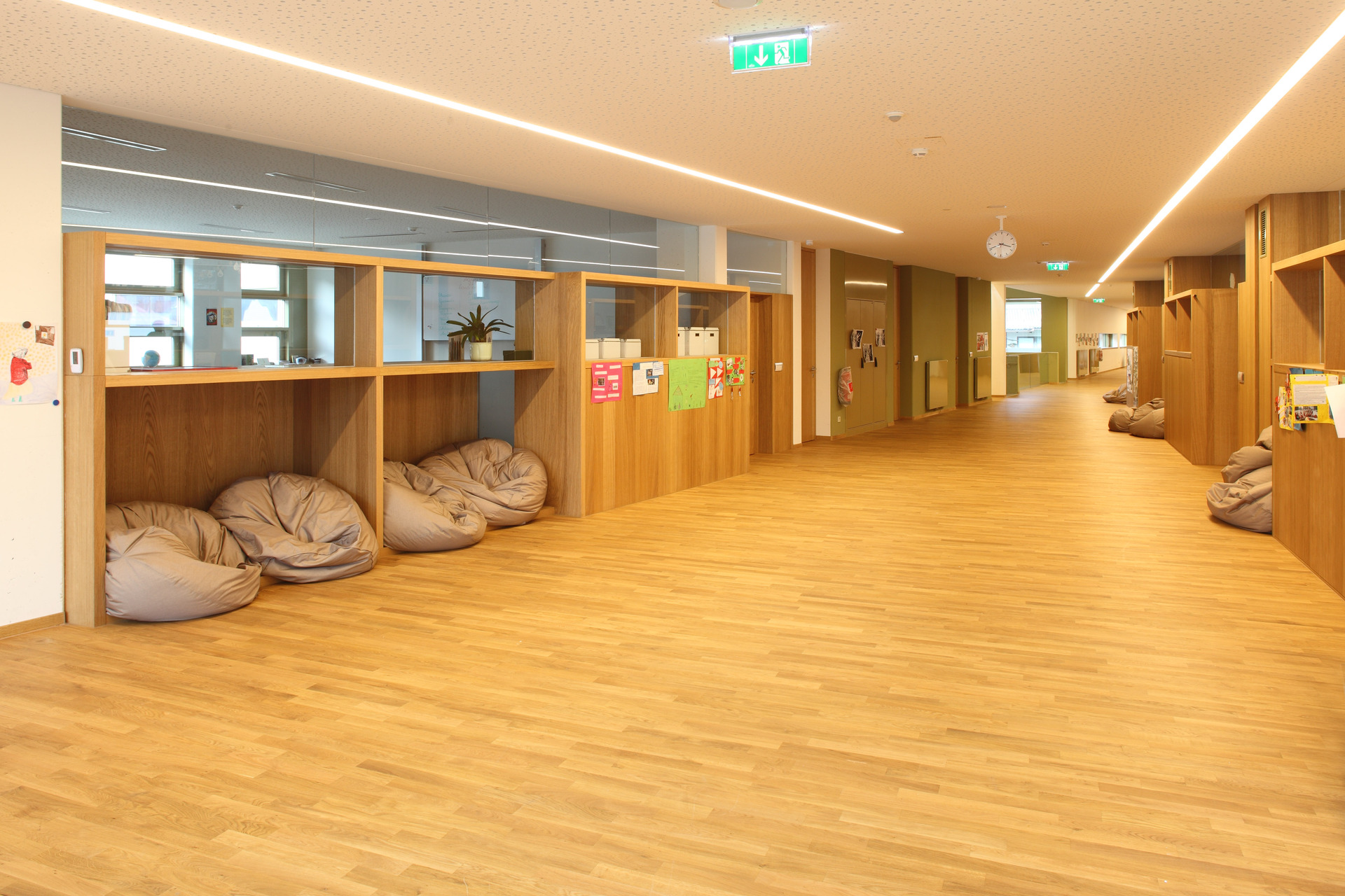 Die Erschließung der Volksschule erfolgt seitlich über den Garderobenbereich und führt in eine offene Treppenlandschaft mit Plattformen, Nischen und Rückzugsorten. Von dort gelangt man in einen konisch geformten, offenen Flur im Obergeschoss, der zugleich als Aufenthaltsbereich und als Haupterschließung der Klassenräume dient. Diese sind durch schulterhohe Raumteiler mit integrierten Sitznischen und pädagogischen Fenstern vom Aufenthaltsbereich abgegrenzt. Dadurch entstehen einerseits Klassen, die ein konzentriertes Lernen ermöglichen, andererseits bleibt der Bezug zur gemeinschaftlich genutzten Pausenzone erhalten.