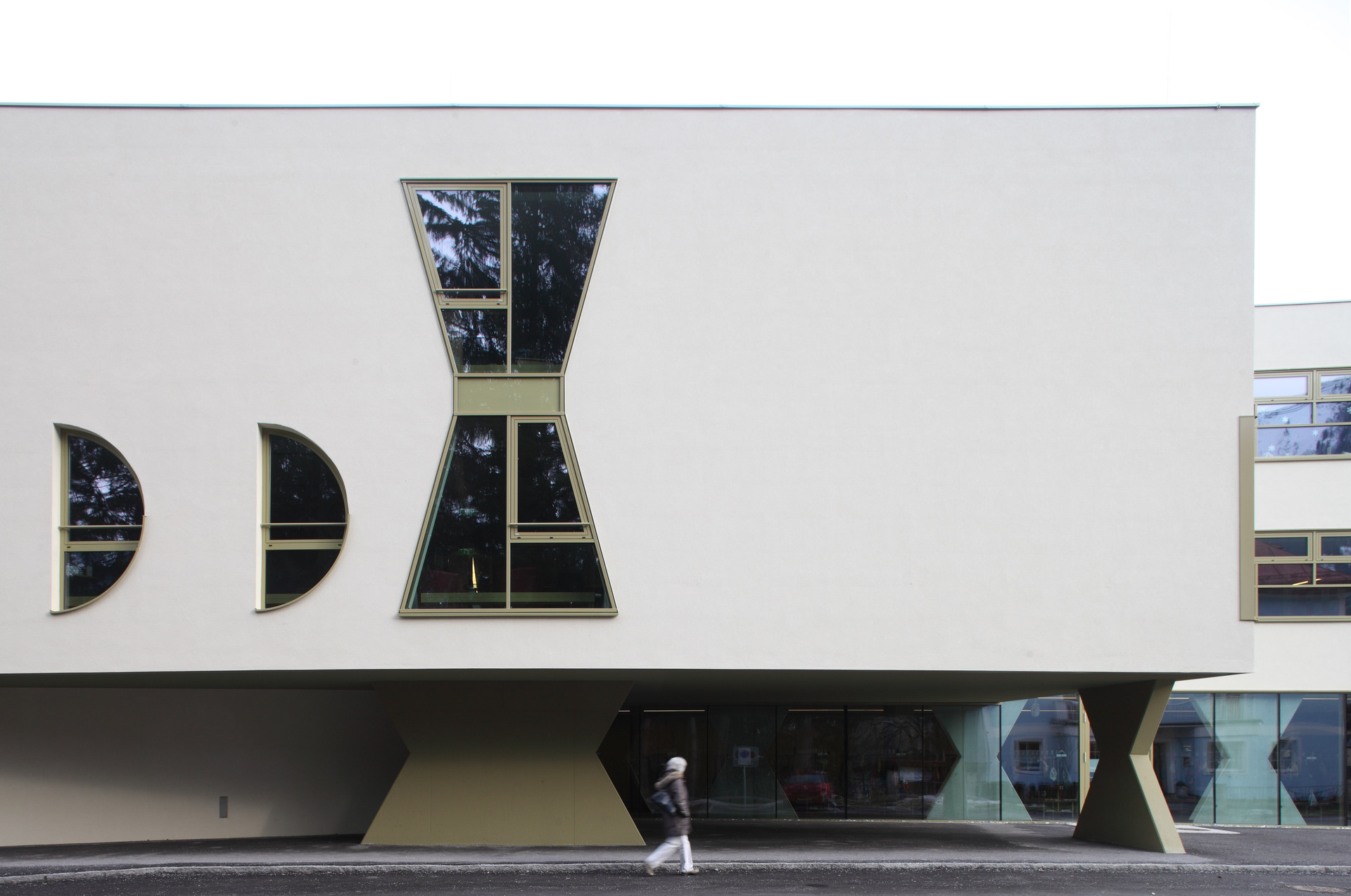 Durch die versetze Anordnung der Baukörper und die topografische Staffelung ergibt sich zur Schulstraße hin eine räumlich abwechslungsreiche Straßenfront. Einzelne Fassadenabschnitte werden durch Auskragungen, Rücksprünge und überdachte Bereiche gegliedert und werden durch unterschiedlich große, teils polygonal, halbkreis- oder trapezförmig geformte Fensteröffnungen betont.