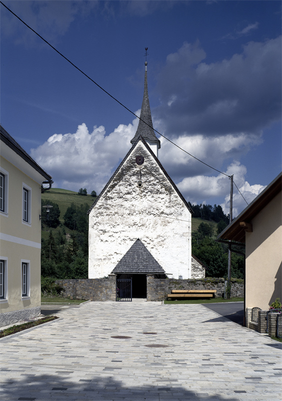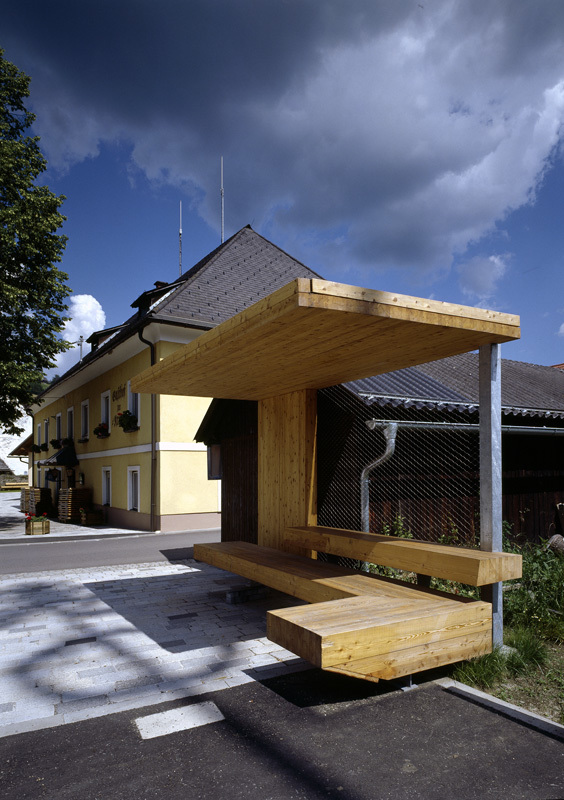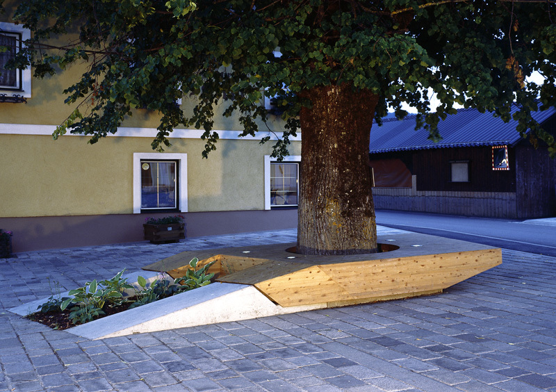 Bestehende Einbauten des Dorfplatzes wurden entfernt, die notwendigen Flächen zur Erweiterung von der Gemeinde zur Verfügung gestellt. Zur Oberflächengestaltung dienten Asphaltbeläge und Wiener Würfel, sämtliche multifunktionale Einbaumöbel wurden aus Fichtenleimholz ausgeführt. Nun bestimmen zeitgemäße Sitzbänke, Baumumrandungen und eine Bushaltestelle aus warmen Holz das Bild, sämtliche Elemente können vielfältig bespielt, die Parkplätze gleichzeitig als Sportfläche für Basketball, Eishockey oder Rollerblasen genutzt werden. panek/steinmetz