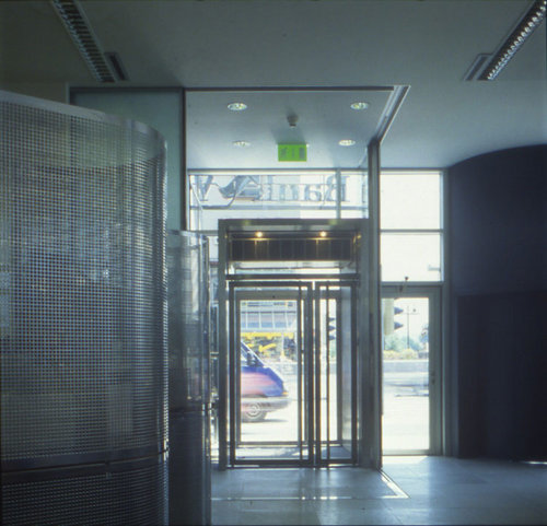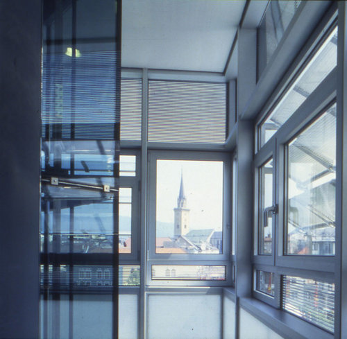 Die spiegelnde Fassadenhaut mit den Schattenlamellen unterspielt den Maßstab noch mehr. Der über Eck „ausgebissene“ Eingang mit dem massiven Schaft des Aufzugs (trägt auch die Auskragung darüber) setzt der Abstraktion der Hülle den plastischen Akzent entgegen. Spezielles Detail: an vorderster Stelle macht eine Vertikalverglasung die Bewegung des Aufzuggewichtes sichtbar. Schöne Einbindung in die tieferliegende Flusspromenade. (Text: Otto Kapfinger)