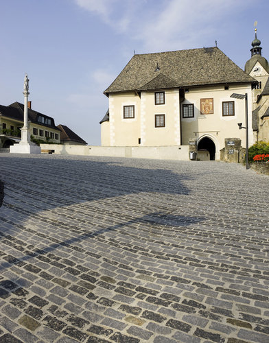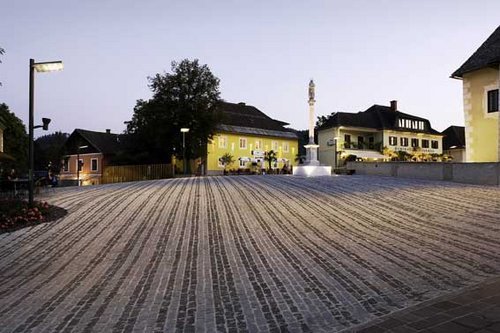 „kultur.schichten“ ist das Thema, mit dem das Architekturbüro nonconform die historische Komplexität und die Vielfalt der Geschichte Maria Saals aufgreift und sich dabei der Methode der Stratigrafie bedient - dem Untersuchen der Abfolge von Kulturschichten. Ein Spaziergang über den Ortsplatz wird zur geschichtlichen Entdeckungsreise. Der Platz verschmilzt zu einer zusammenhängenden Fläche und bildet mit den Gebäuden eine harmonische, wirkende Einheit. Verschiedenfarbige Steinriemen sind in einer gleichförmigen Linienstruktur verlegt. Diese Linien bilden wie die Jahreslinien eines Baumstammes die geschichtlichen Ereignisse Maria Saals ab.