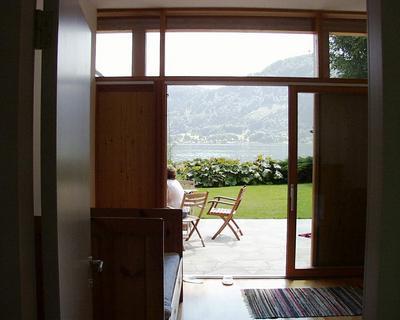 Neben dem Wohnraum sind 2 Schlafräume, ein Badezimmer und Nebenräume im Neubau untergebracht. Der Zwischentrakt beinhaltet eine Küche, und im Altbestand ist ein zusätzliches Esszimmer, Gästezimmer und im OG ein Schlafraum untergebracht. Durch die beiden Baukörper wird südseitig eine windgeschützte Terrasse möglich, welche in direkter Verbindung zum See steht.