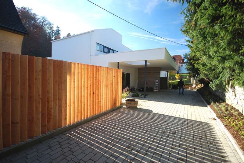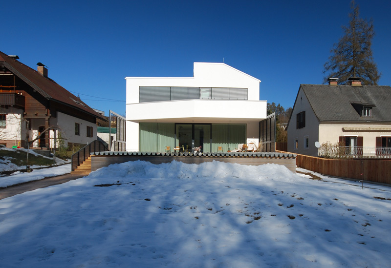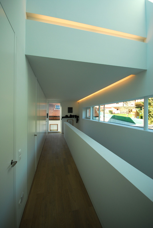 Der durch das im Süden liegende Waldgebiet entstehenden verfrühten Verschattungsproblematik (einerseits durch die Höhe der Bäume bzw. aufgrund der ansteigenden Topographie) wird insofern entgegengearbeitet, als ein Oberlichtband im Dach eingeführt wird, welches das Licht indirekt ins Ober- und auch Erdgeschoss