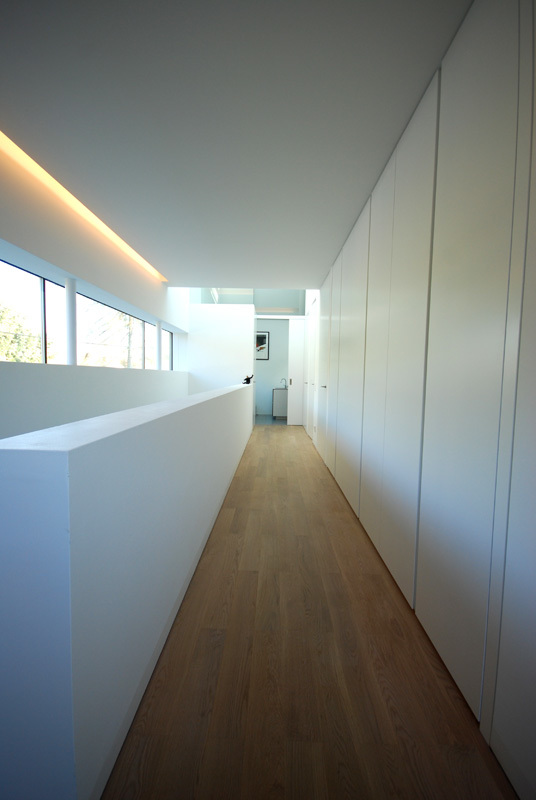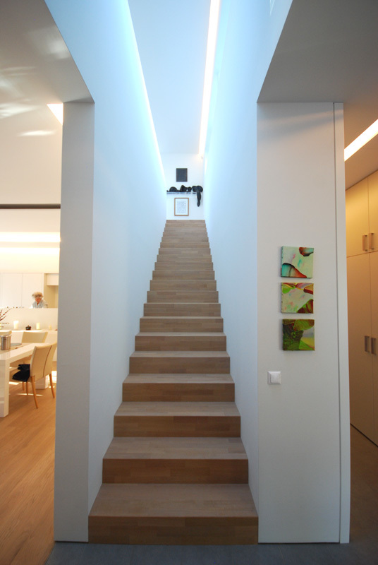 Die durch die kontrollierte Wohnraumlüftung notwendige abgehängte Decke wurde weiters zur Integration einer indirekten Beleuchtung herangezogen. Die fixverglasten Flächen wurden größtenteils rahmenlos eingebaut. (Text: Architekten)