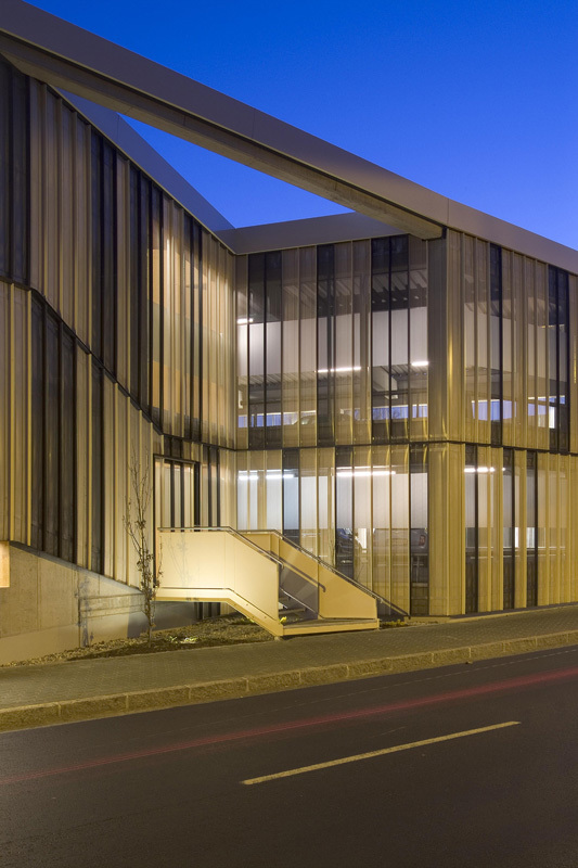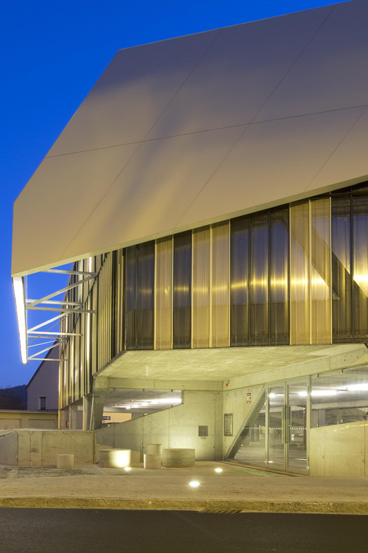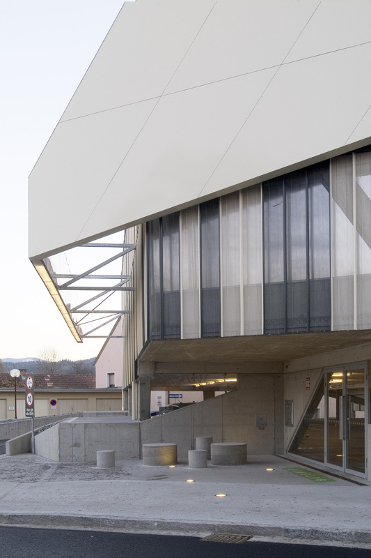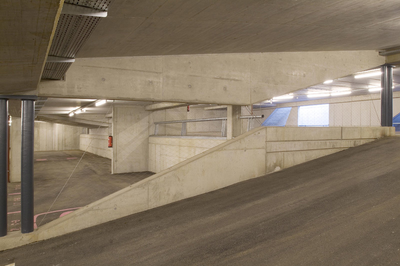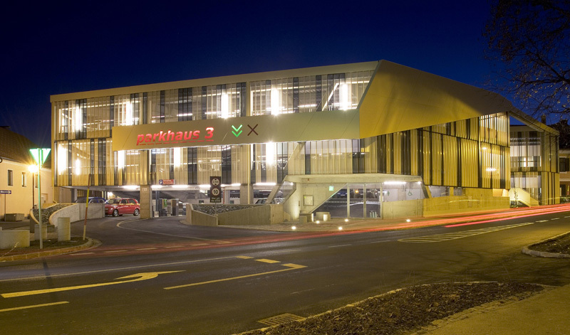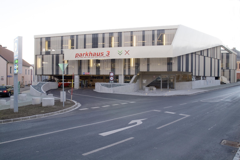 Im Zufahrtsbereich steigt das Parkhaus (173 Stellplätze:) auf drei Geschosse an, wodurch der Vorplatz betont, die Zufahrt unterstrichen und auf die angrenzende 3-geschoßige Bebauung reagiert wird. Durch den Einsatz des Split-Level-Systems wird auf den natürlichen Geländeverlauf reagiert. Eine wesentliche Besonderheit des Projektes ist die absolute Übersicht beim Befahren der Rampen und umgekehrt der völlige Einblick in die Rampen, was durch die Auflösung der tragenden Scheiben seitlich der Rampen in Doppelstahlstützen gelungen ist.