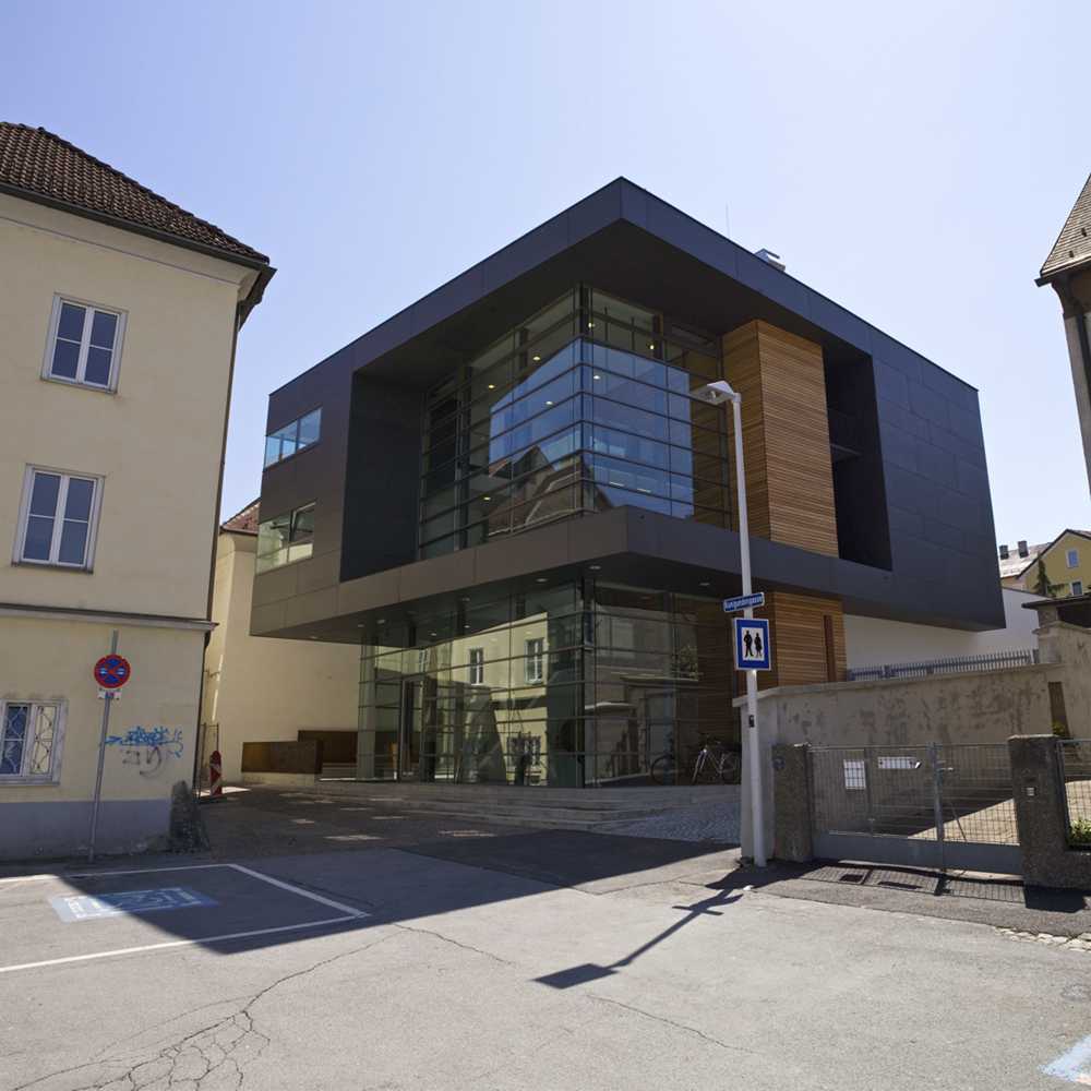 Die Außenhülle ist bewusst aus matten anthrazitfarbenen Platten und Glasflächen gewählt, damit sich der Baukörper gegenüber seines massiv gebauten Umfeldes zurücknimmt - gleichzeitig jedoch auf Grund der zeitgemäßen Materialwahl seine Eigenständigkeit betont.