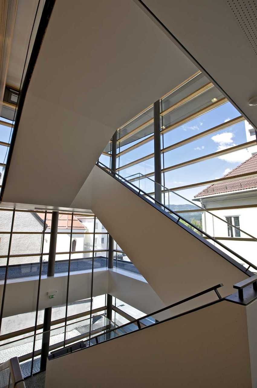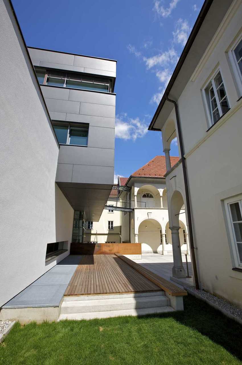 Die trichterförmige Öffnung zur Kunigundengasse leitet vom Burgplatz über eine abgetreppte Vorzone zum Haupteingang über und gibt gleichzeitig einen Einblick in den schönen Arkadenhof des Altbestandes frei.