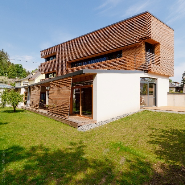 Das Gebäude stellt sich selbstbewusst - und gleichzeitig die städtebauliche Situation achtend - an die nördliche Grundstücksgrenze, verlegt die Zufahrt an die Westseite und minimiert somit den Störungseinfluss auf der südlichen Gartenfläche. Dabei spielt vor allem für den erdgeschossigen Teil die Zuordnung zum Außenraum und die mögliche barrierefreie Bewohnbarkeit eine wesentliche Rolle. Die eingeschnittene Terrasse wird mit vorgesetzen Holzlamellen-Schiebeelementen, die vor neugierigen Blicken schützen, zum Teil des Wohnraums.