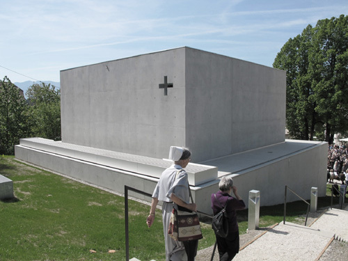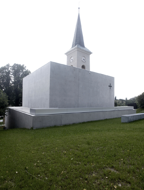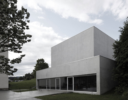 Die permanente Sammlung im Obergeschoß, ein überhöhter, zentrierter Raum, erschließen die einläufige Treppe und die Liftanlage räumlich diagonal positioniert an den Längsseiten. In der Sichtachse der Emporsteigenden fängt eine kreuzförmig gestanzte Luke den Blick. Sichtbeton, geglättete weiße Flächen und geschliffener Beton unterstreichen Homogenität und Charakter des Bauwerks, setzen äußere Radikalität in Form und Material im Innenraum fort. (Text: Marina Hämmerle)