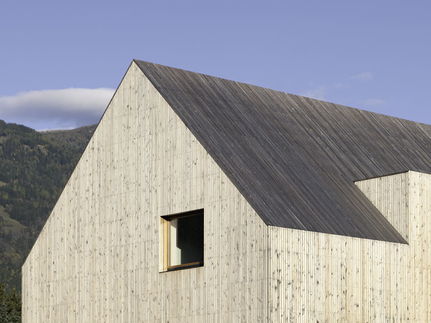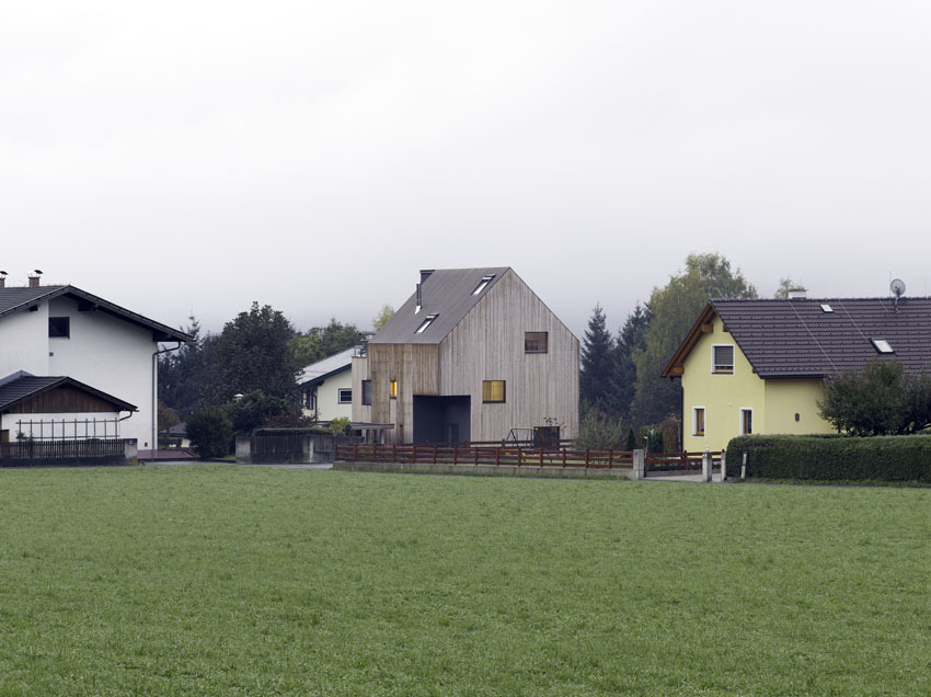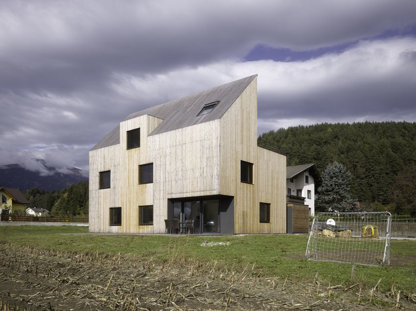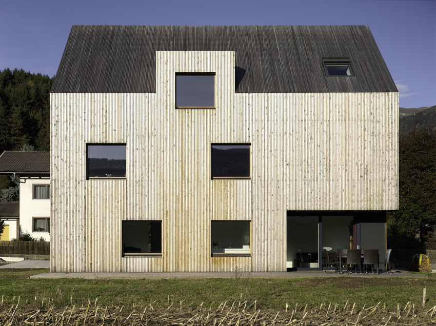 In einer kleinen Gemeinde am Millstätter See entstand auf einem grosszügigen Grundstück, umgeben von Feldern und Wohnbebauung dieses kompakte Haus für eine sechsköpfige Familie. Ziel des Entwurfs war es das neue Gebäude behutsam in die reizvolle Landschaft sowie die vorhandene kleinteilige Bebauungsstruktur einzubinden und das Haus allseitig zur alpinen Umgebung hin zu orientieren. Das moderne Giebelhaus ist ohne Keller auf drei Ebenen organisiert, es fügt sich in seiner schlichten Form und Grösse unauffällig in die heterogene Bebauung seiner Nachbarschaft ein, die sich aus teils neueren, teils älteren Häusern zusammensetzt. In Anlehnung an die ortstypischen Bauernhäuser, Scheunen und Ställe des Dorfes ist der Baukörper mit einer Lärchenholzschalung verkleidet.Was aus der Ferne zunächst als Holzskulptur in Erscheinung tritt, entpuppt sich bei genauerem Hinsehen als „schwarzer Monolith im hölzernen Gewand“. Erst von Nahem lassen sich die einzelnen Holzlatten an Fassade und Dach erkennen, die schmalen Fugen werden lesbar, der dahinter liegende schwarze Körper zeichnet sich ab. Mit skalpellhafter Präzision sind einzelne Elemente aus dem konventionellen Hauskasten mit Dachgaube herausgelöst. Auf diese Weise entstehen offene Zwischenraumbereiche wie Loggia, Terrasse und Eingangsbereich, die sich bis ins Haus hinein fortsetzten und fliessende Übergänge zwischen innen und aussen herstellen. Die drei Einschnitte geben das Innerste des Hauses Preis, sie legen den eigentlichen Monolithen frei. Dunkelgrau, fast schwarz treten die „Verletzungen“ in Erscheinung, konsequent von den verputzten Wänden und Decken, über die Profile der Verglasungen, das Eingangselement bis hin zu Geländer und Briefkasten sind alle Elemente in einheitlichem Schwarz gehalten. Erst jetzt wird klar, der minimalistische Körper mit seiner exakten Hülle und den gestochen scharfen Konturen ist tatsächlich ein Massivbau, bekleidet mit einem feinen, ihm auf den Leib geschneiderten Gewand aus Lärchenholz.