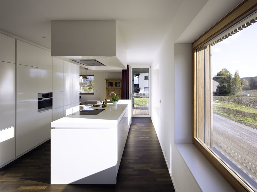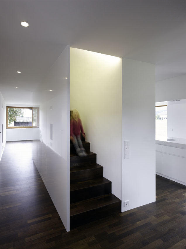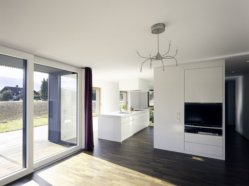 Die individuelle Entfaltung der vier heranwachsenden Kinder zwischen zehn und einem Jahr unterstützend, ist das Materialkonzept im Inneren des Hauses sehr schlicht gehalten und kommt mit nur wenigen, einfachen Materialien aus. In allen Wohnbereichen wurde Parkettboden in Räuchereiche verlegt, die Böden der Nasszellen sind dunkelgrau gefliesst. Während die raumhohen Fensterelemente in den Einschnitten im Weiss der verputzten Wände und Decken gehalten sind, zeigen die riesigen Lärchenholzfenster konsequent das Fassadenmaterial auch im Inneren des Hauses. Der klassische Innenausbau macht den ortsüblichen Massivbau spürbar, nur hier und da lässt sich die lebhafte Holzfassade beim Blick in die Landschaft erkennen. (Text: Architekt)
