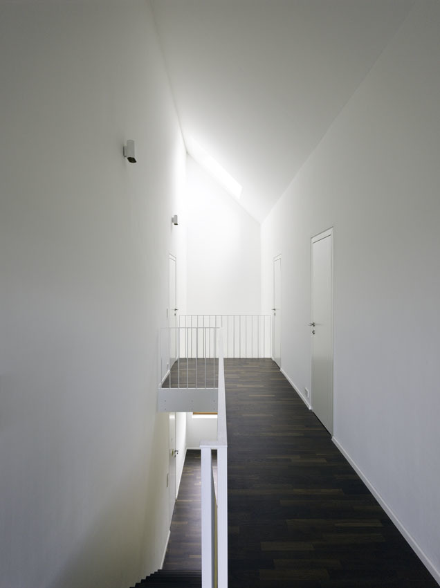 Die beiden Obergeschosse hingegen werden im Flurbereich über die offene Treppe und einen schier endlosen Luftraum, der sich bis hoch zum First erstreckt zusammengeschlossen. Die grosszügigen Flurbereiche schaffen Spiel- und Begegnungszonen mit unterschiedlichen Aufenthaltsqualitäten. Krönender Abschluss der vertikalen Erschliessung stellt die Loggia mit Blick auf den Millstätter See dar. Die sechs Zimmer werden von je einer grossen, gezielt gesetzten Fensteröffnung dominiert. Obwohl alle Fenster dieselbe Proportion haben, gleicht kein Raum dem anderen. Jedes Fenster fokussiert einen ganz speziellen Teil der Land- und Nachbarschaft, das Fenster wird zum Bilderrahmen.