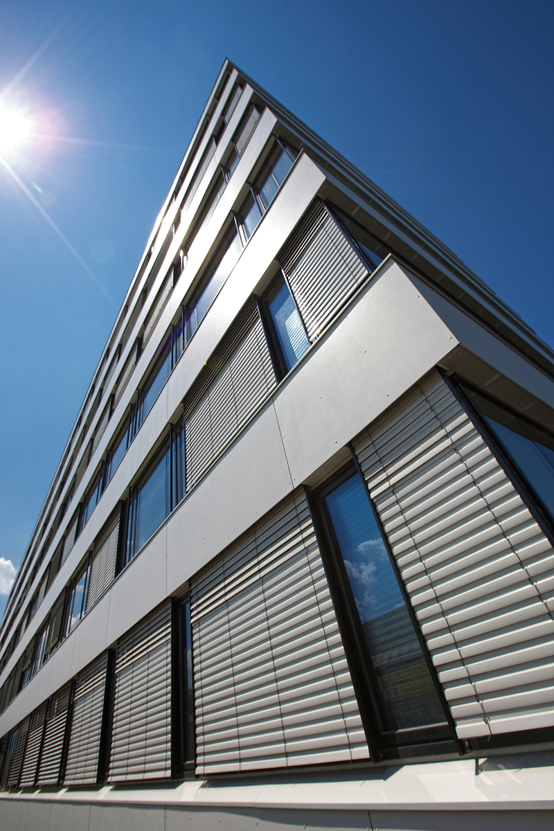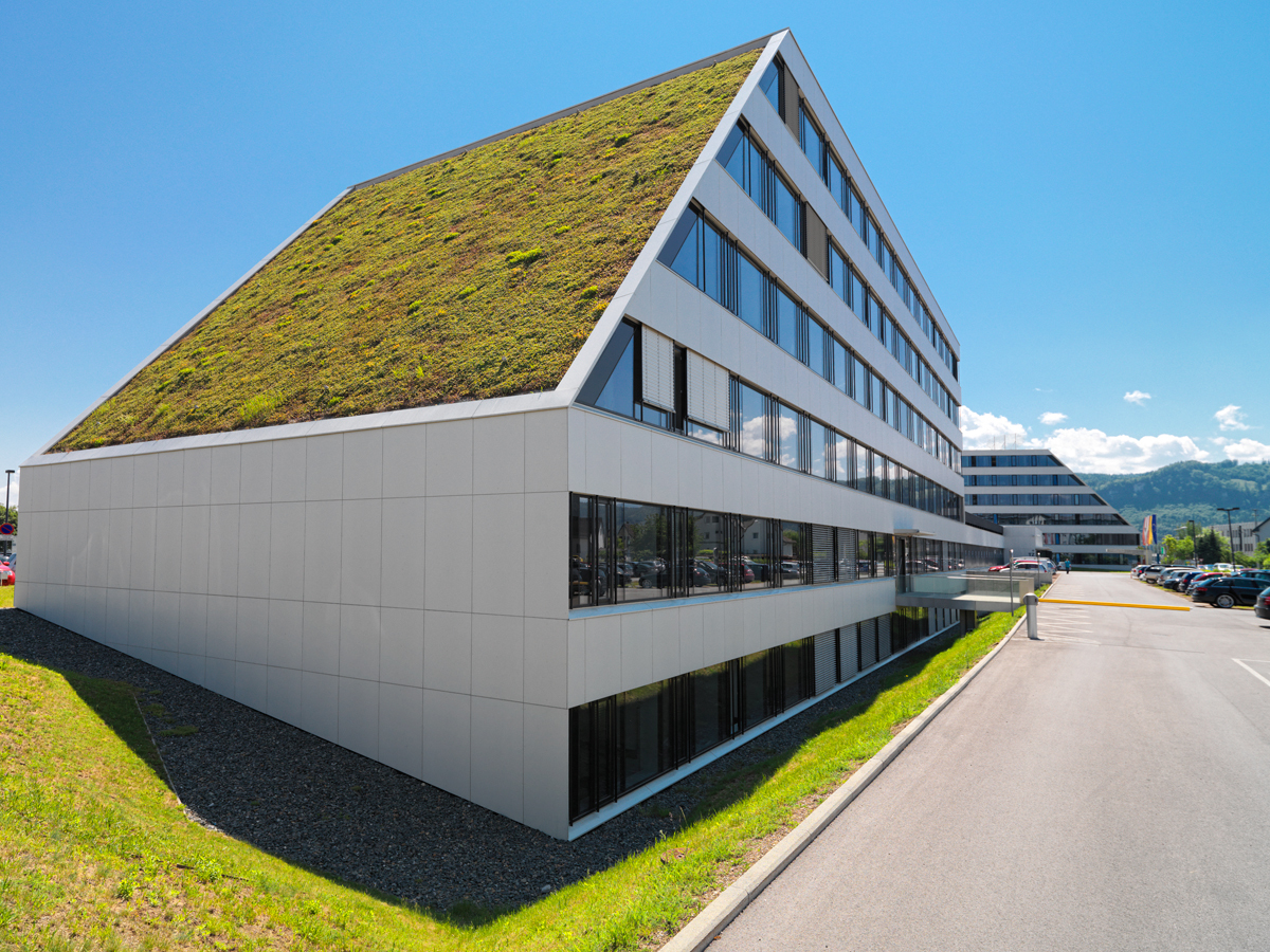 dominiert durch mäanderartig angelegten Sträucherreihen und fächerartig ausgebildeten Rasenflächen, einladend für den Behördenverkehr und Anrainer wirken. Sämtliche Dachflächen wurden extensiv begrünt.