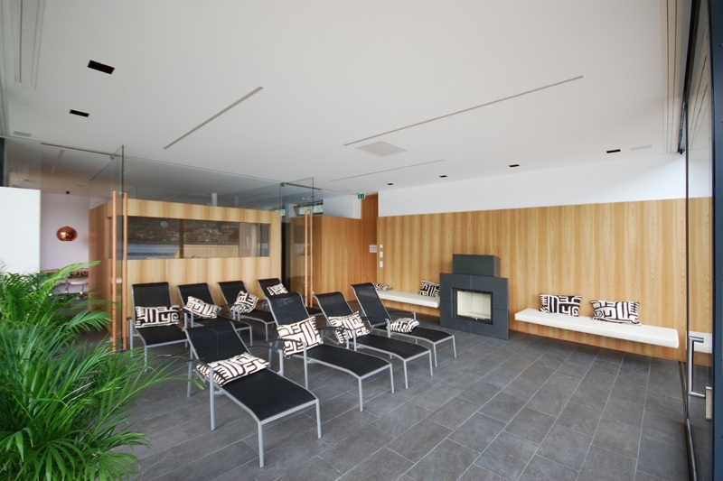 Von der Sauna bzw. dem Ruhebereich aus hat man den Blick über das Wasser des Pools zum See.